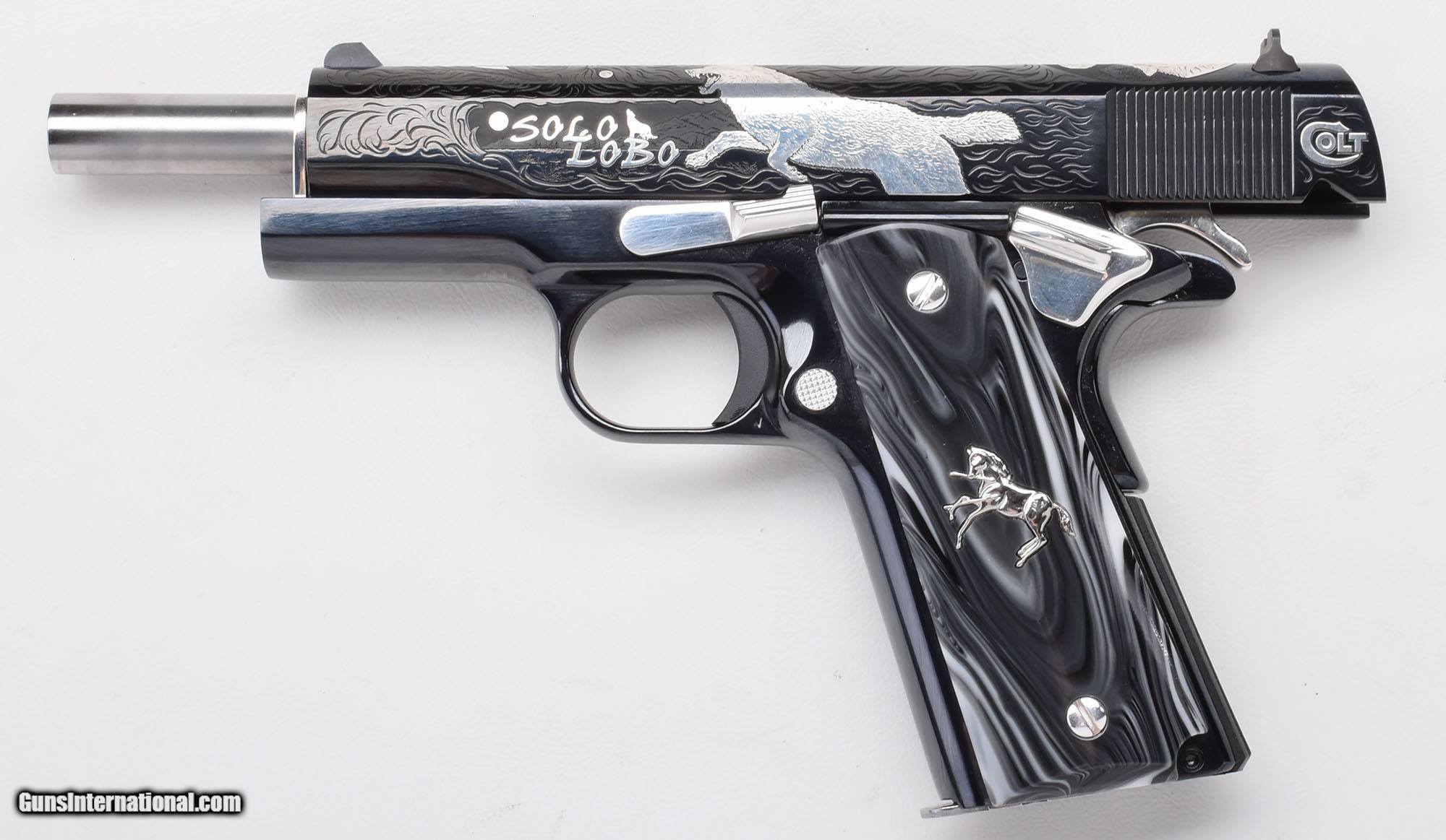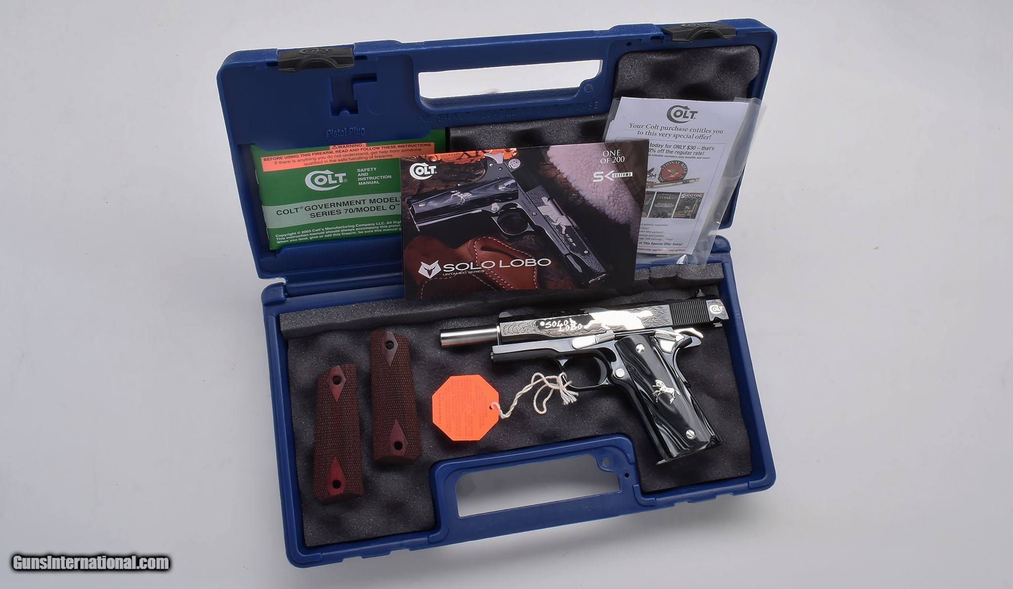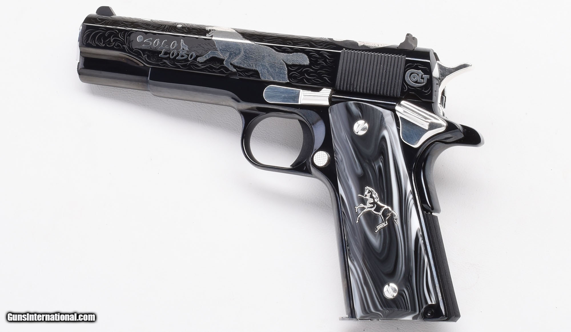 Description: Factory New in Box Colt Solo Lobo in .38 Super; #114 of 200. The "SOLO LOBO" is a limited-edition production run of only (200) 1911 Full-Size Government Models chambered in 38 Super, featuring a Colt royal blue polished finish on the slide and frame. The pistol is covered in .999 pure Silver, the Colt logo decorates the rear left panel, and the right is engraved with each gun's unique issued series number.The production comes complete with a set of black pearl Kirinite grips showing with the Silver Colt Rampart inserts. Includes factory box and 1 7RD magazine. SOLD Manufacturer: COLT Model: Solo Lobo Caliber Info: .38 Super Condition: Factory New Metal Condition: Excellent Bore Condition: NEW Barrel Type: Rifled Action: Single Action Auto Triggers: SAO Weight: 38.7 oz Sights: Fixed |