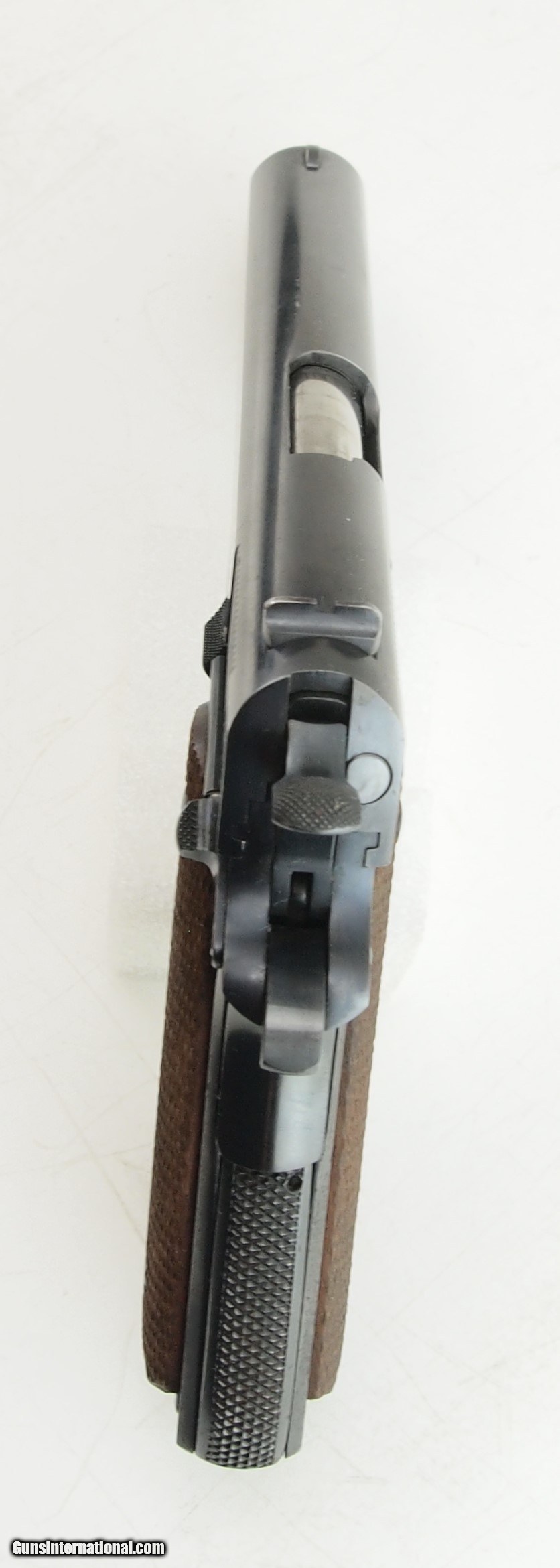 Description: Colt Super .38 Automatic Pistol Pre-War MFG 1930 .38 Super, 5" bbl, shiny bore, good rifling, blued finish, dovetail rear notch sight, blade front sight, very light handling marks, checkered hardwood grips, and one magazine. This pistol is identical to the Gov't model .45, except chambered for .38 Super. What a find for your collection! Add 3% for Credit Card Shipping $25.00 SOLD Curio/Relic: Yes |