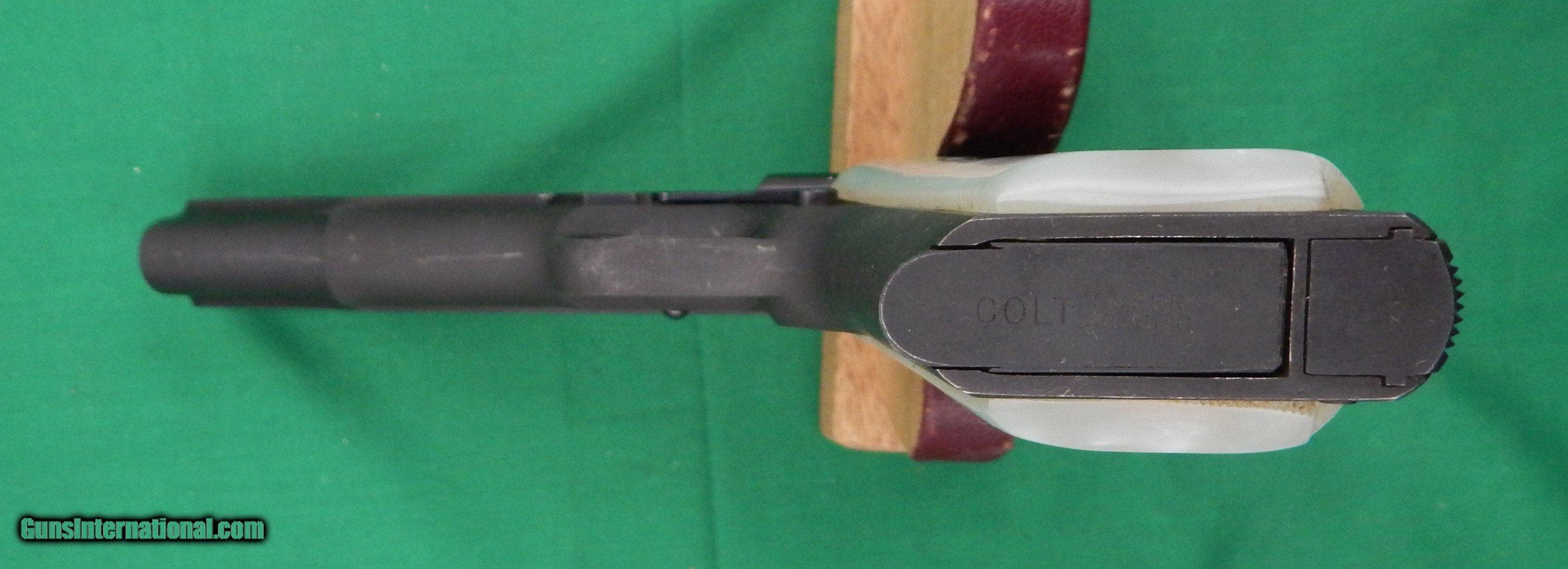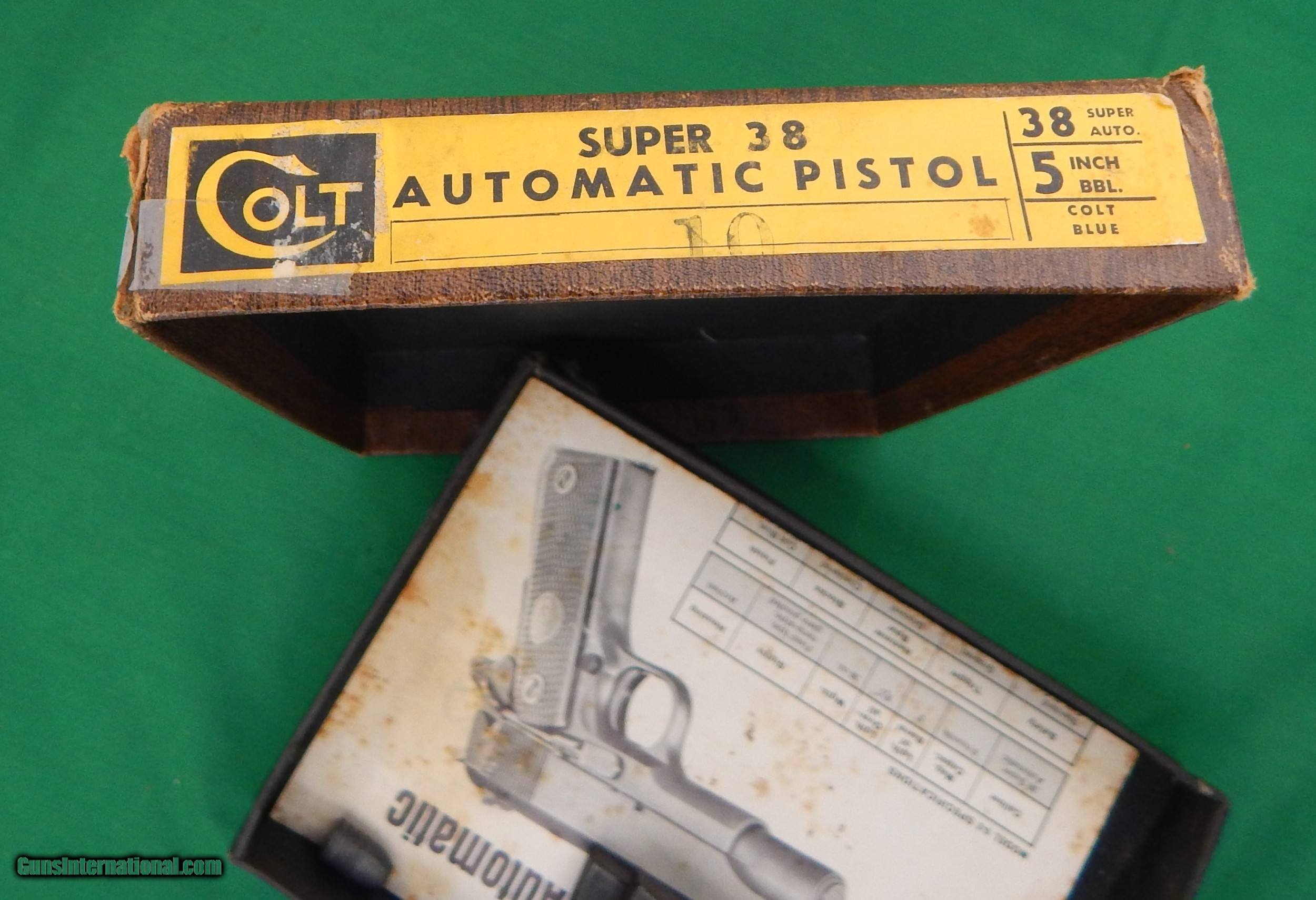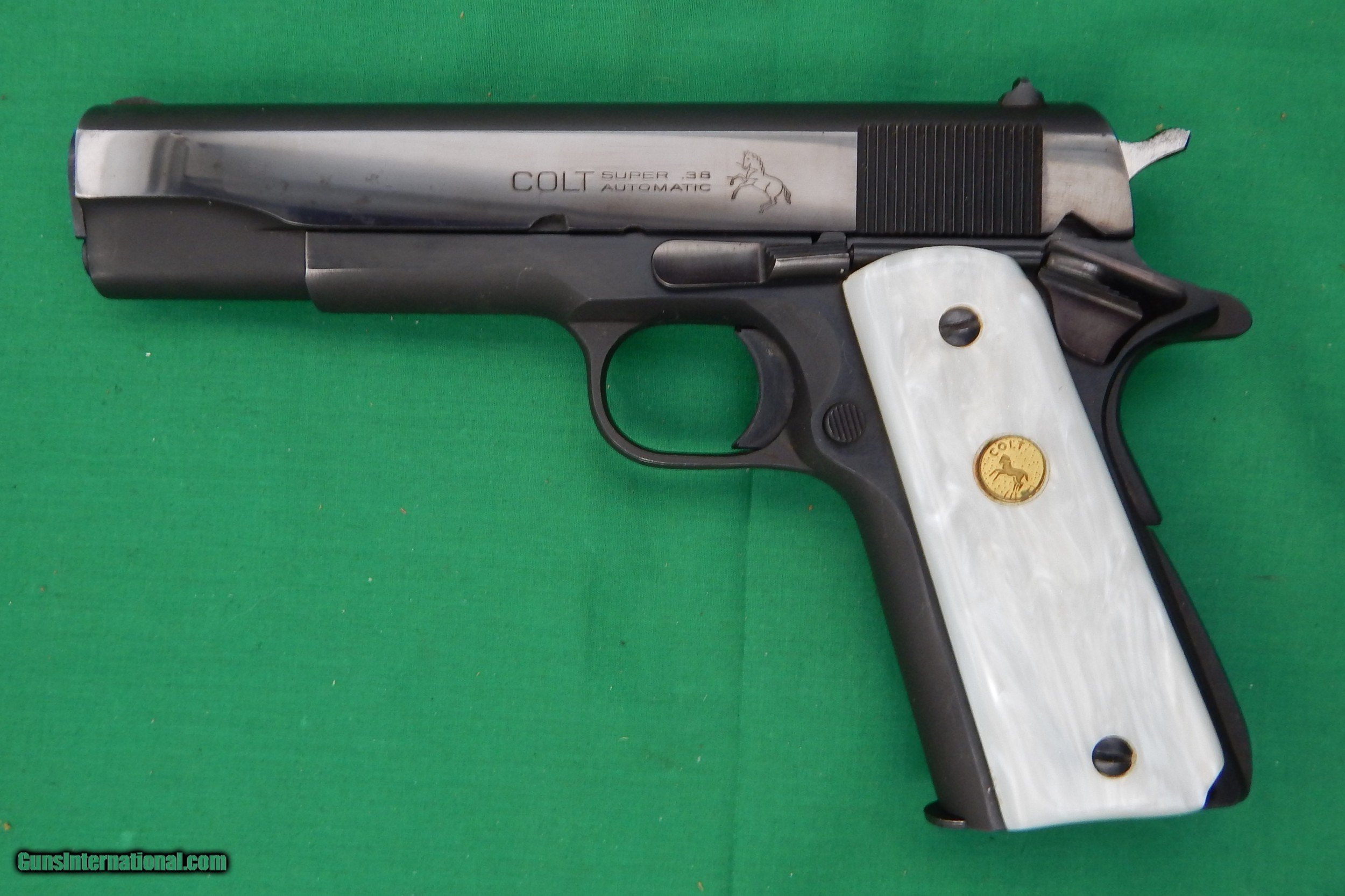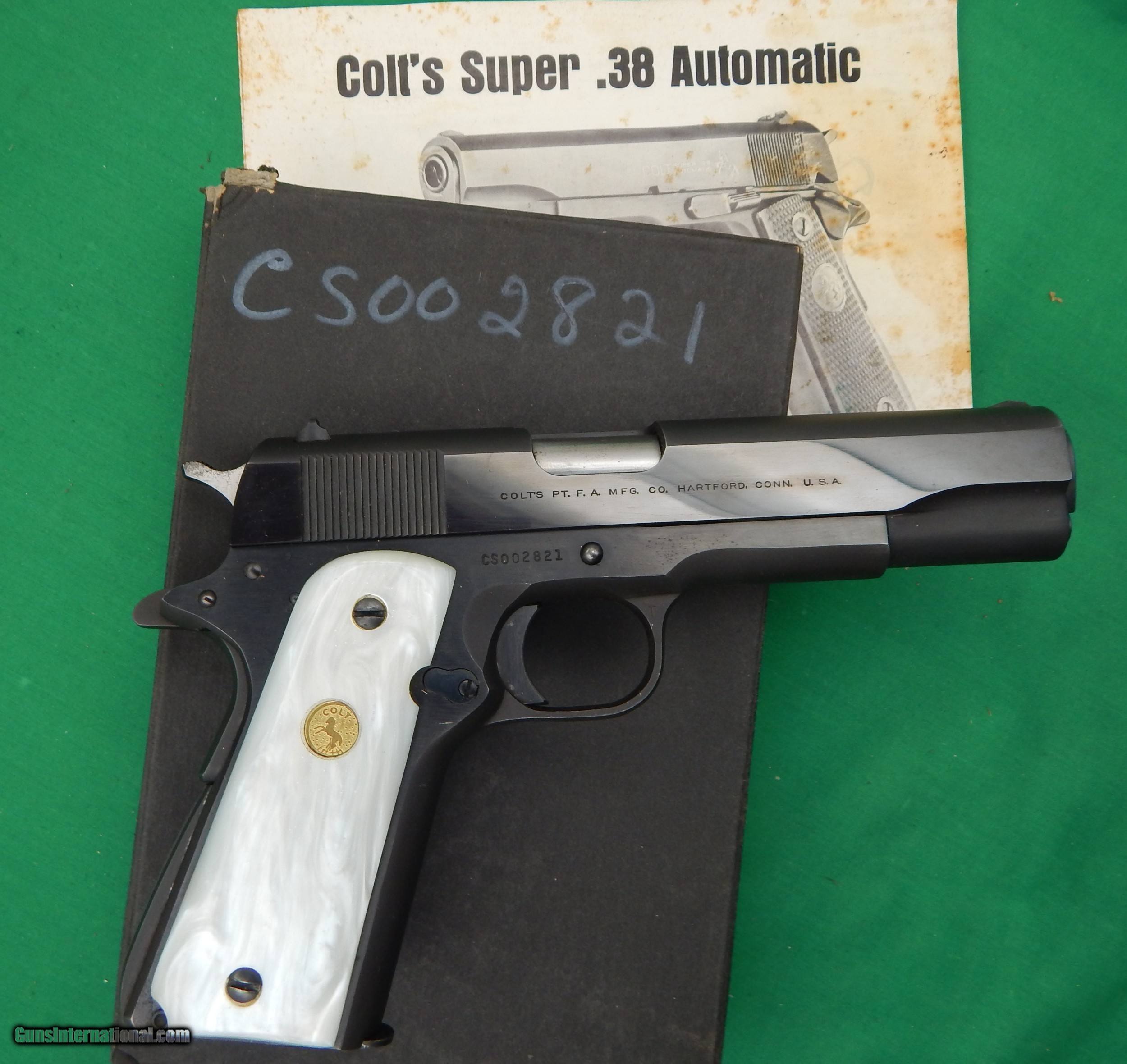 Description: Colt "Super .38 Auto", with the box and papers and three clips, clips are faintly stamped "COLT 38 Super Auto", papers are dated 1-69, Overall in excellant condition with 98% bright original finish. Combination of Bright and Matt finish. Beautiful Pearl; like grips with the Gold Colt Medallion. FREE Shipping. MO plus FFL required. SOLD Handgun Caliber: .38 Super Auto |