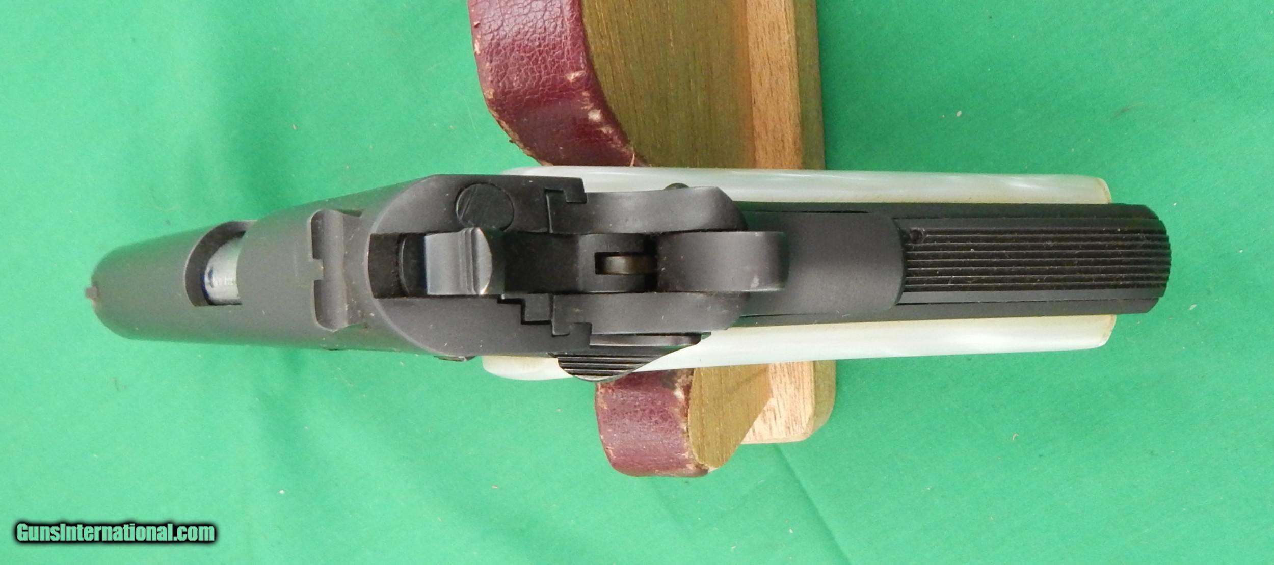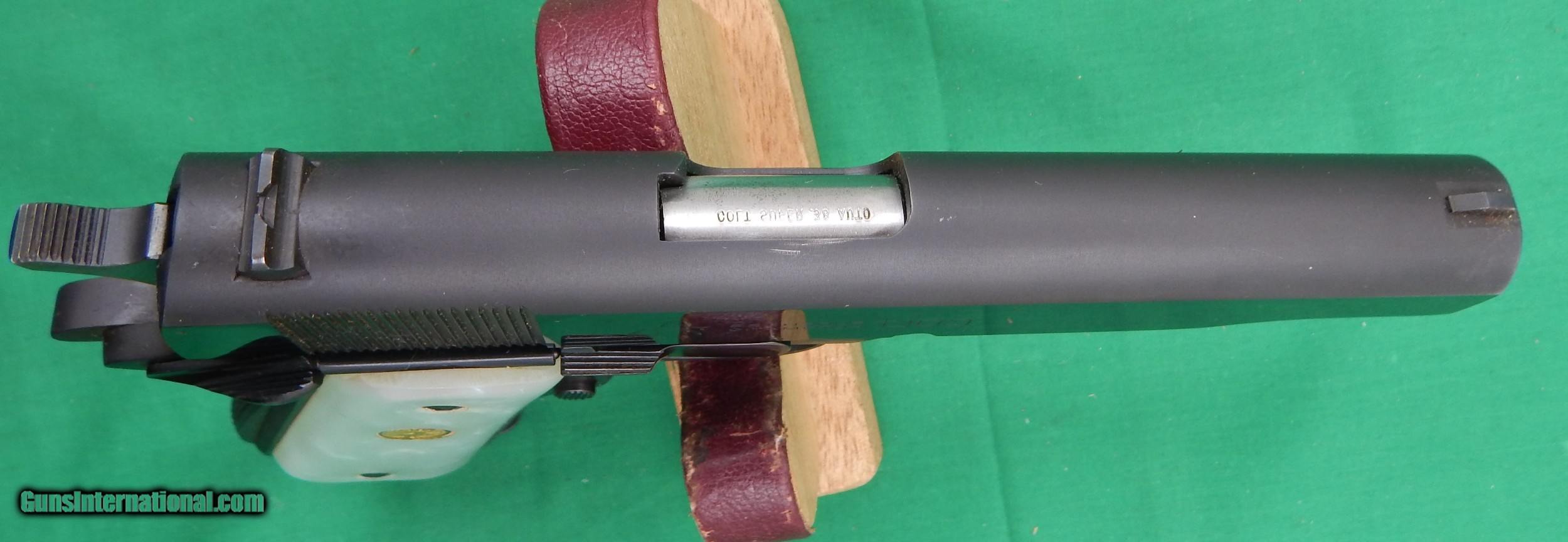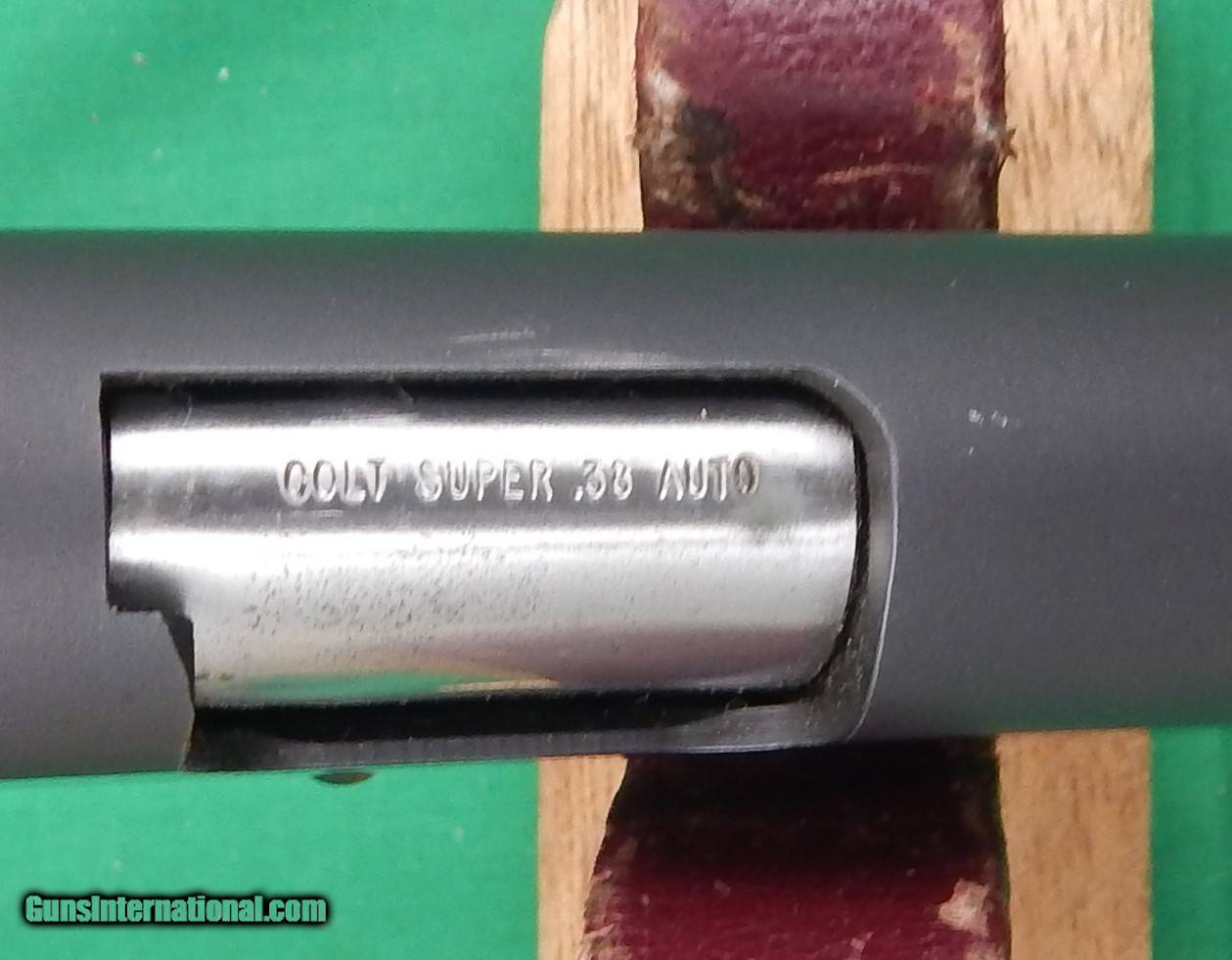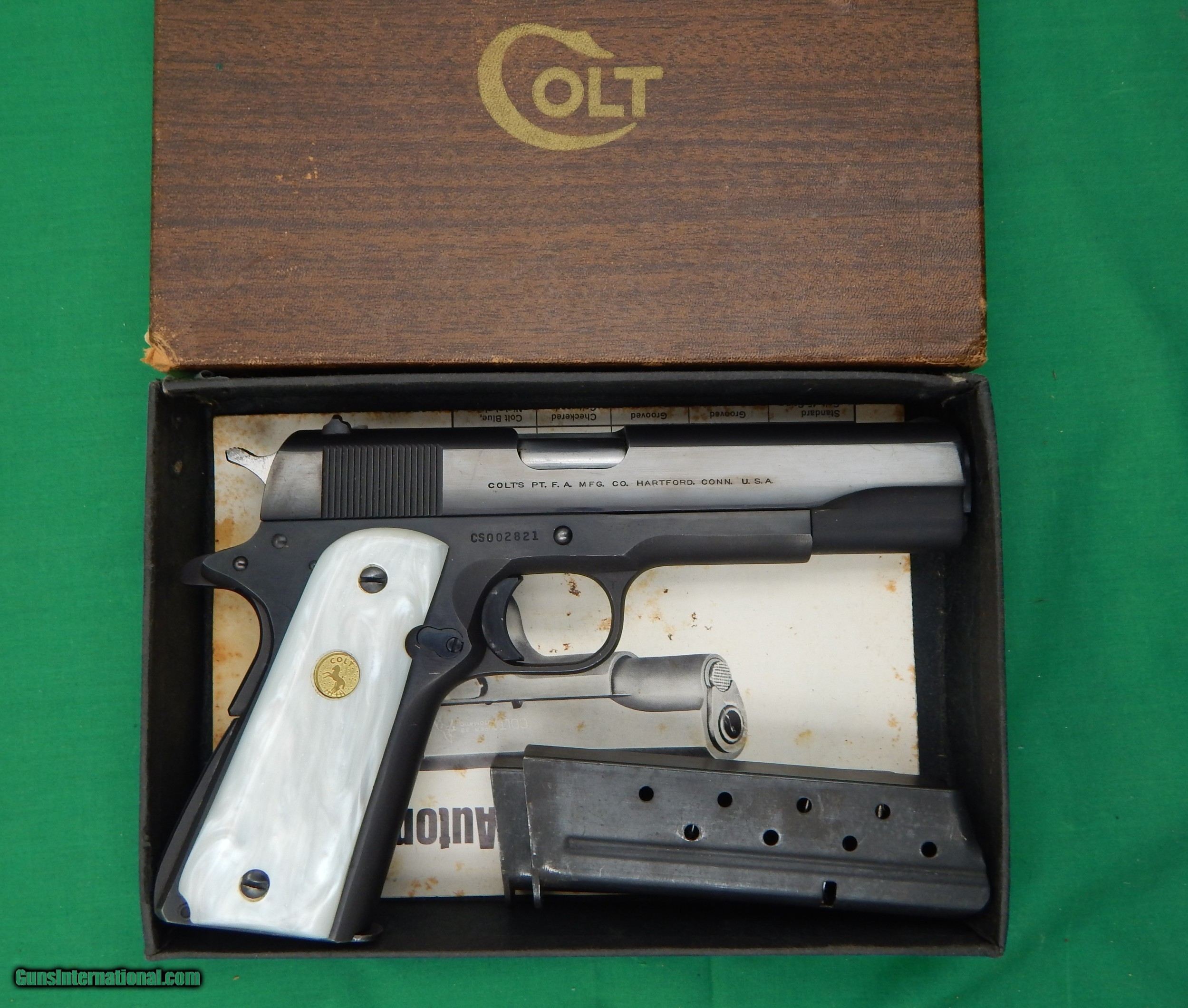 Description: Colt "Super .38 Auto", with the box and papers and three clips, clips are faintly stamped "COLT 38 Super Auto", papers are dated 1-69, Overall in excellant condition with 98% bright original finish. Combination of Bright and Matt finish. Beautiful Pearl; like grips with the Gold Colt Medallion. FREE Shipping. MO plus FFL required. SOLD Handgun Caliber: .38 Super Auto |
