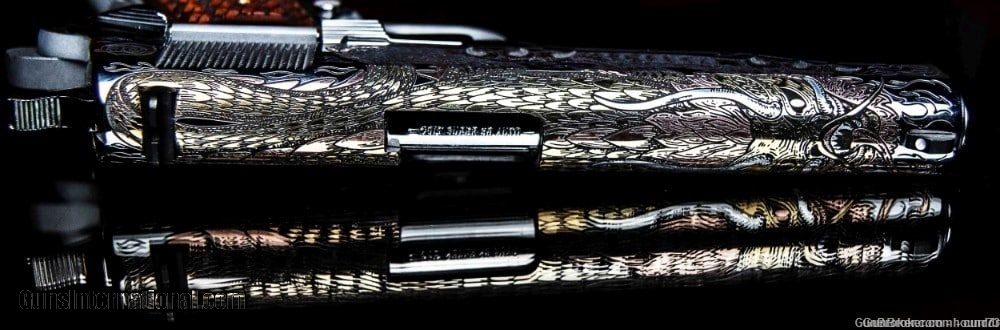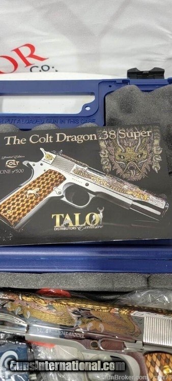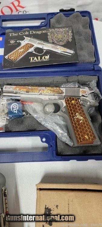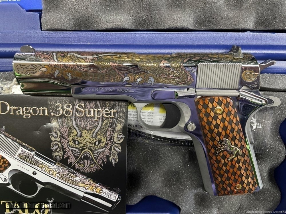 Description: Guns Listing ID: 714813 Incredible Collector Piece Unfired New Old Stock Colt 1911 TALO Government Model Dragon Model .38 super (1 of 500) Rare 2019 vintage New in the box Colt Dragon .38 Super O2091MEX pistol Serial number MEX229 one of 500. Extensive embellishment has been done to the dragon. The Stainless slides and frame are initially polished. The intricate Dragon design is selectively plated with 24K Gold, Copper, and Silver and highlighted with deep etched black lines. The barrel is polished at the chamber to compliment the slide finish. The hammer, slide stop, barrel bushing, thumb safety, and mag release are all high polished. The Hex screws are polished and coated in 24K Gold. Grips are an alternating dragon scale pattern with an embedded gold rampant Colt medallion. SOLD Manufacturer: COLT Model: Talo Dragon .38 Super Government Model Caliber Info: 38 SUPER Condition: Used - Non-Certified Barrels: 5 BARREL Finish: CHROME |