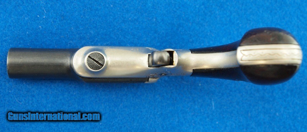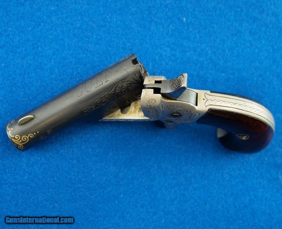 Description: Colt Thuer Derringer (3rd Model) MFG 1875 - 1912 .41 RF, 2 1/2" side pivoting engraved bbl, shiny bore, good rifling, blued finish, blade front sight, top of the barrel is stamped with "– COLT –", engraved frame, S/N 1377, and smooth hardwood grips. Add 3% for Credit card Shipping $35.00 SOLD Curio/Relic: Yes |