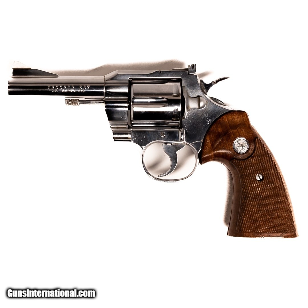Description: Guns Listing ID: 733506 The Colt Trooper is a legendary lawman sidearm. This version has a nickel finish with a 4” barrel. If you’re looking for a fantastic collector piece that shoots well too, this is a great option. A right hand OWB holster included. Serial number: 71240 = MFG: 1968. Get the best bang for your buck when you get a Certified Used Firearm . When you see the Certified Used stamp on any of our firearms, you can be confident that you’re getting exactly what you want – a gun only in very good to excellent condition and held to the highest quality standard. All Certified Used Guns come with a ‘no questions asked’ return policy . PLUS, ALL CERTIFIED USED GUNS SHIP FREE! SOLD Manufacturer: COLT Model: TROOPER .357 Caliber Info: .357 MAG Condition: Used - Certified Barrels: 4 barrel Finish: STAINLESS |
