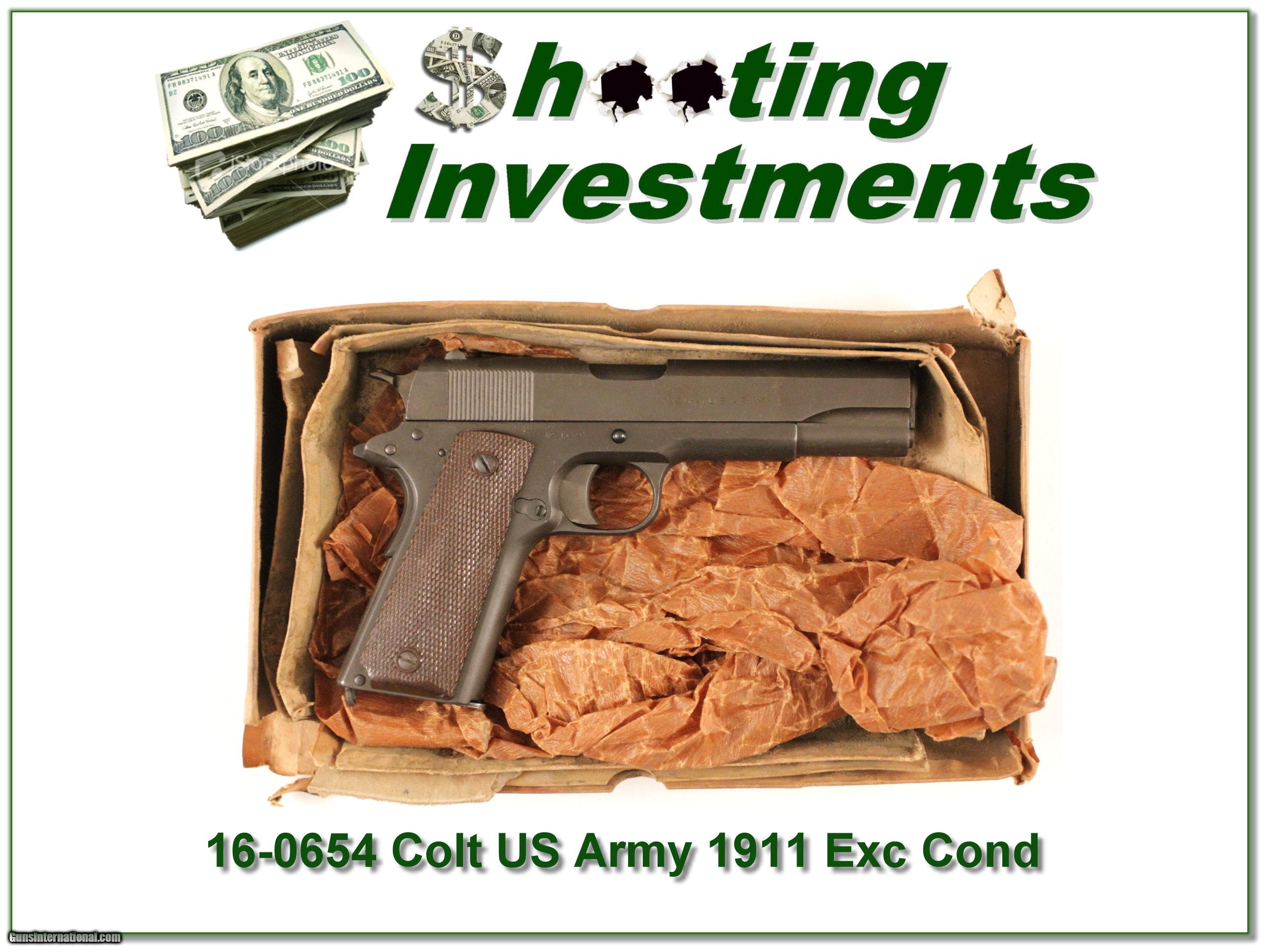 Description: This is a 1918 made 1911 Colt. It is in excellent condition. I am not a Colt expert but believe this one has been parkerized as seen. All letting is sharp and bore is bright. It comes in an original box but it is not numbered to gun. I am selling this for an estate and as such lay-a-way can’t be used. It does of course have the standard 3 day inspection. Shipping and insurance is $35. Please email me with any questions or larger pictures. (I now consign quality firearms only 10%! Let me know if you have any you would like to sell!) [16-0654] Payment: Payment is by Money Order, Cashiers Check or Personal Check. I can now also accept MasterCard and Visa with a 3% convenience fee. PayPal can be used for some items but never firearms. Please let us know if you would like to pay via PayPal. Shipping: The shipping charge will be listed in each description. It is $35 for most guns. Some heavy guns or those insured for over $2000 will be higher. Shipments to Alaska and Hawaii are higher because air shipment is required. Most firearms are shipped within 5 days of receipt of payment. We prefer shipping at the beginning of the week to avoid firearms in transit over weekends. We package all shipments carefully and insure them for the full purchase price, rounded up to the next $100. In the unlikely event that damage occurs, it is important that you save all packaging material for the claims process. Optics are shipped Priority Mail and most other non-firearm shipments are shipped First Class. Returns: Our return policy is simple. If for any reason you are not pleased with your purchase, you may return your item for a refund. The only exception is ammunition, it cannot be returned. It is important to us that you are happy. Guns cannot be fired or dissembled before returning them and must be returned in the same condition as received. Notification of a return must occur with-in 3 days of receipt at your dealer. Shipping, convenience and dealer fees are not refundable and are the responsibility of the buyer. Lay-a-way: If needed, we offer a 60 day lay-a-way option on most firearms. It is 1/3 now, 1/3 in 30 days and 1/3 in 60 days. Lay-a-way firearm sales are final. Consigning your firearms with Shooting Investments: We will help you get top dollar for your firearms. While most local guns shops charge 20% or more, our fee is only 10% with a minimum of $50. At your local gun shop it might take months to sell. Selling on-line provides instant access to thousands of interested buyers. You won’t find any other on-line dealer willing to sell your firearms for only 10% or listing every gun on 4 separate s. Selling through an House typically costs the seller 15% and the buyer an addition 15% (so 30%) and you have to wait several months to sell and longer to receive funds. If properly priced, we will sell your firearms in a week or two. Send us an email or give us a call and we’ll explain how easy it is for you to get top dollar. Trading: We collect guns and usually just trade for guns we want to add to our collections. We often sell guns for others wanting to purchase one of ours. We find this the most fair to both of us. Our Commission is only 10% and we hold the gun you want until yours sells. Please contact us if you want to sell one of yours to buy one of ours. Help for California Buyers: We are happy to ship to California. It is the buyer’s responsibility to make sure any item you buy is legal in your state. We are also happy to help with your purchase of a firearm from someone other than us. If you see a gun you would like to buy but the seller can’t or won’t ship to California we can help. You buy the gun and have it shipped to us. We’ll then ship it to your California dealer. The cost for this service is only $30 + shipping. Let me know if we can help! SOLD |