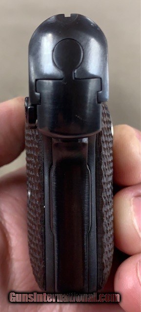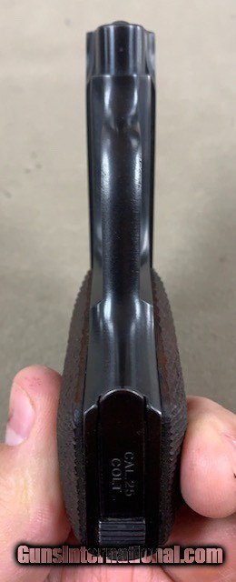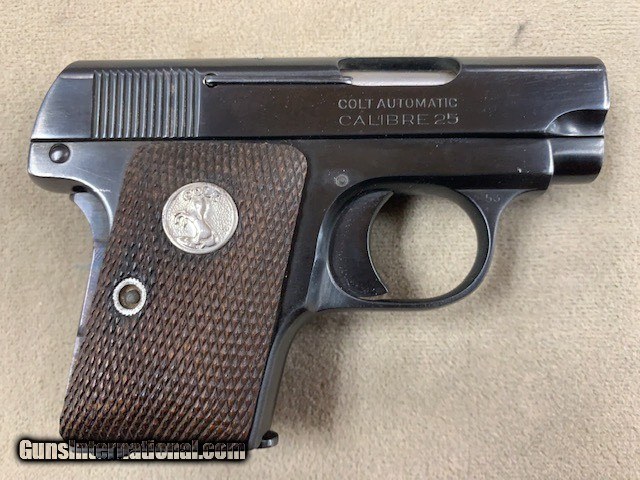 Description: This is one of the last production Colt Vest Pocket .25 Auto Pistols manufactuered (production of this model ceased with the advent of world war II), with the later style checkered walnut grips with Colt medallions. Colt records show it was produced in 1940. Pistol remains in just about new condition, and it makes one wonder if it didn't spend its life in a desk drawer. Has the original Colt marked magazine. Consition shown in photos - a wonderful little pre war Colt semi auto pistol. SOLD Curio/Relic: Yes Handgun Caliber: .25 ACP (6.35mm Browning, 6.35×16mmSR) |