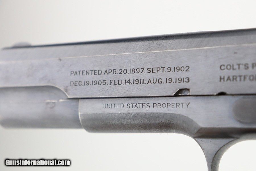 Description: This is an excellent example of an original Colt M1911 that was issued to the US Army in 1918. Terrific profile view with only minor high edge wear, but the majority of the finish loss is on the front strap. Correct barrel with vertical and disconnected 'P' & 'H' markings. Terrific wood grips. Original two-tone mag is worn. Bore shows some frost and freckling throughout, and rifling is somewhat worn. SOLD Curio/Relic: Yes Handgun Caliber: .45 ACP (.45 Auto) |