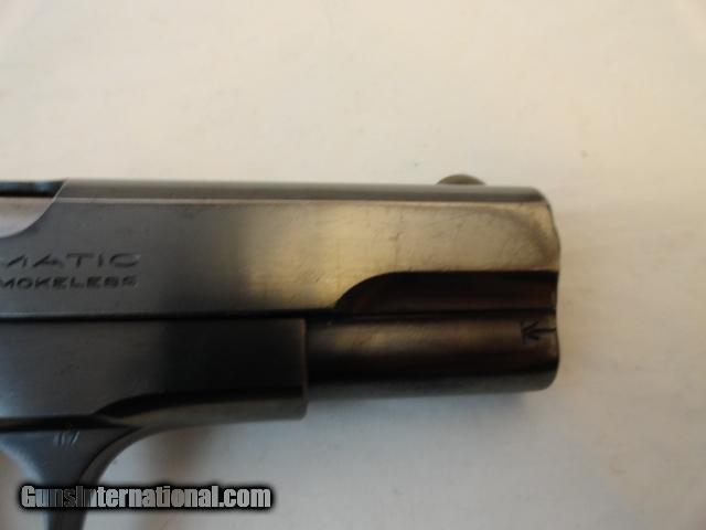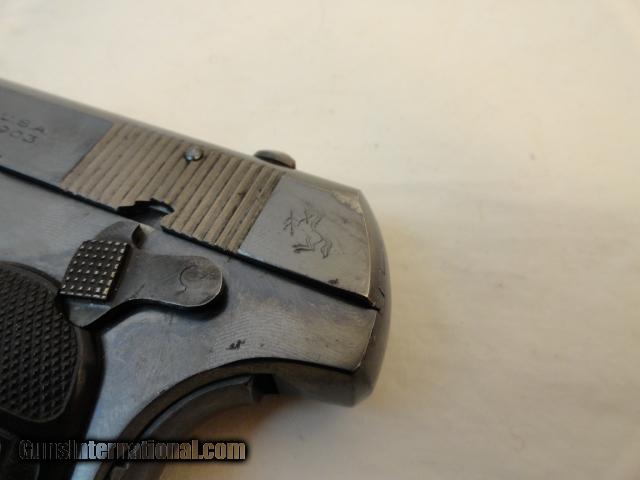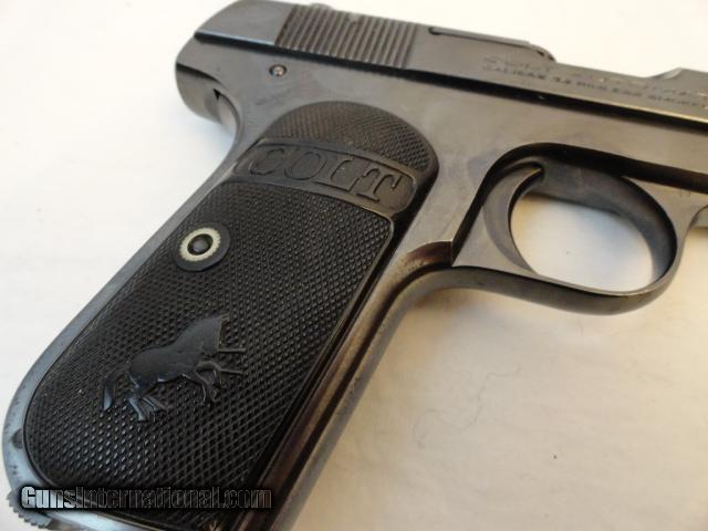 Here is an exceptionally nice condition pocket hammerless .32 automatic. Gun retains at least 95% original high polish blue. Just a hint of high edge wear on end of muzzle and back of slide. The front grip strap even retains all of the original blue. Backstrap has a bit of toning. Original marked Colt clip. Fine little gun.