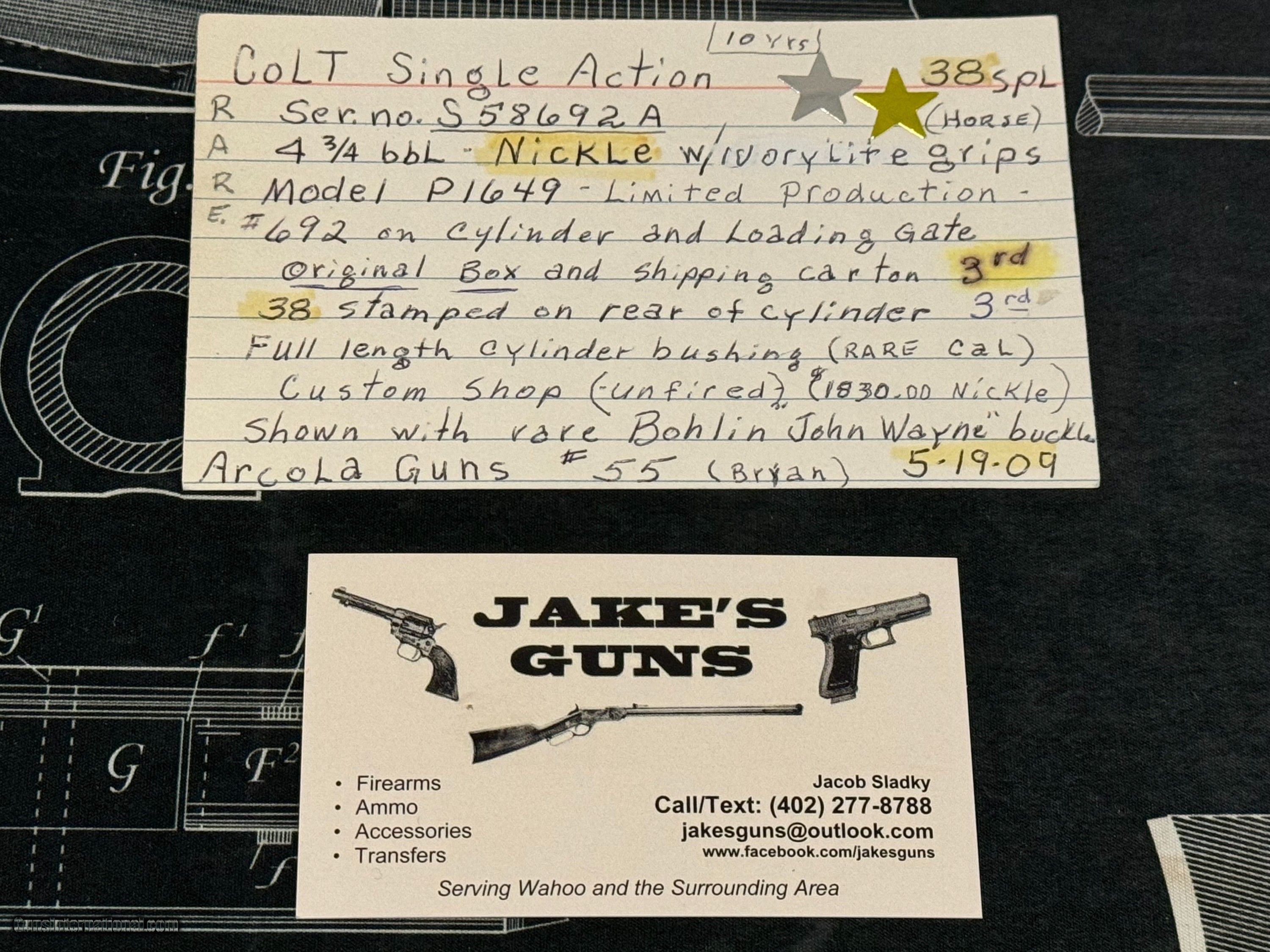 Description: For sale is a gorgeous NIB Nickel Colt SAA chambered in .38spl from the Colt Custom Shop with the original box, sleeve with end label, and even a collector's note from the original owner! Comes with an extra set of white grips and all the accessories from the factory. You will not be disappointed with this one, collector and investment quality! Gun will be wrapped separately to preserve it in shipping! Shipping is a flat $65 for priority mail with insurance included to lower 48, carefully packaged and cared for! 5 DAY INSPECTION PERIOD! 4.5% Credit Card Fee If you have any questions or concerns please let me know! Keep an eye on my upcoming s, lots of nice collectible and investment grade firearms from a local estate! SOLD Handgun Caliber: .38 Special Manufacturer: Colt Model: Single Action |