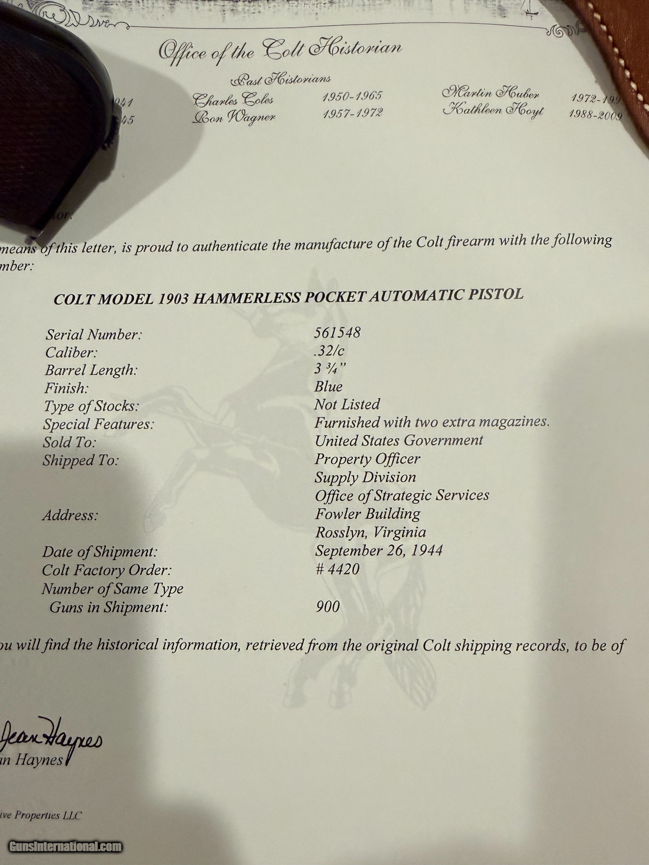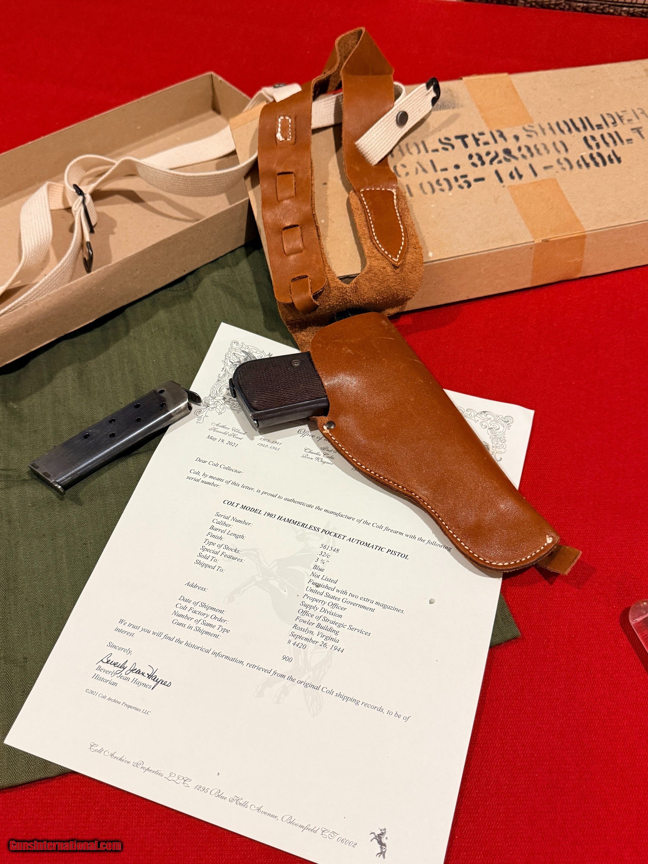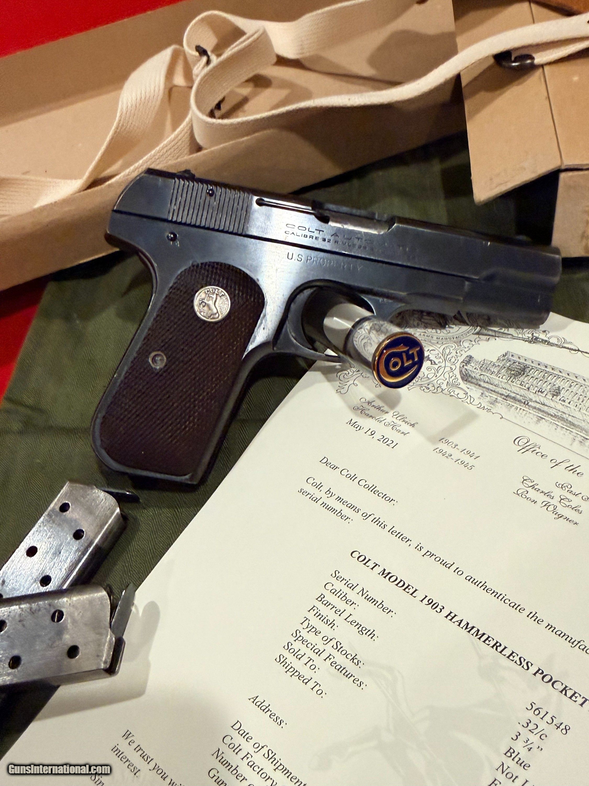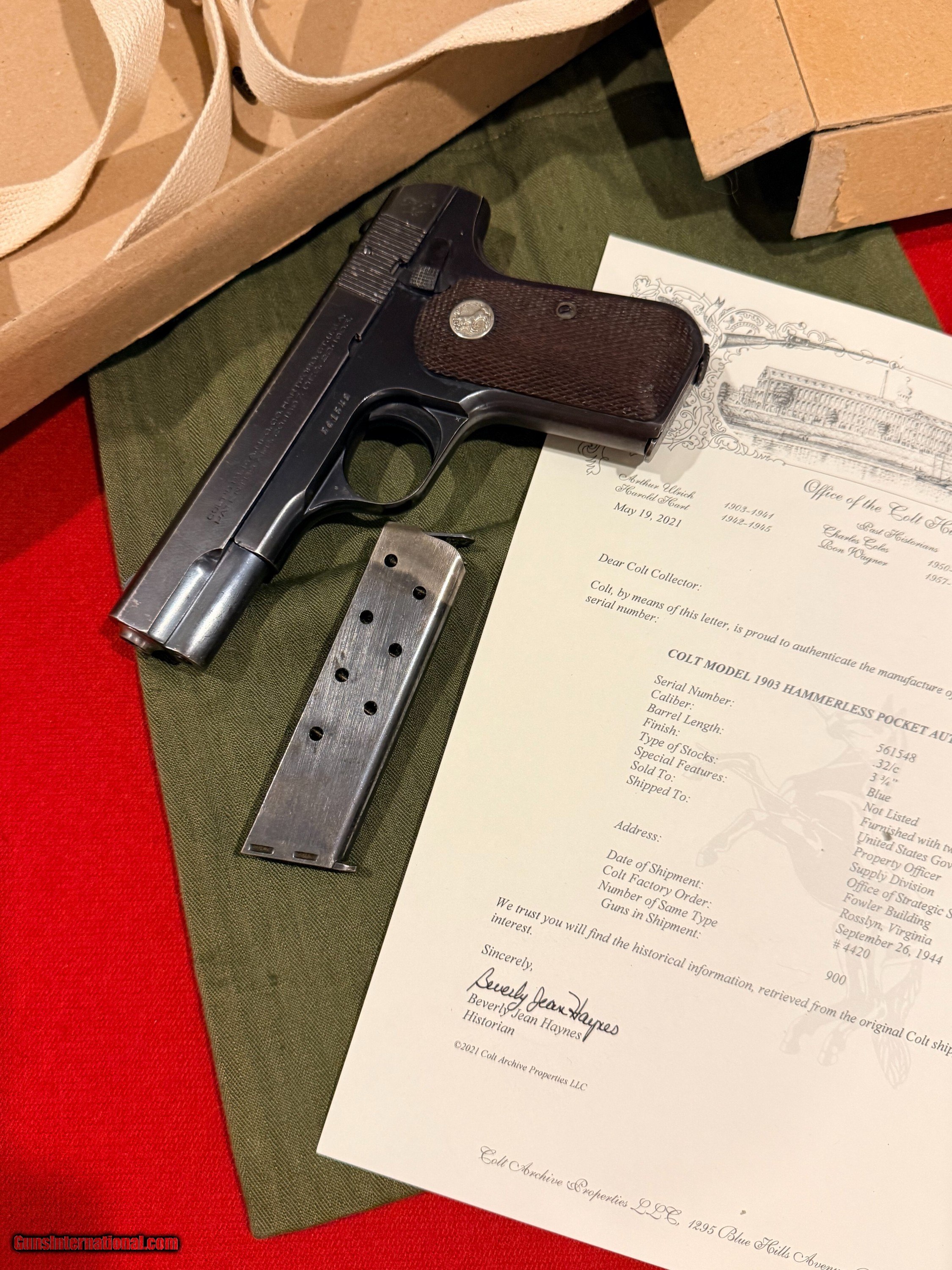 Description: OSS Issued U.S. Colt Model 1903 Hammerless Pistol, Covert Sidearm of America's Wartime Spies. Serial no. 561548, 3 3/4-inch barrel, .32 caliber. Blued finish with checkered wood grips with Rampant Colt medallions. Right side of frame reads U.S. PROPERTY. Left side with serial number. Accompanying the gun is 2 two-tone period correct magazines. Also included is the factory cardboard box containing its shoulder holster. Box marked HOLSTER, SHOULDER / CAL. 32 & 380 COLT / 1095 - 141-9494. Red Cross labeled olive drab green pouch present [as found with gun]. According to the accompanying Colt factory letter, this Model 1903 Pistol, was one of 900 pistols shipped to the United States Government on September 26, 1944. The shipment was directed to the Property Officer, Supply Division, Office of Strategic Services (OSS), at the Fowler Building in Rosslyn, Virginia, under Colt Factory Order No. 4420. The pistol was furnished with 1 extra magazine and blue finish. This documentation confirms its direct association with the OSS, the World War II predecessor to the CIA, making it a historically significant wartime-issued sidearm. Interesting to note, although there is no conclusive evidence tying this particular serial number to a unit or theater, pistols from the same shipment, only a few serial numbers away, have been documented in late-war Far East service, suggesting this example may also have traveled with OSS operatives in the closing months of the war. Condition: Fine to excellent, gun retains most original bluing with minor thinning and spots from storage. Action good, bore strong. Holster with little use evident, just storage and minor handling; outer box with scuffs and separations to ends. This Colt retains an appearance and condition seldom found outside of advanced collections. Please call or text Guy McRee at 972-670-8562 Curio/Relic: Yes Handgun Caliber: .32 ACP (7.65x17mm Browning SR) Manufacturer: Colt Model: 1903 Hammerless Serial Number: 561548 Price: $12,600.00 Shipping: $100.00 Pay with