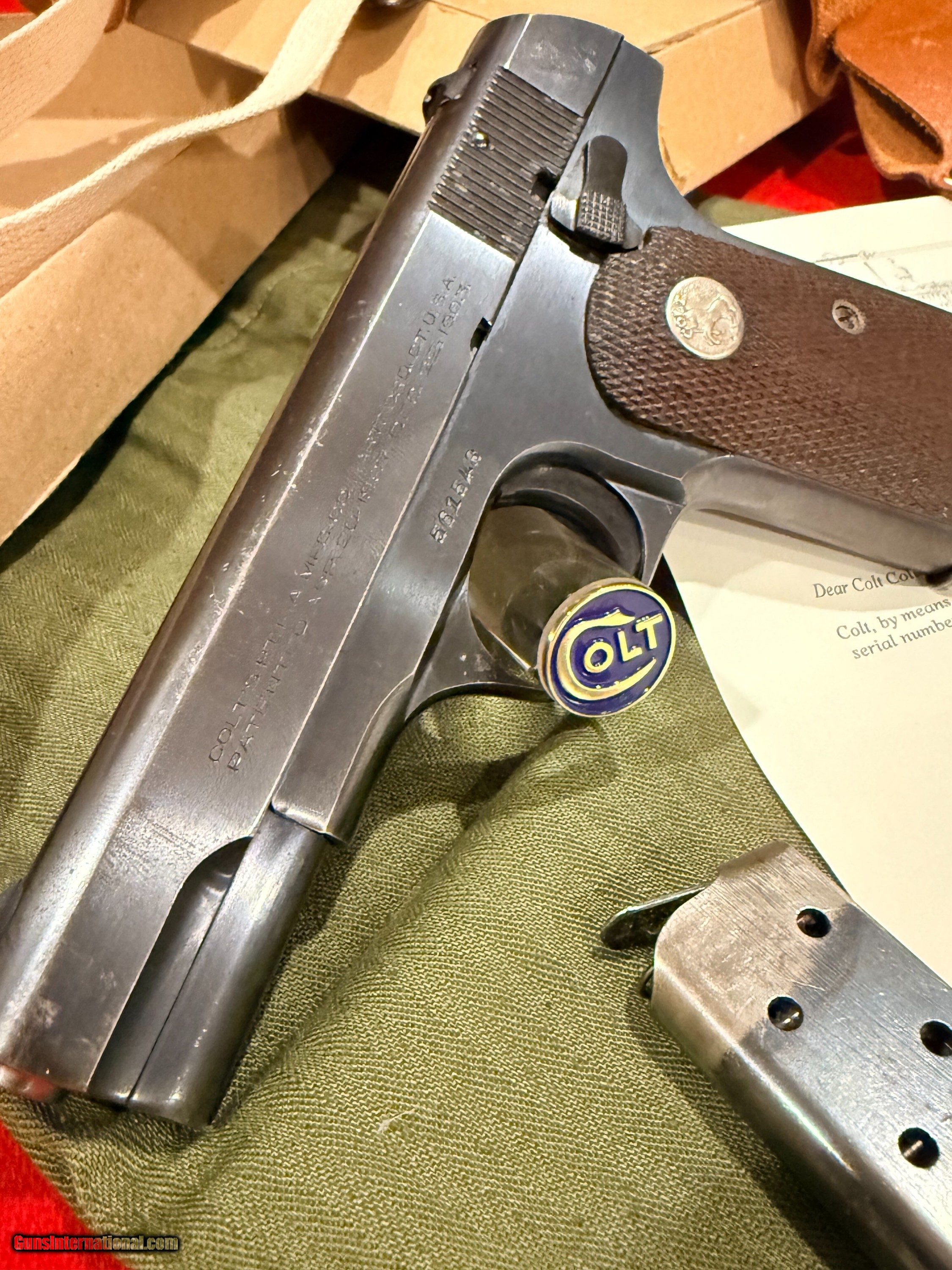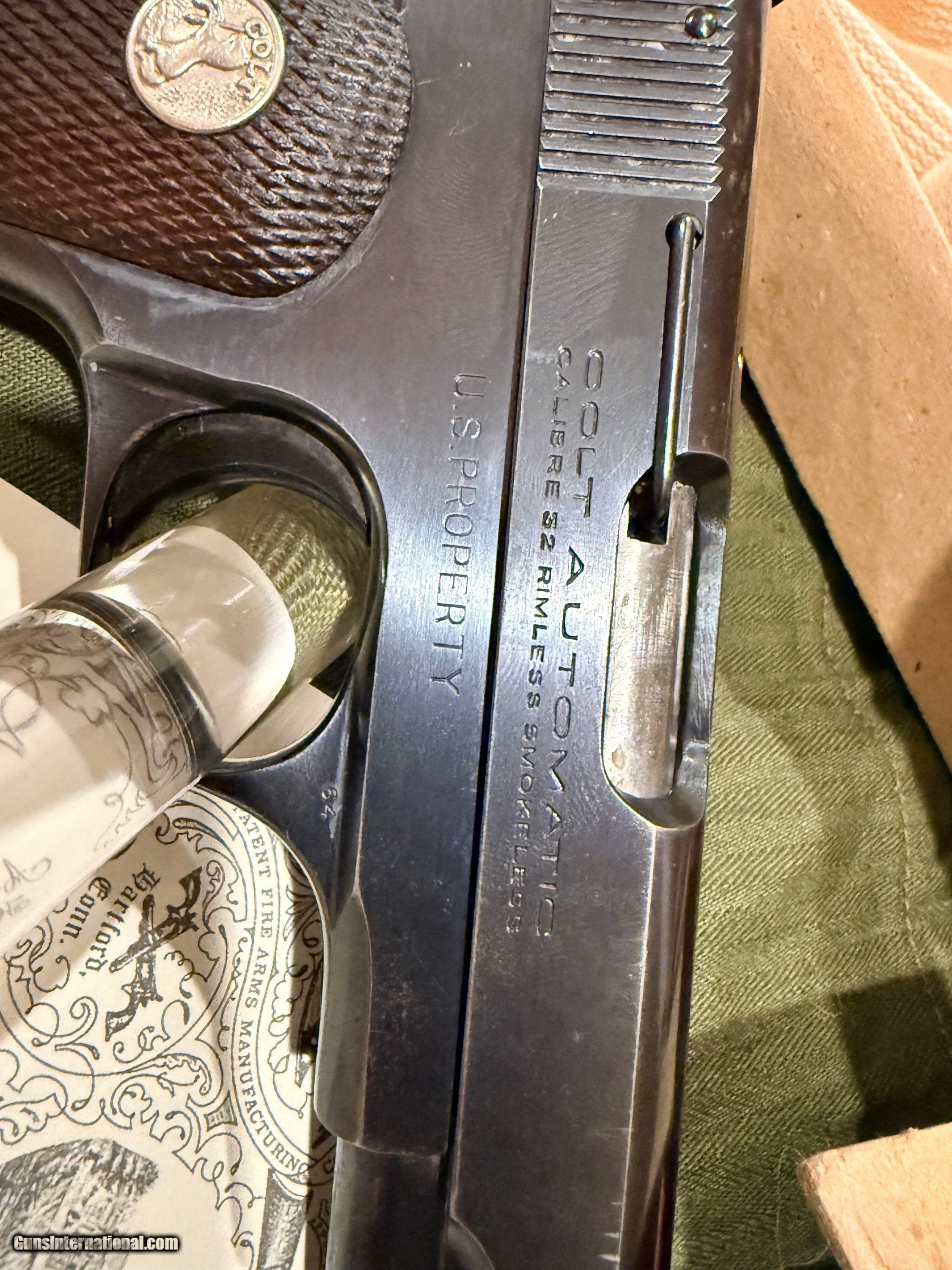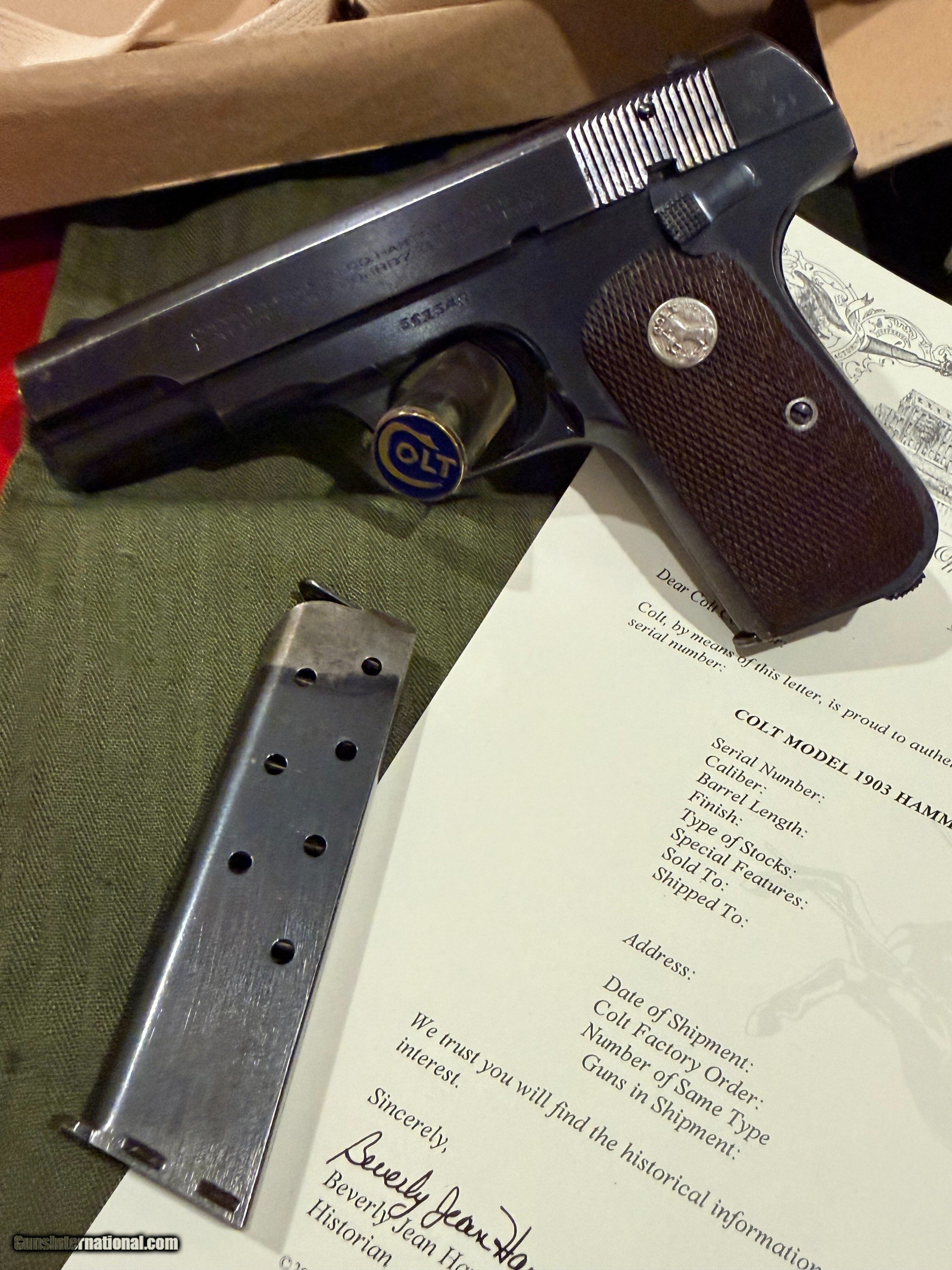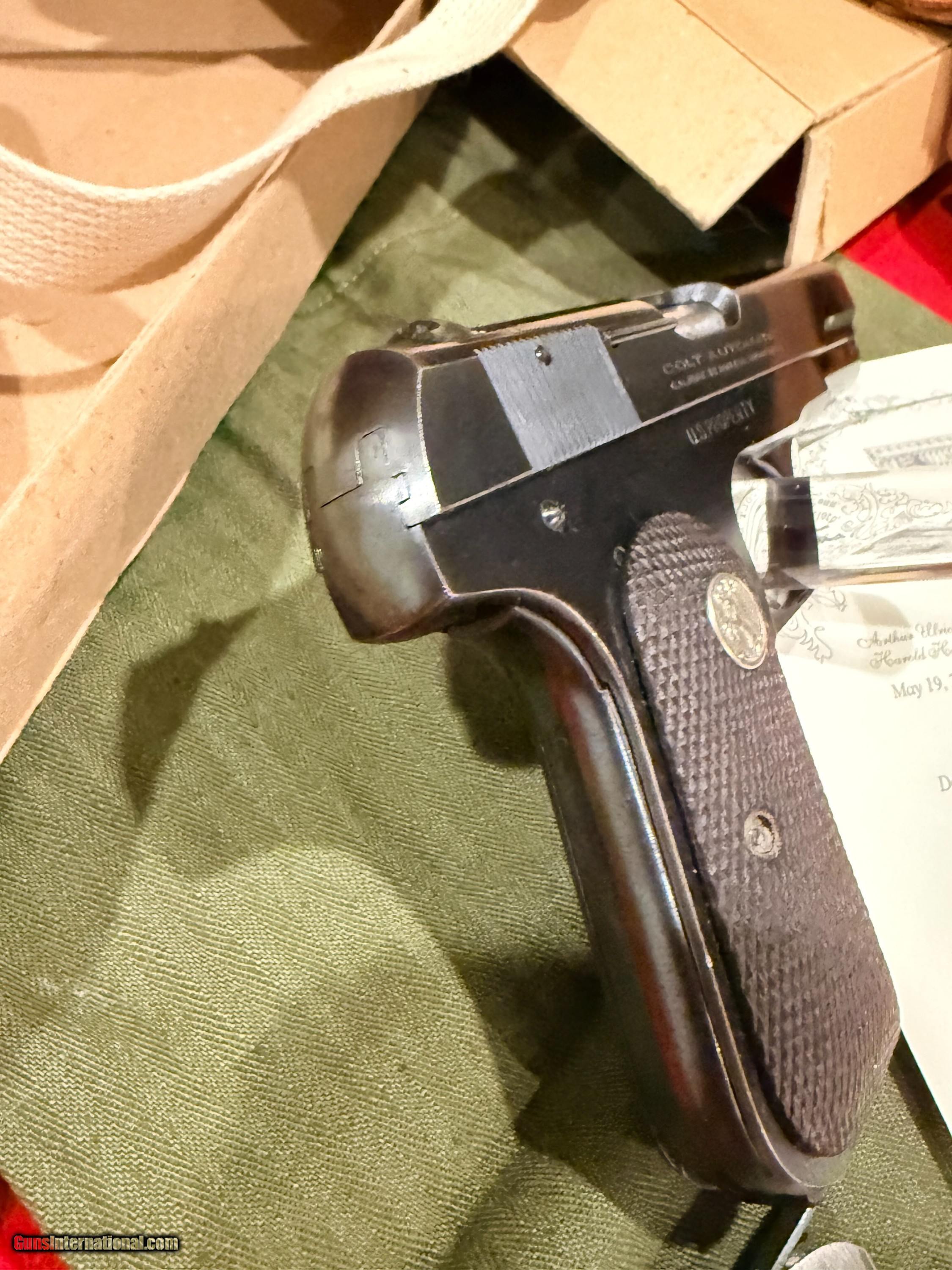 Description: OSS Issued U.S. Colt Model 1903 Hammerless Pistol, Covert Sidearm of America's Wartime Spies. Serial no. 561548, 3 3/4-inch barrel, .32 caliber. Blued finish with checkered wood grips with Rampant Colt medallions. Right side of frame reads U.S. PROPERTY. Left side with serial number. Accompanying the gun is 2 two-tone period correct magazines. Also included is the factory cardboard box containing its shoulder holster. Box marked HOLSTER, SHOULDER / CAL. 32 & 380 COLT / 1095 - 141-9494. Red Cross labeled olive drab green pouch present [as found with gun]. According to the accompanying Colt factory letter, this Model 1903 Pistol, was one of 900 pistols shipped to the United States Government on September 26, 1944. The shipment was directed to the Property Officer, Supply Division, Office of Strategic Services (OSS), at the Fowler Building in Rosslyn, Virginia, under Colt Factory Order No. 4420. The pistol was furnished with 1 extra magazine and blue finish. This documentation confirms its direct association with the OSS, the World War II predecessor to the CIA, making it a historically significant wartime-issued sidearm. Interesting to note, although there is no conclusive evidence tying this particular serial number to a unit or theater, pistols from the same shipment, only a few serial numbers away, have been documented in late-war Far East service, suggesting this example may also have traveled with OSS operatives in the closing months of the war. Condition: Fine to excellent, gun retains most original bluing with minor thinning and spots from storage. Action good, bore strong. Holster with little use evident, just storage and minor handling; outer box with scuffs and separations to ends. This Colt retains an appearance and condition seldom found outside of advanced collections. Please call or text Guy McRee at 972-670-8562 Curio/Relic: Yes Handgun Caliber: .32 ACP (7.65x17mm Browning SR) Manufacturer: Colt Model: 1903 Hammerless Serial Number: 561548 Price: $12,600.00 Shipping: $100.00 Pay with