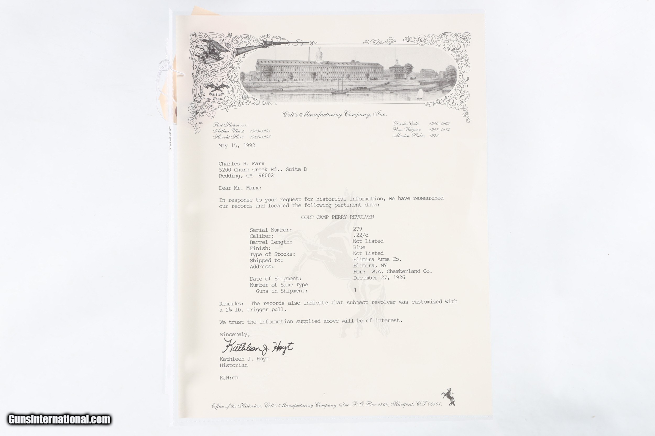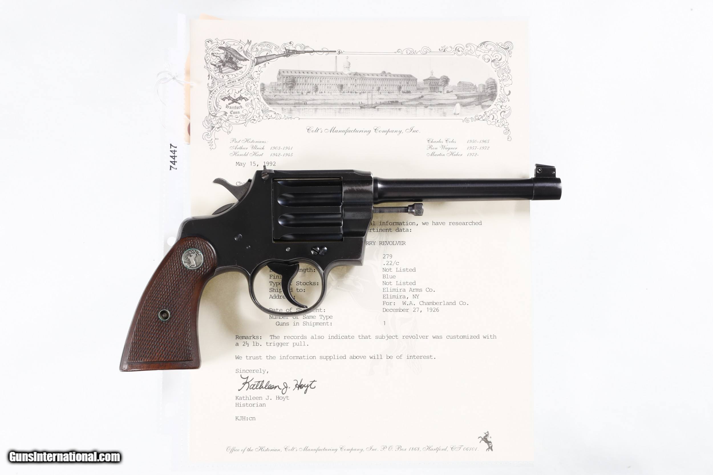 Description: Scarce short barreled configuration Colt Camp poerry with factory letter. Matching numbers on frame grips and barrel. Excellent bright bore and proper operating mechanics.Very good plus overall condition. The included factory letter confirms the current configuration when it was shipped on December 27, 1926, to Elimira Arms Co. of Elimira, NY, for W. A. Chamberland Co. The letter also states the pistol was shipped with a special 2 1/2 lb. trigger pull. • Free Shipping, No Credit Card Fees. • Lay-a-way available for this firearm. • 1/3 Down, a 1/3 in 30 Days 1/3 in 60 Days. SOLD Curio/Relic: Yes Manufacturer: Colt Model: Camp Perry Serial Number: 279 Barrel Length: 7 |