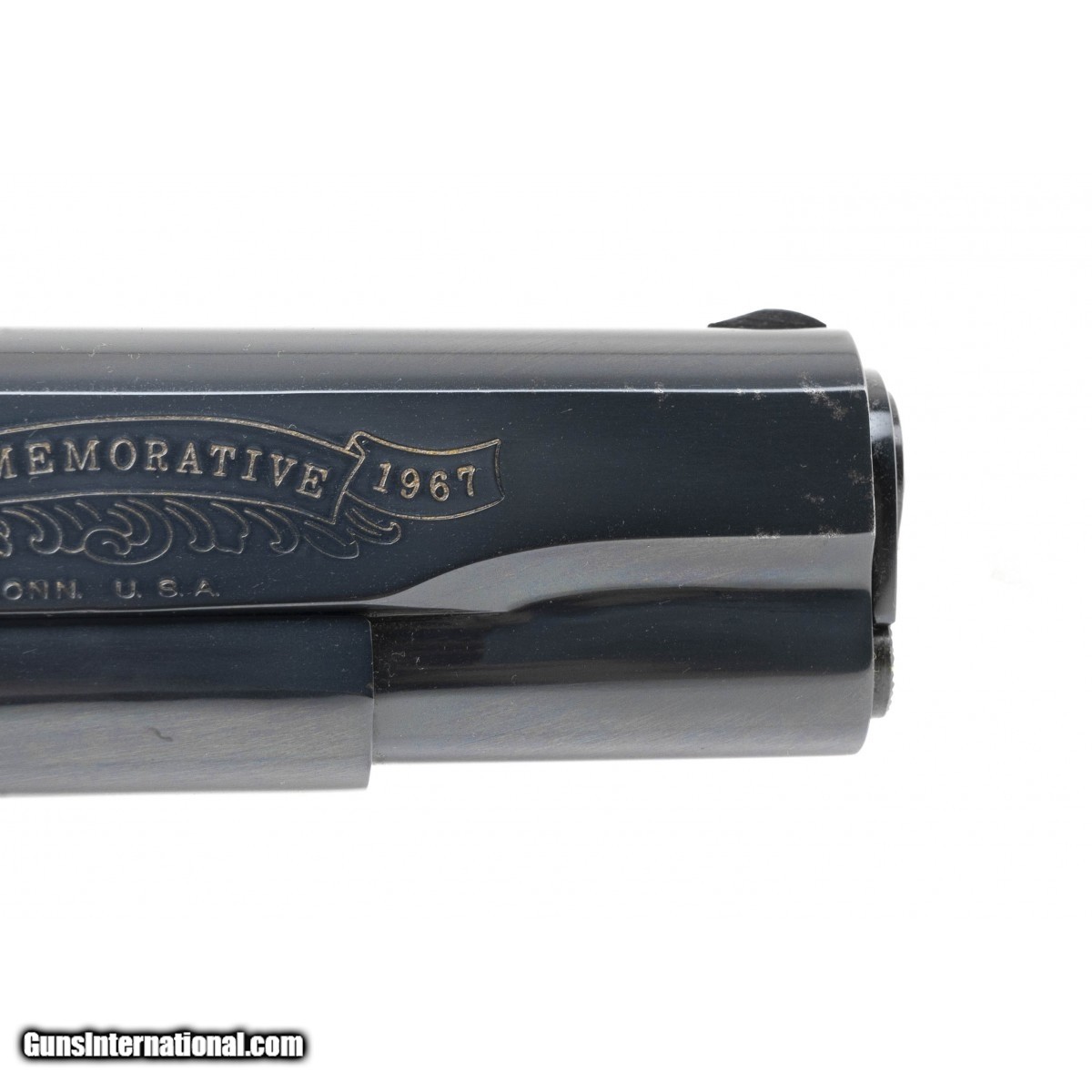 Colt 1967 issued 1911 commemorating the battle of Chateau Thierry. Metal has a high polished finish with a battle scene engraved on the left side of the slide. Grips are inlayed with medallions. Near excellent condition save for some very minor flaking by muzzle on right side of slide.