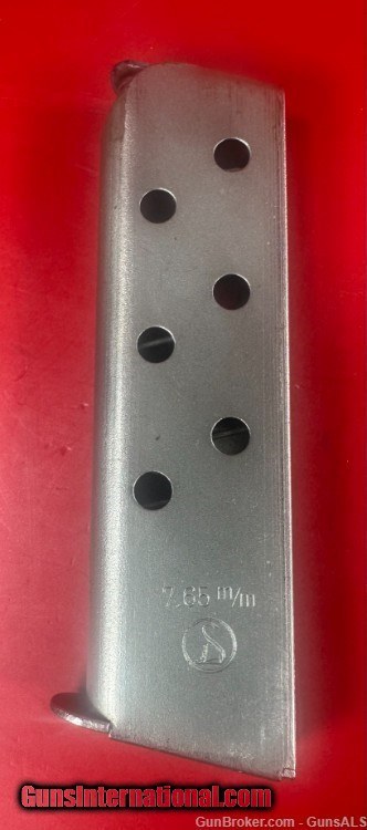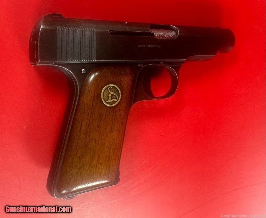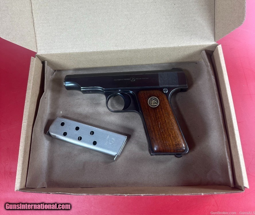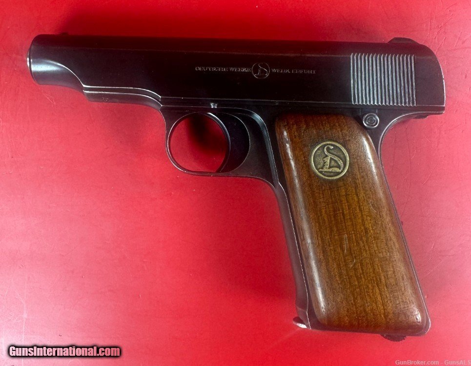 Description: For Sale Deutsche Werke Ortgies .32 ACP 7.65mm Semi Automatic Pistol, 1920s in excellent condition. The Ortgies pistol was produced in 6.35 mm, 7.65 mm, and 9 mm variants. The hammerless action depended on a spring-loaded striker to fire the cartridge. The Ortgies pistol was only made between 1919 and 1924 by Deutsche Werke – production being forced to stop due to the Treaty of Versailles. It makes it very rare and desirable for collectors. The example is in excellent condition: metal finish about 98%, bore is shiny with strong rifling, about 97%, wood grips about 97%. Will make great addition to any collection. Make: Deutsche Werke Model: Ortgies Caliber: .32 ACP (7.65mm) Action Type: Striker Fired Semi Auto Pistol fed by Detachable Magazine Barrel Length: 3 1/4” Sights / Optics: The front sight is a short blade integral to the slide above the muzzle. The rear sight is a V-notch grooved in a boss at the top rear of the slide. Stock Configuration & Condition: The grips are two-piece smooth wood featuring a stylized cat “D” logo medallion on either side. SOLD Handgun Caliber: .32 ACP (7.65x17mm Browning SR) |