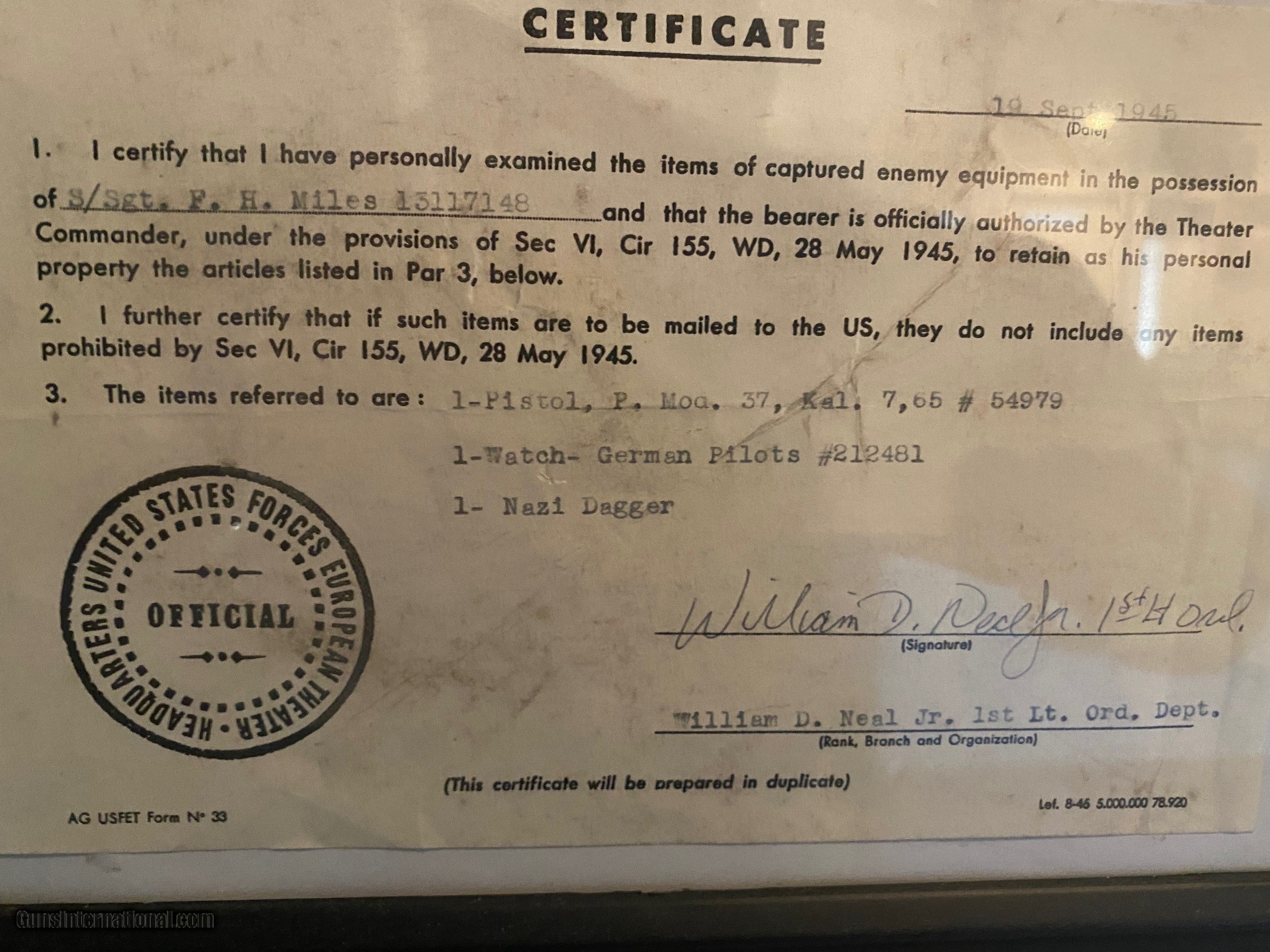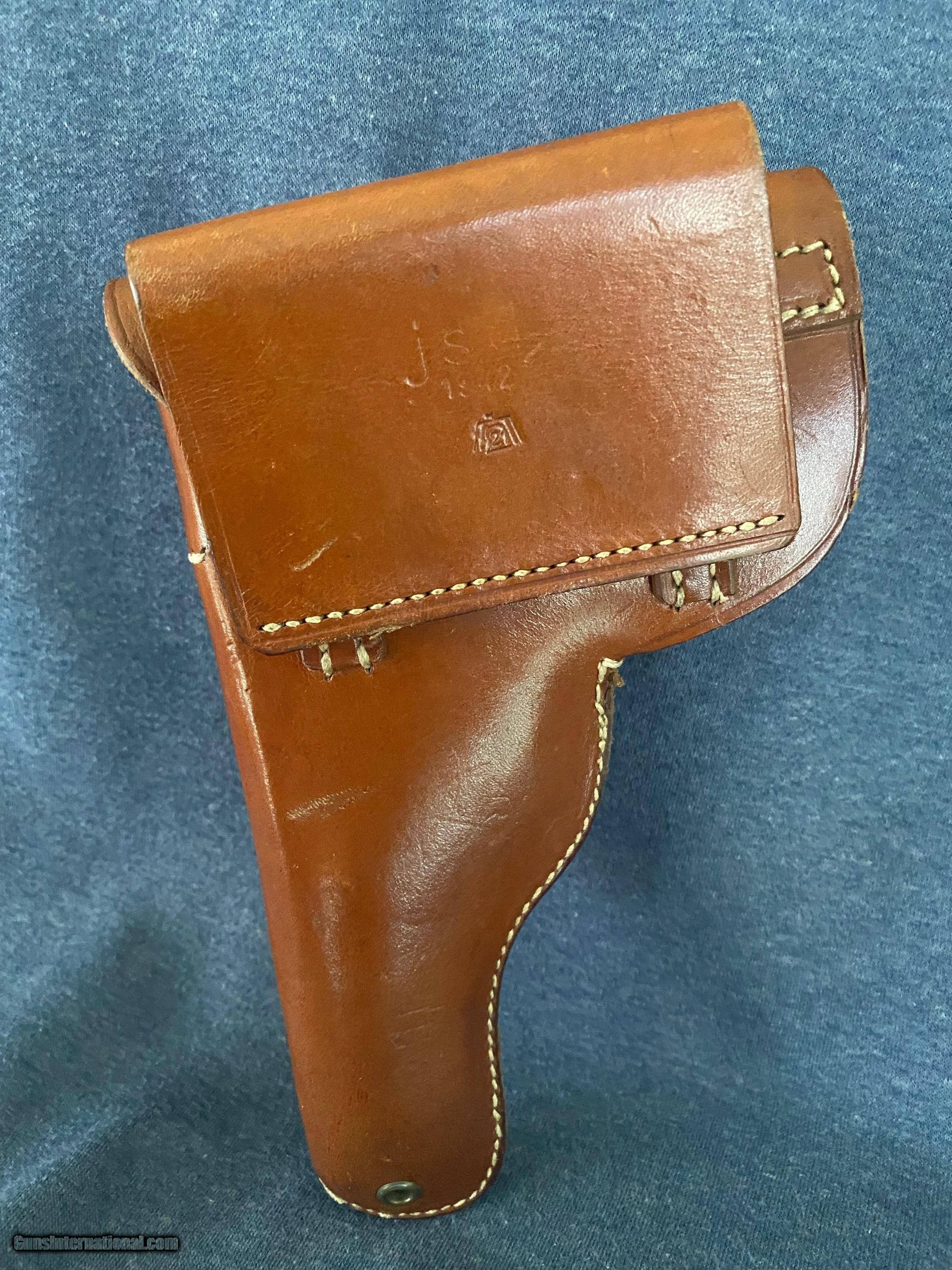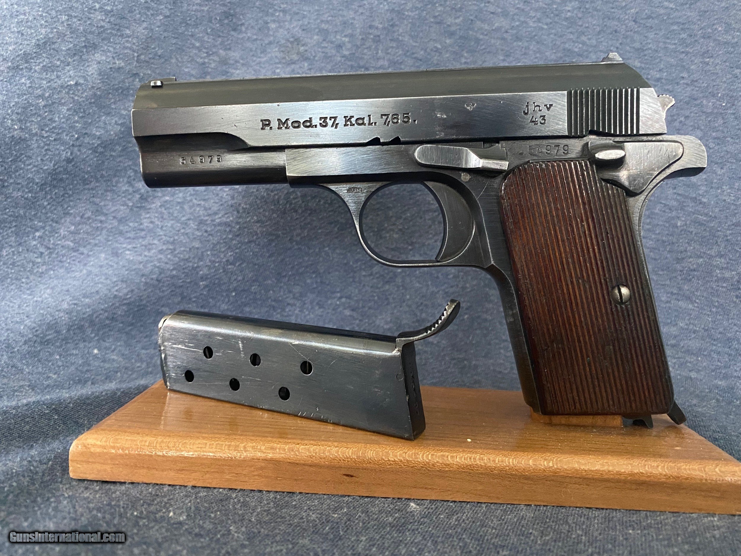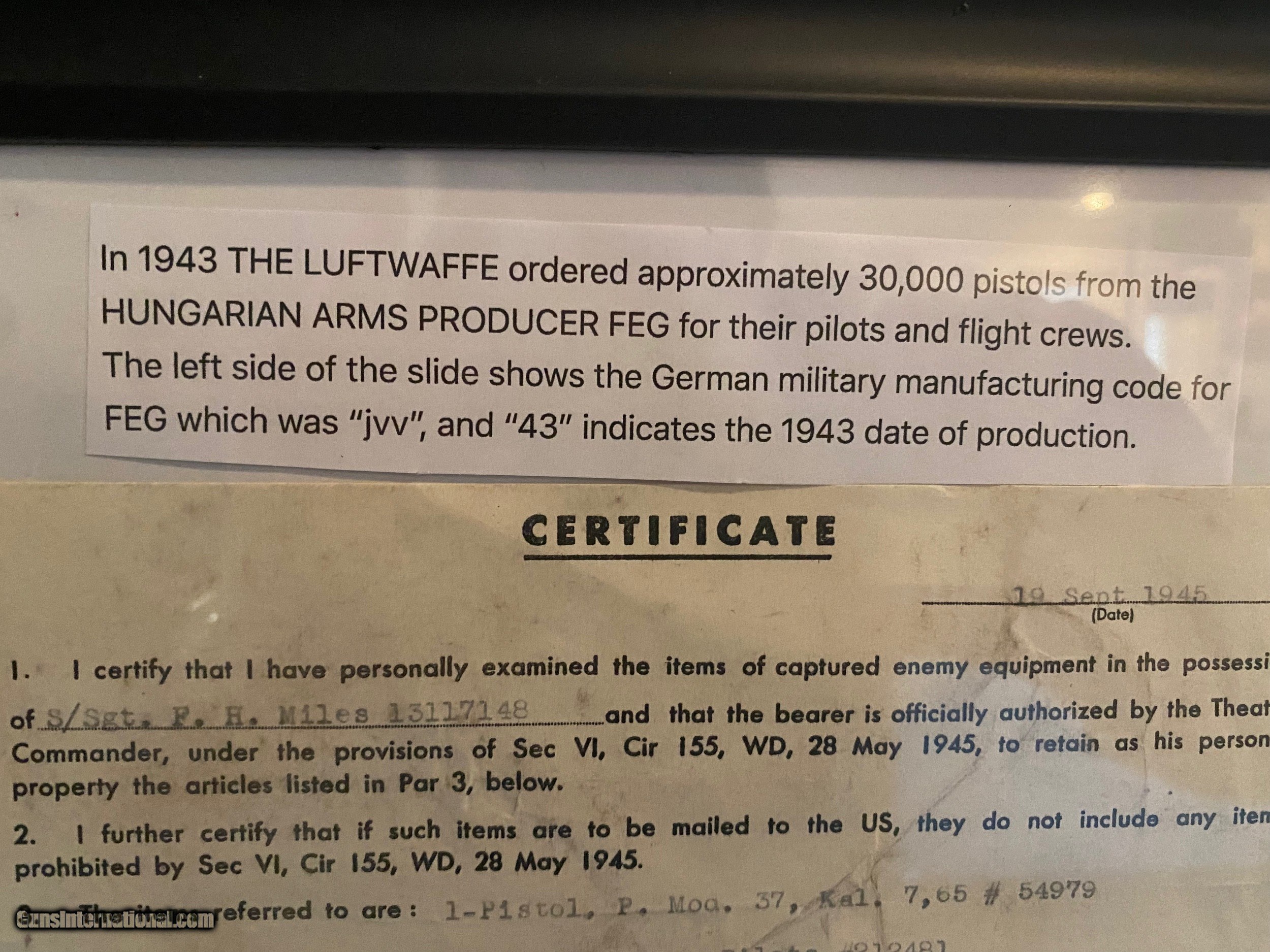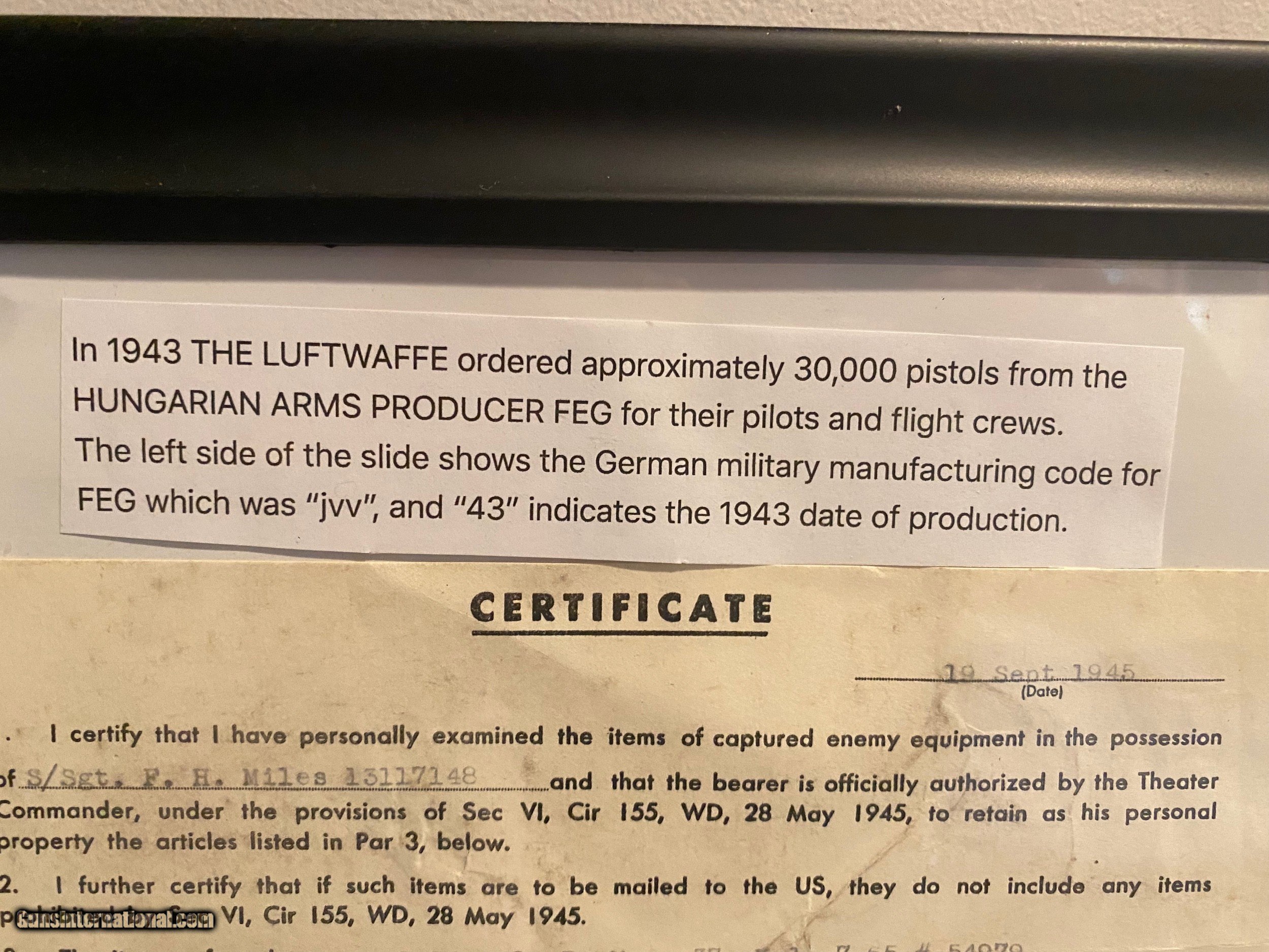 Description: 1943 Femaru made by the Nazis after the invasion of Hungry very unique rig with rare Luftwaffe dropping style holster in mint condition this is an investment grade collectible pistol, one of the most sought after of ww2 nazi proofed and all matching even the magazine! Comes with capture papers! A real GI bring back! see photos usps money orders and checks accepted $75.00 shipping 3 day inspection period and returns pay shipping both ways and any listing fee SOLD Curio/Relic: Yes Handgun Caliber: .32 ACP (7.65x17mm Browning SR) Manufacturer: Femaru Model: Mod 37 Serial Number: 54979 Barrel Length: 4” Condition: Excellent Metal Condition: Great Wood Condition: Great Bore Condition: Good |