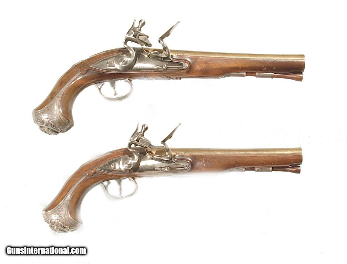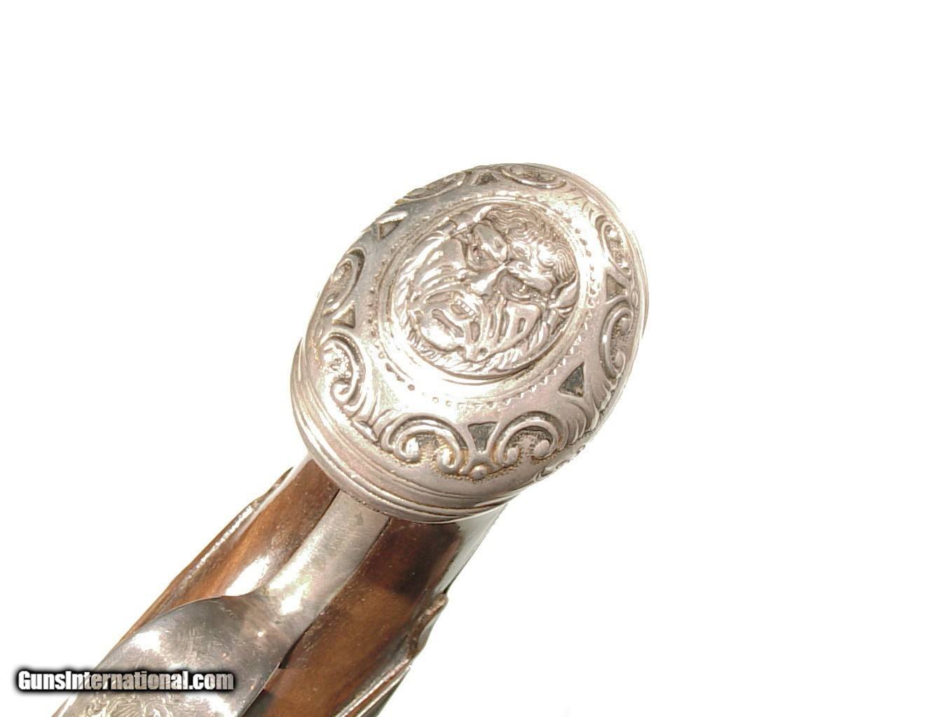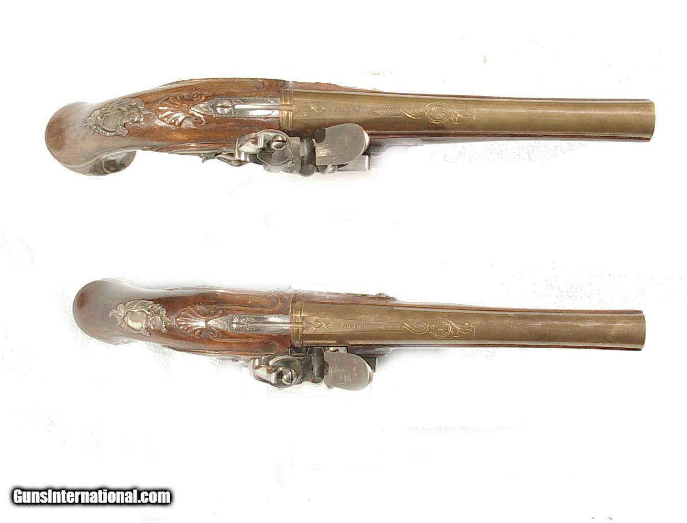 Description: .57 caliber swamped brass engraved barrels marked "LONDON" on the top flats. Full length walnut stocks with silvered mounts, triggerguard, masked butts and pierced side plates. Convex flintlocks signed "HAWKINS" In superb condition overall and appear unfired. SOLD Antique: Yes |
