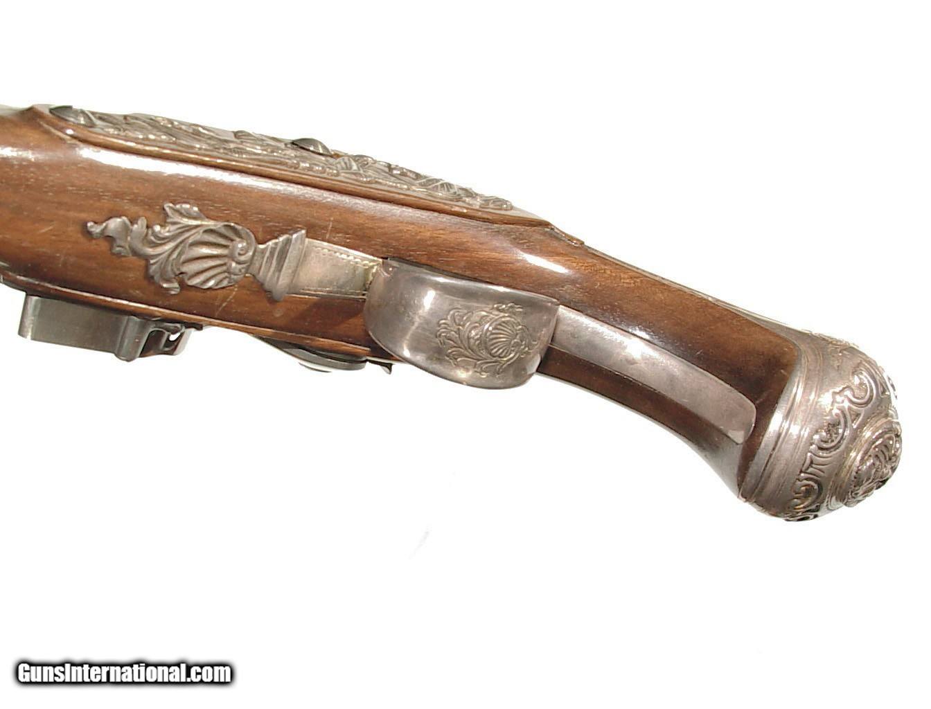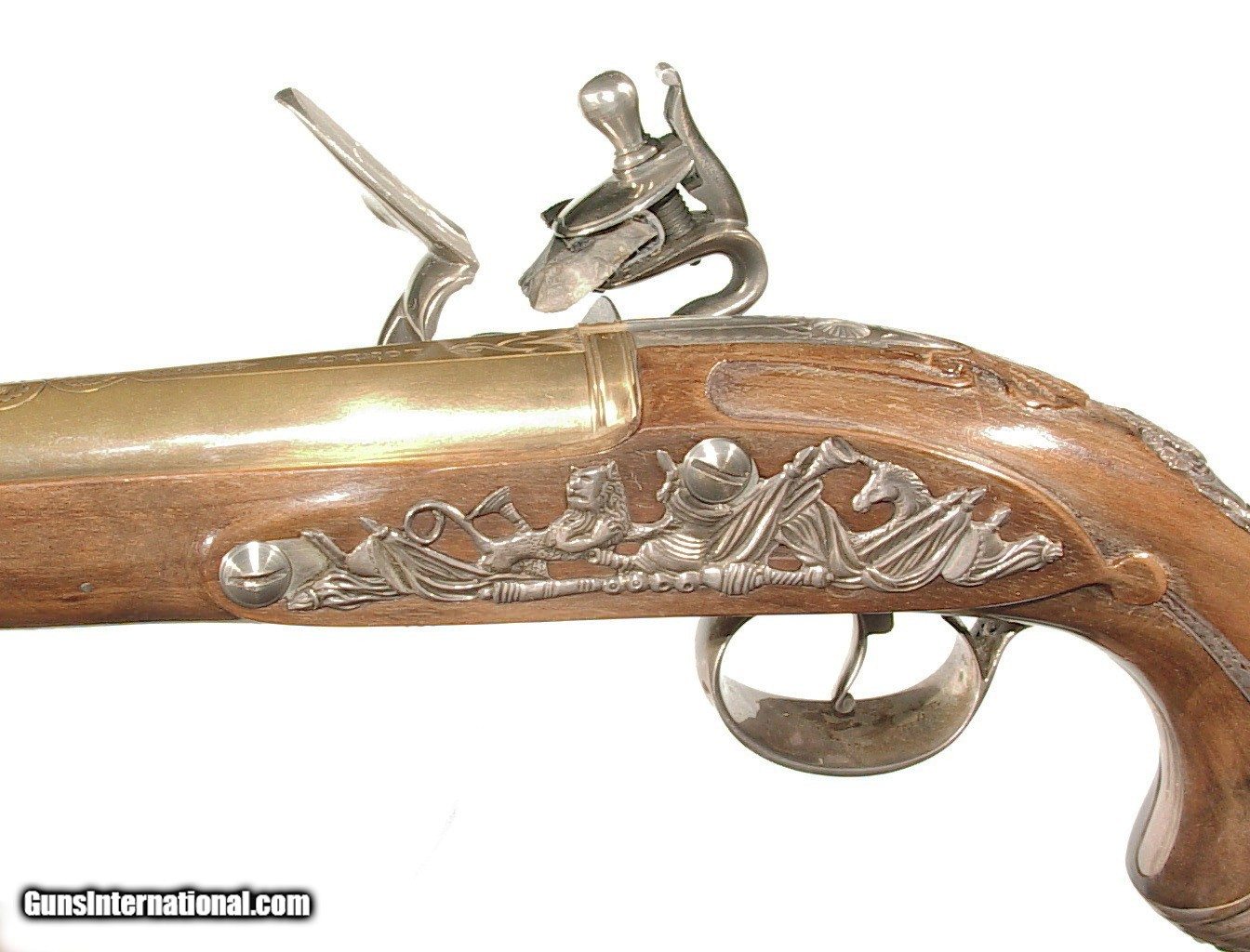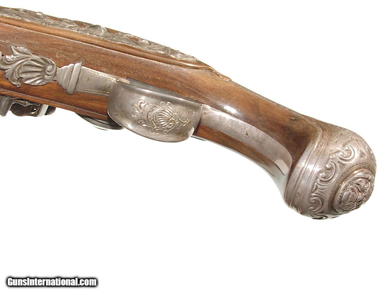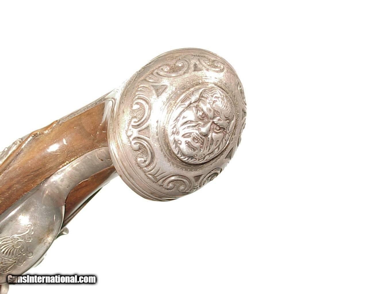 Description: .57 caliber swamped brass engraved barrels marked "LONDON" on the top flats. Full length walnut stocks with silvered mounts, triggerguard, masked butts and pierced side plates. Convex flintlocks signed "HAWKINS" In superb condition overall and appear unfired. SOLD Antique: Yes |