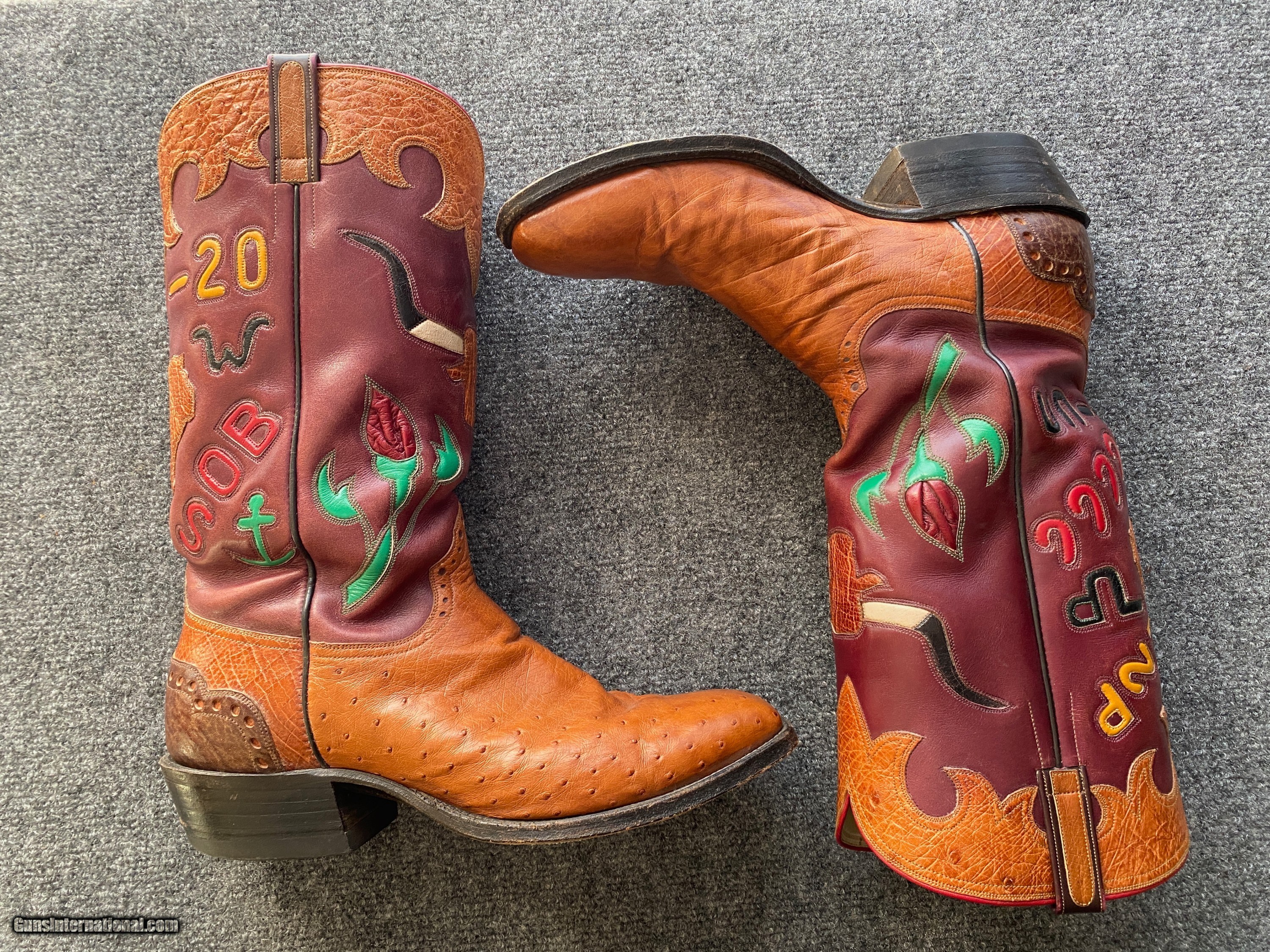 Custom made “Cattle Brand” style cowboy boots, size 10. Ostrich hide and calf shoulder tops and heels for comfort. Cattle brand patterns from Texas ranches, hand crafted by Joe Bowman.