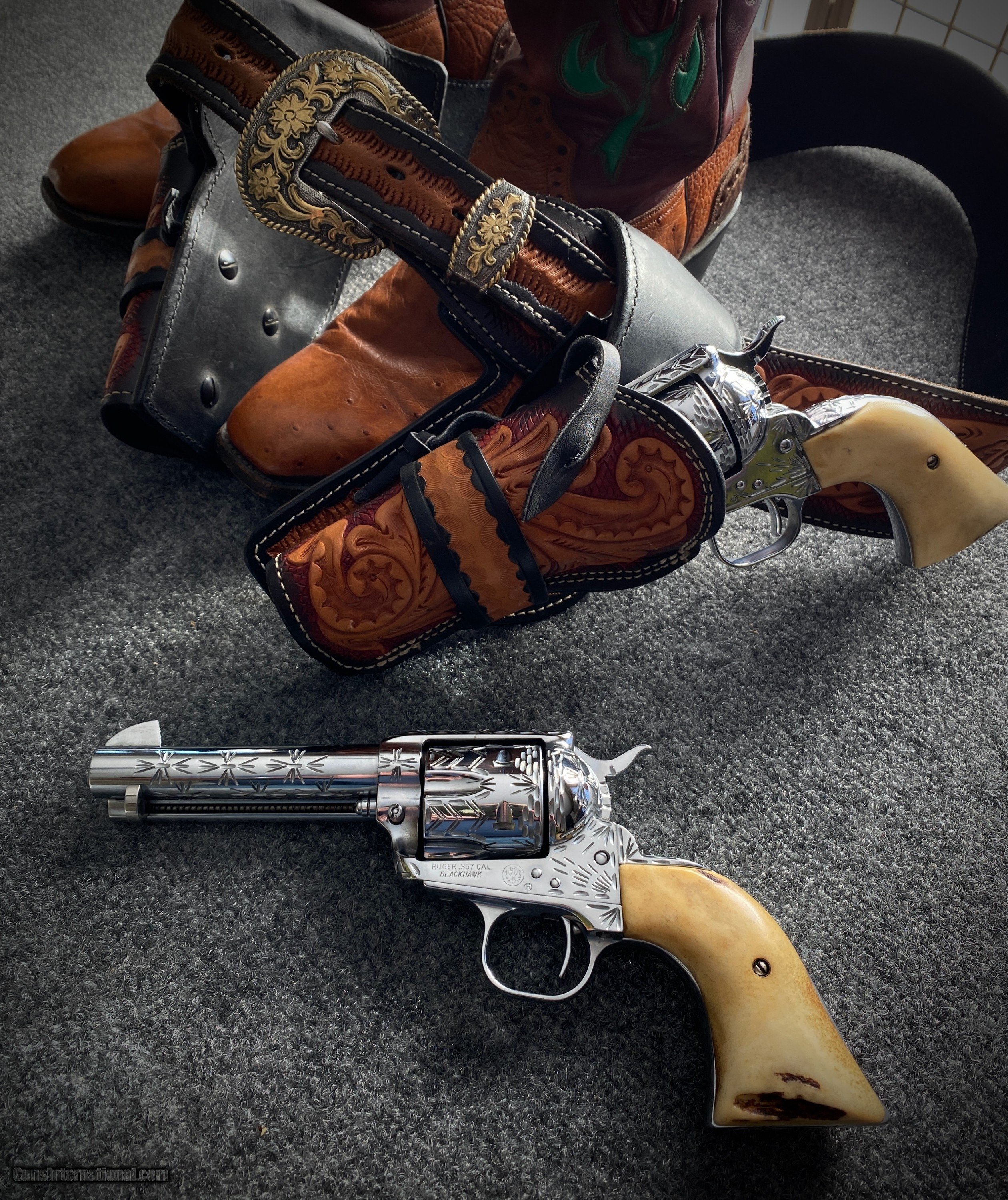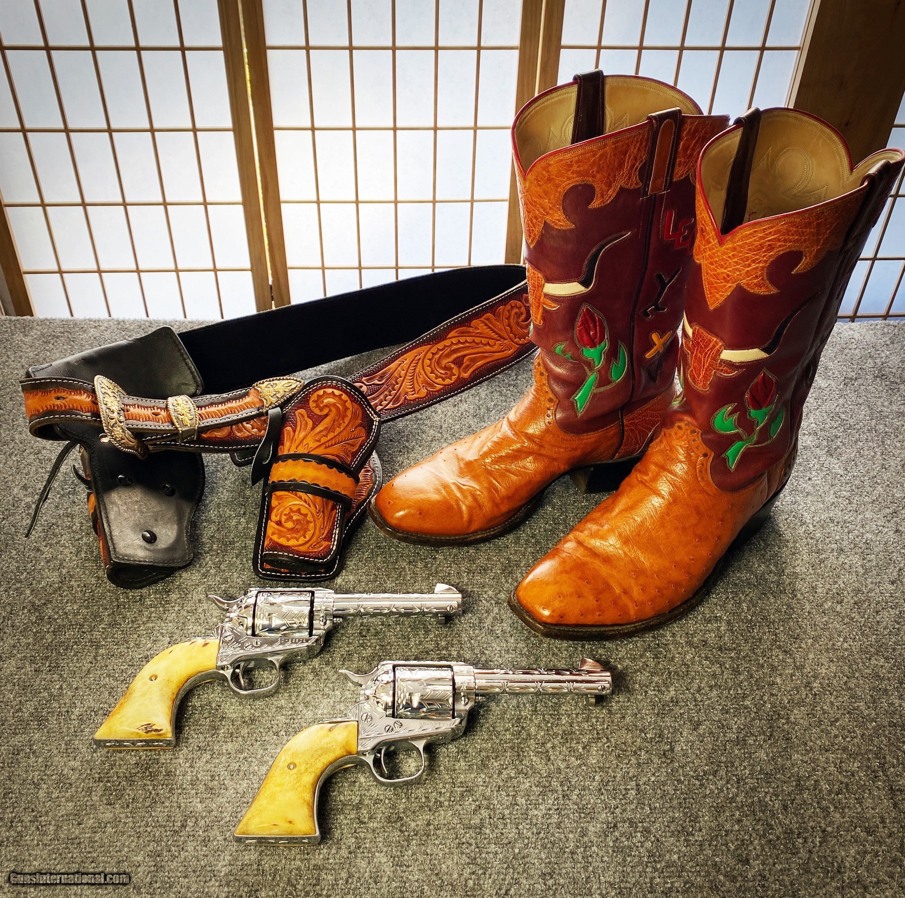 This collection of custom Ruger revolvers, quick draw rig and cattle brand boots were custom made by Joe Bowman of Houston, Texas. Bowman was expert marksman, western showman and maker of custom firearms and leatherwork.