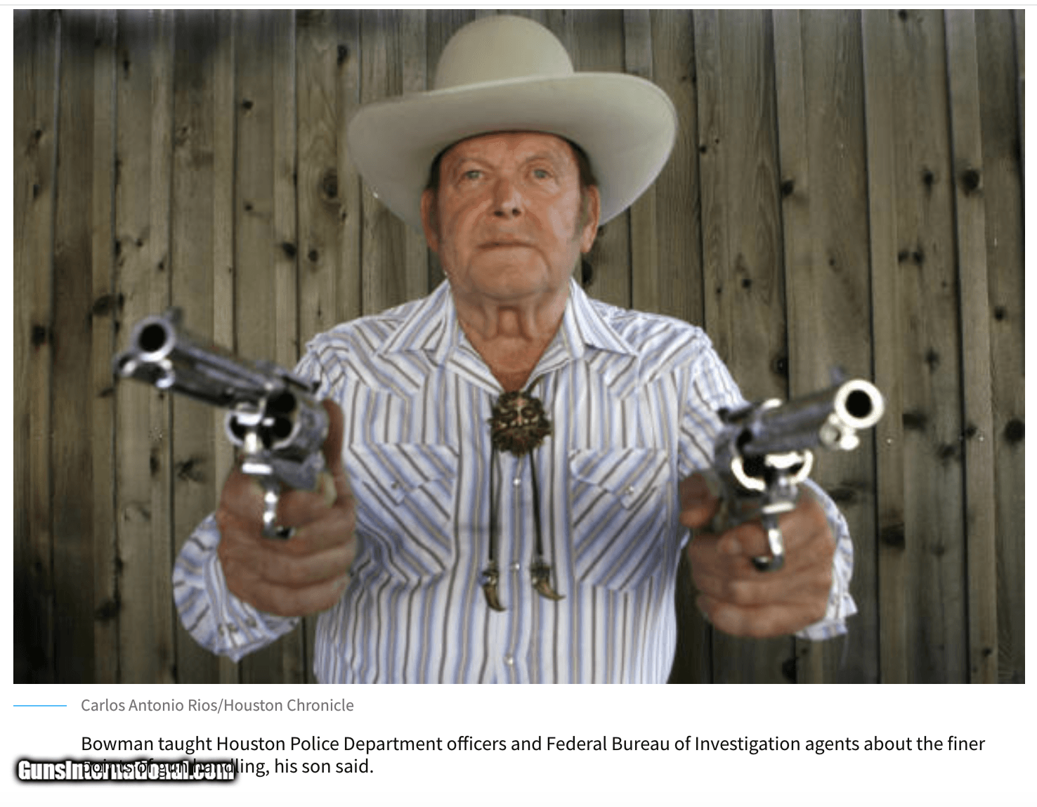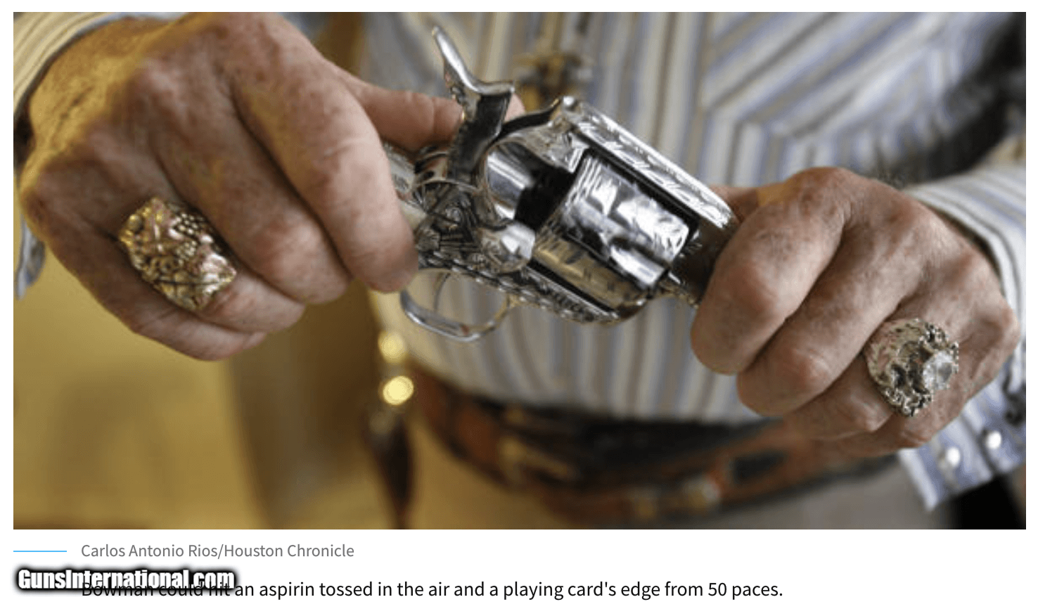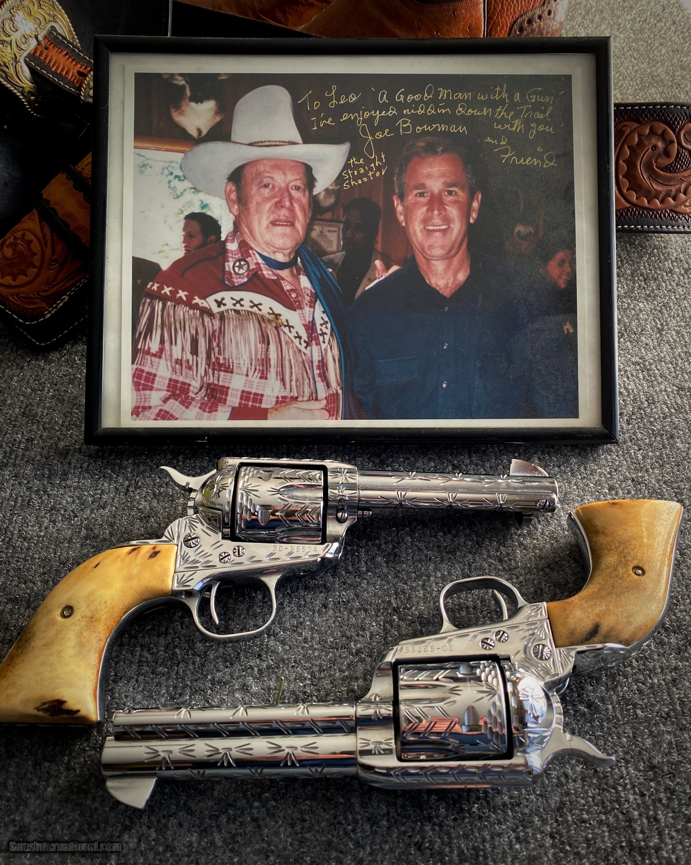 Mr. Bowman’s precision target acquisition skills were legendary in the shooting world. He was also a skilled in gunsmith and leather work. He built and engraved his own custom guns and leather work for clients from Roy Rogers to Robert Duval. He taught shooting and gun handling skills to law enforcement and Hollywood stars. He was an advisor to Bill Ruger who created a commemorative Bowman revolver.