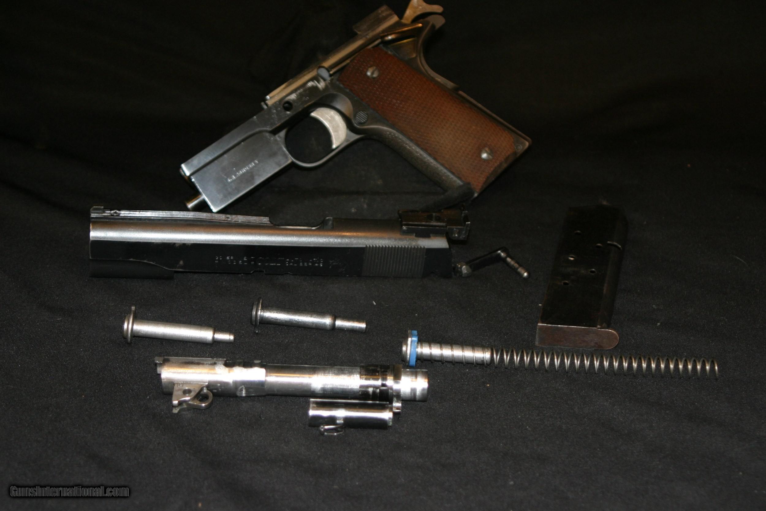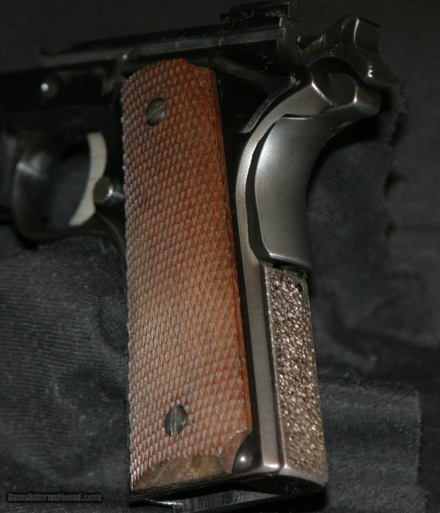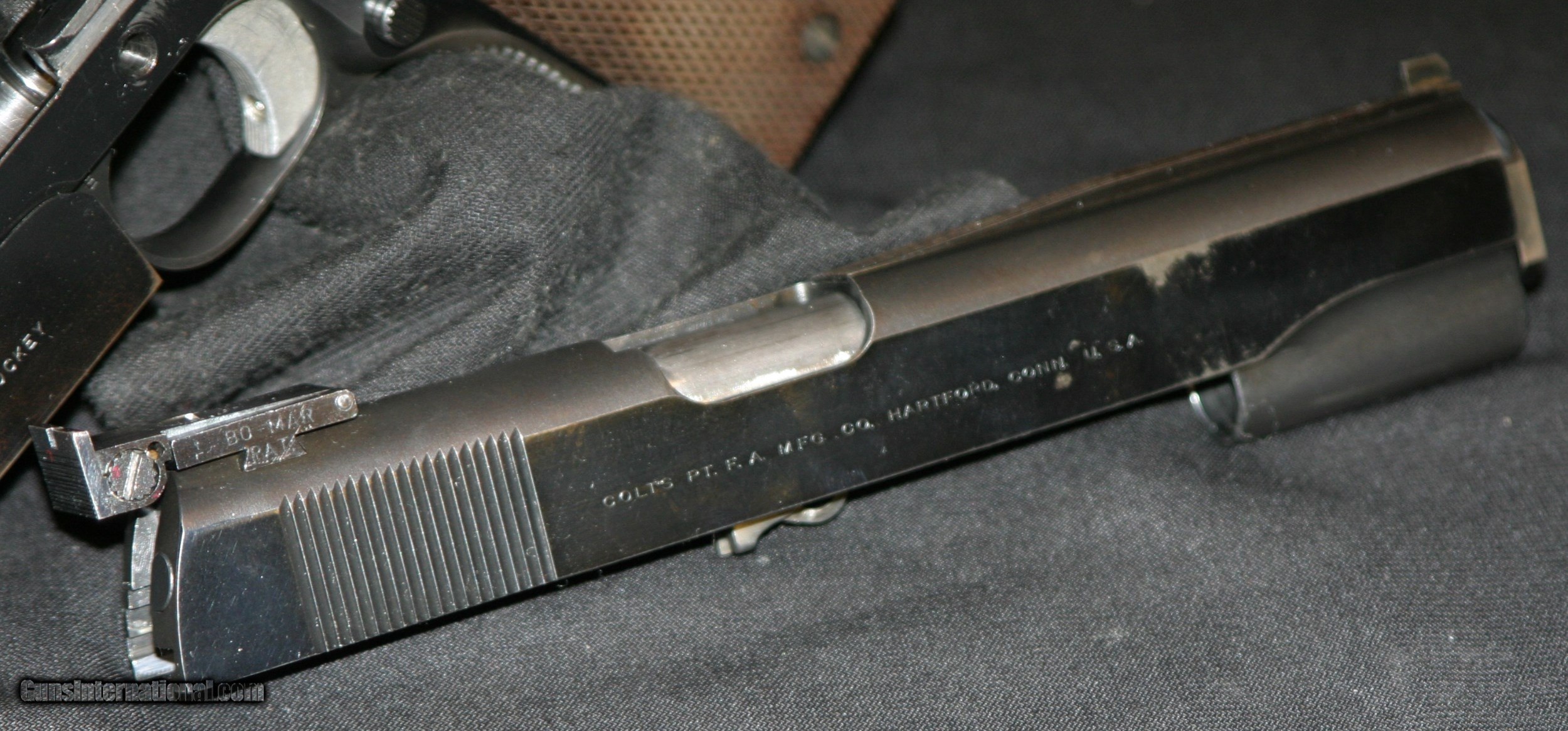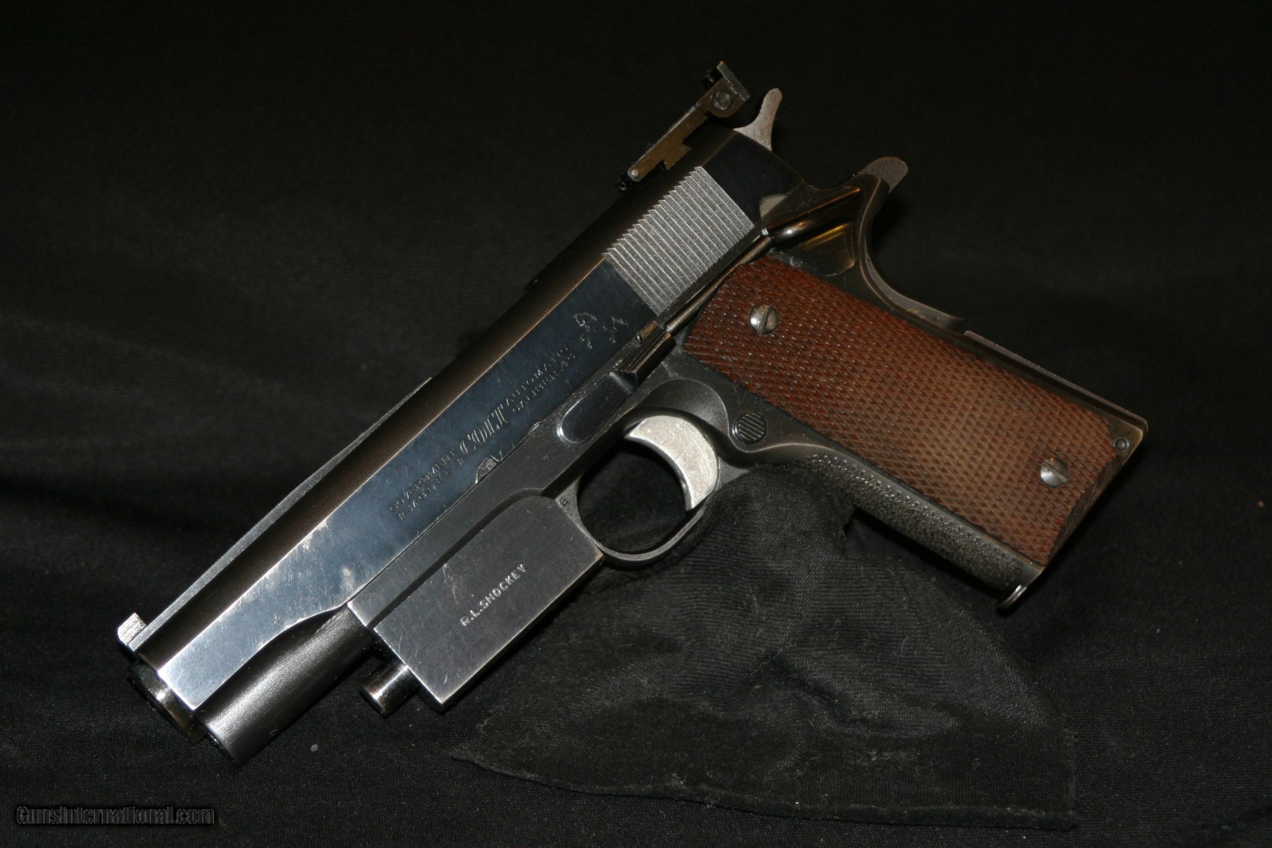 Description: LOTS OF PHOTOS FOR THIS VERY UNIQUE 1911 SET UP FOR BULL'S EYE TARGET SHOOTING.ROBERT L.SHOCKEY WAS A GIFTED GUNSMITH/BUILDER OF THE ERA AND CREATED MANY INVOCATIONS TO INCREASE ACCURCY AND MAINTAIN CONSISTANT SCORES. HE DEVOLVED HIS OWN WEIGHT SYSTEM THAT WAS ADJUSTABLE FOR THE SHOOTER AND A SMAILL HAIRPIN SPRING ON THE RECOIL PLUG TO HAVE UPWARD PRESSUE ON THE BARREL. 1963 COLT FRAME/SLIDE/BARREL. OVERALL VERY GOOD CONDITION! GREAT TRIGGER AS WELL "In the late 60's or early '70's his guns were listed in the Gil Hebard Guns catalog, a mail order vendor of bulls eye equipment". SOLD |