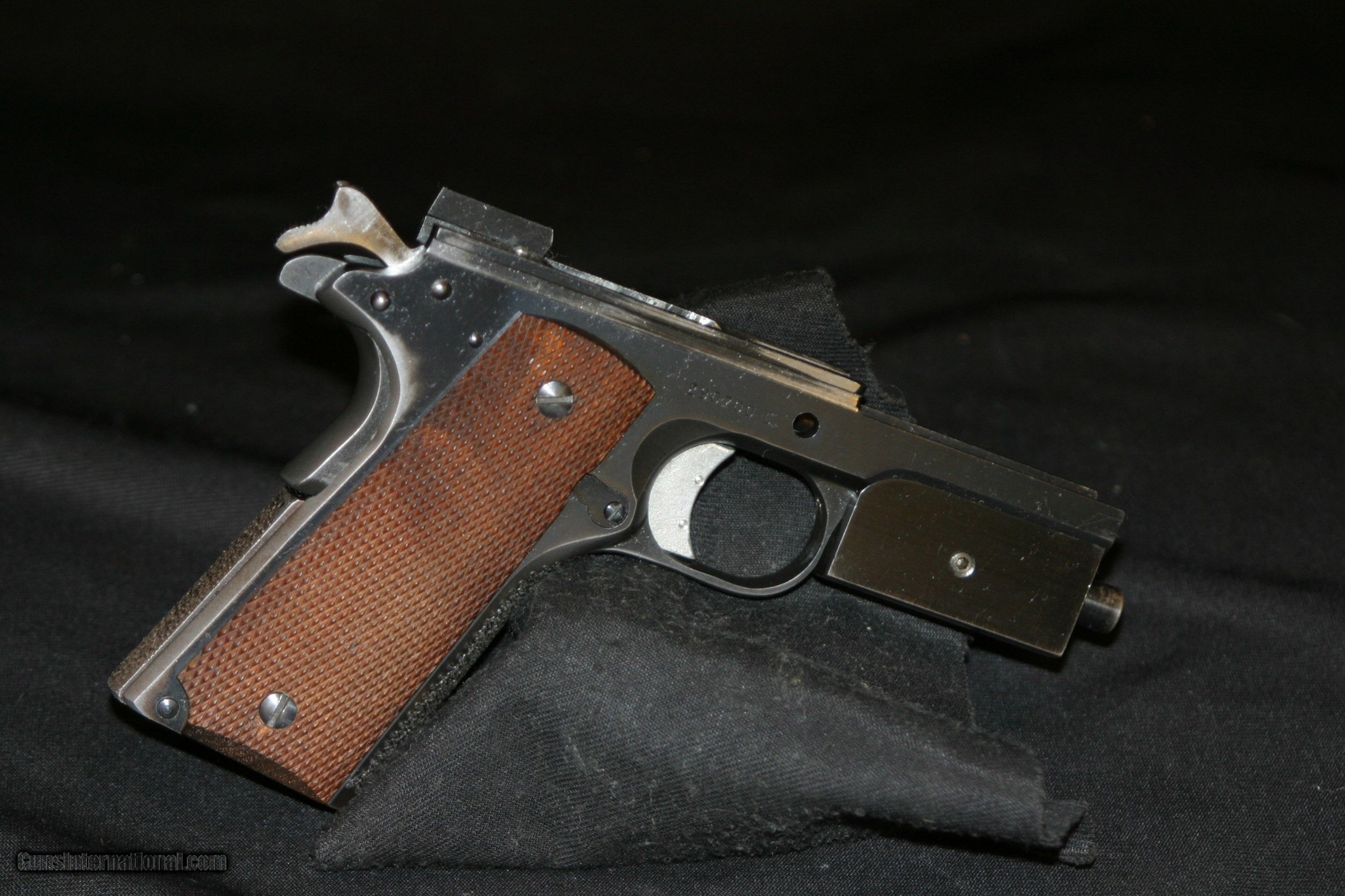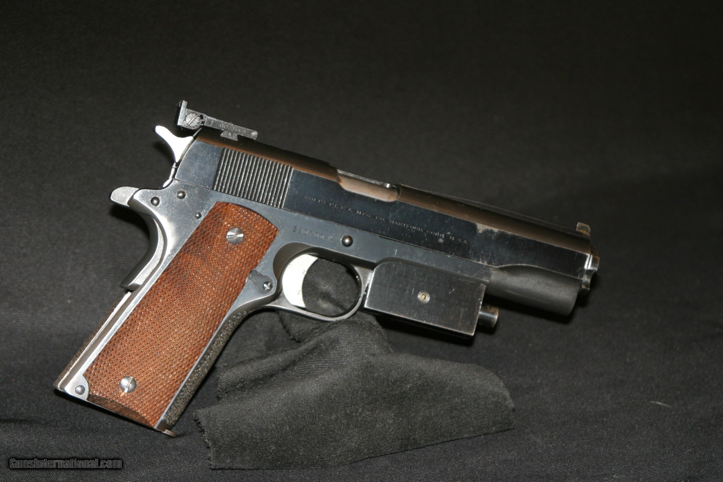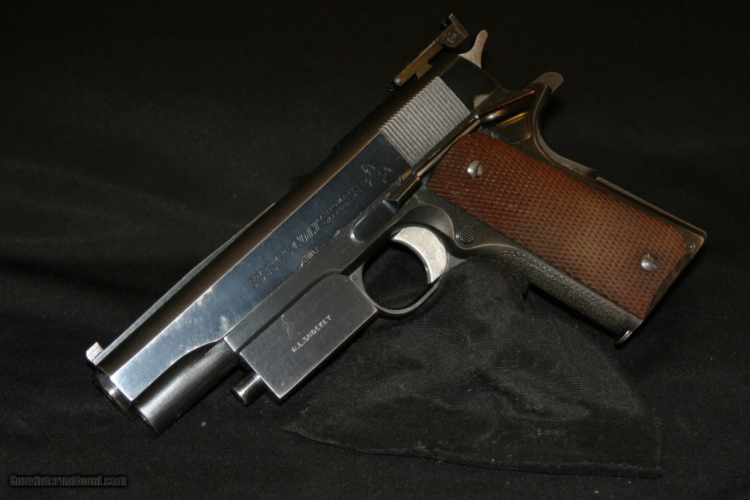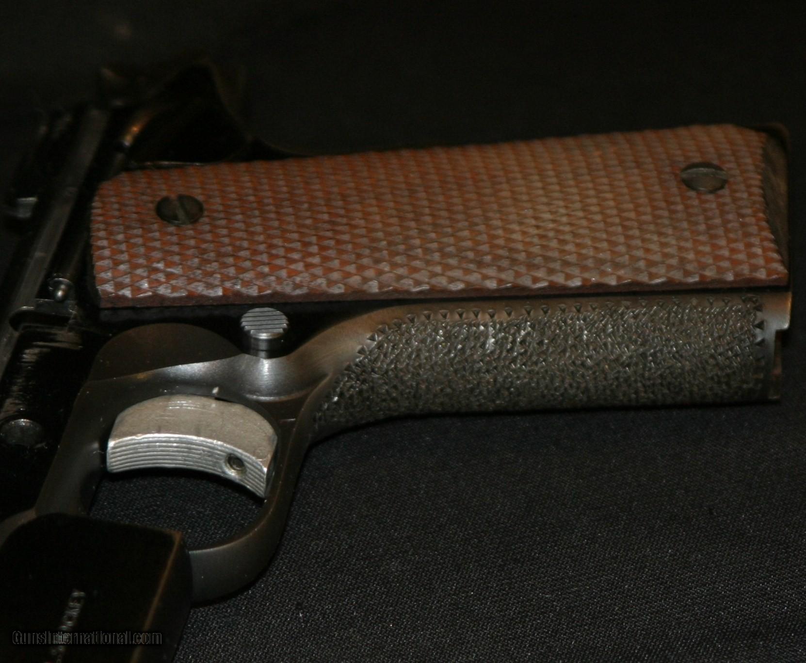 Description: LOTS OF PHOTOS FOR THIS VERY UNIQUE 1911 SET UP FOR BULL'S EYE TARGET SHOOTING.ROBERT L.SHOCKEY WAS A GIFTED GUNSMITH/BUILDER OF THE ERA AND CREATED MANY INVOCATIONS TO INCREASE ACCURCY AND MAINTAIN CONSISTANT SCORES. HE DEVOLVED HIS OWN WEIGHT SYSTEM THAT WAS ADJUSTABLE FOR THE SHOOTER AND A SMAILL HAIRPIN SPRING ON THE RECOIL PLUG TO HAVE UPWARD PRESSUE ON THE BARREL. 1963 COLT FRAME/SLIDE/BARREL. OVERALL VERY GOOD CONDITION! GREAT TRIGGER AS WELL "In the late 60's or early '70's his guns were listed in the Gil Hebard Guns catalog, a mail order vendor of bulls eye equipment". SOLD |