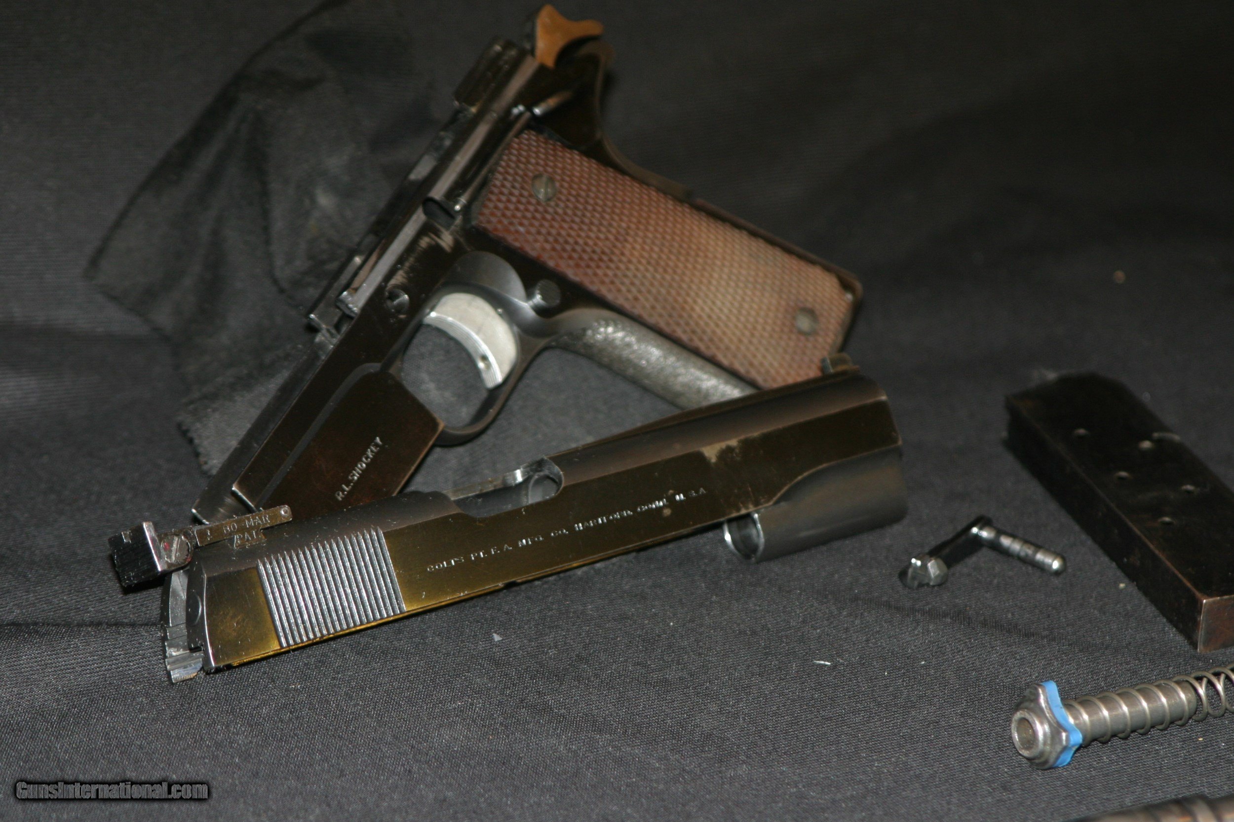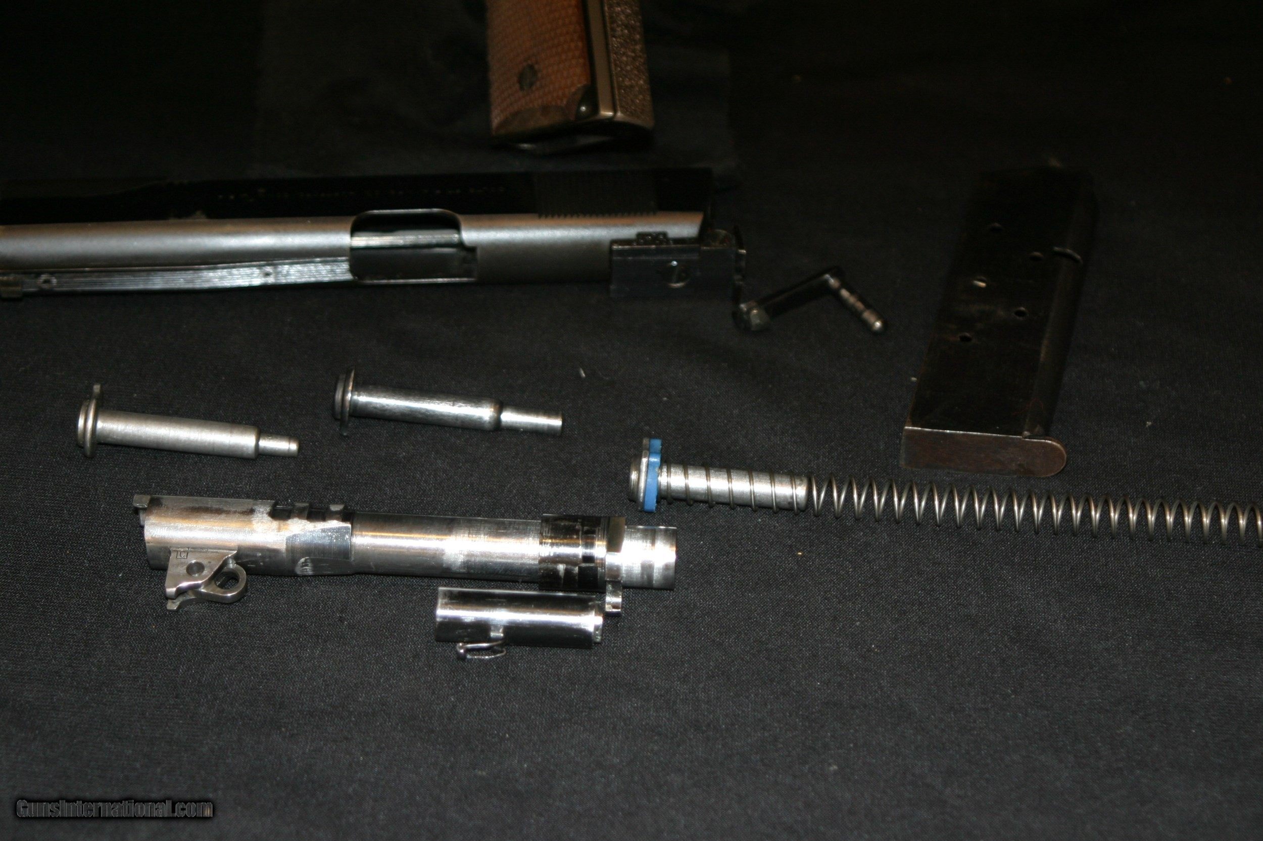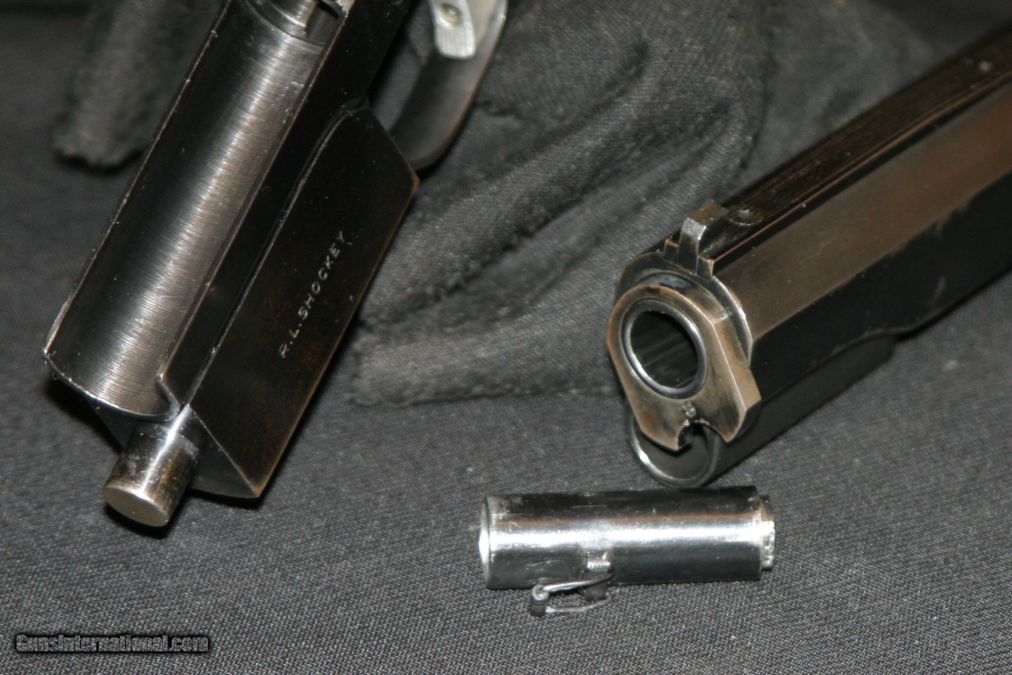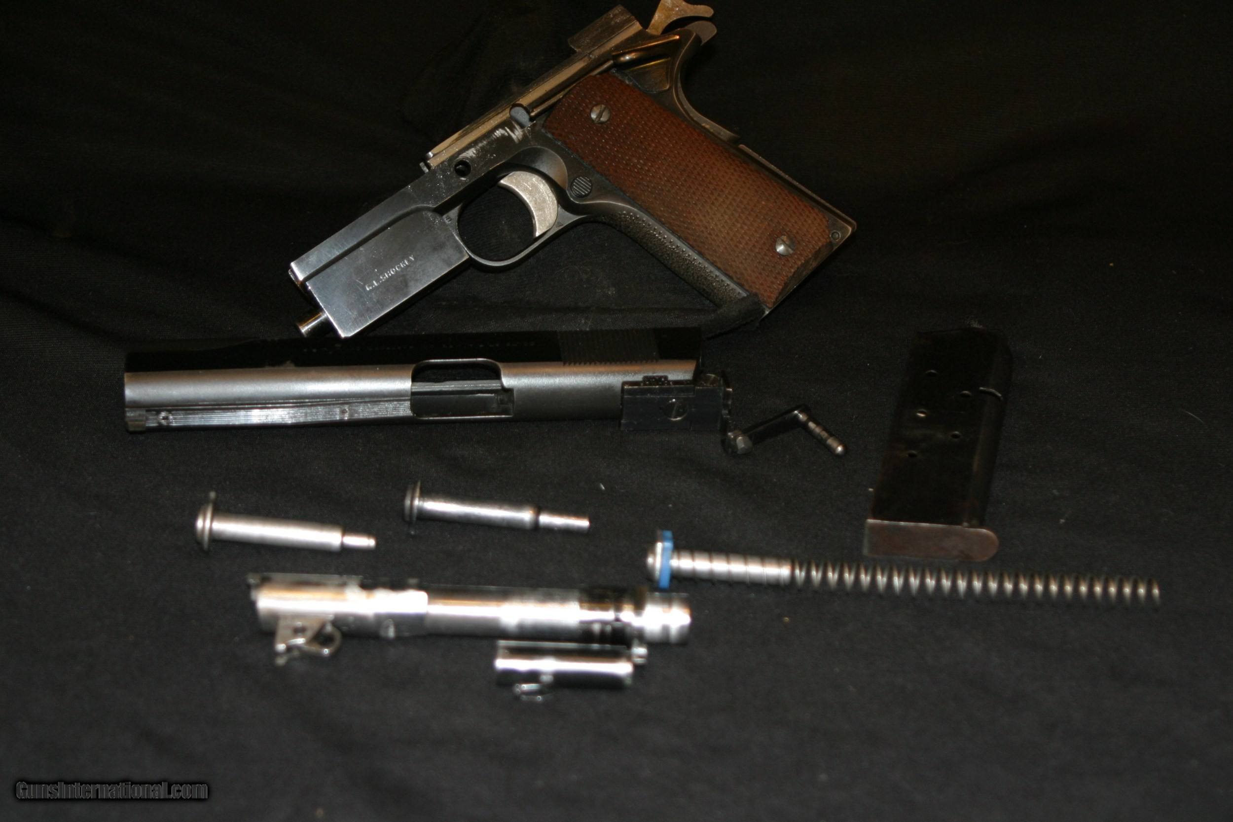 Description: LOTS OF PHOTOS FOR THIS VERY UNIQUE 1911 SET UP FOR BULL'S EYE TARGET SHOOTING.ROBERT L.SHOCKEY WAS A GIFTED GUNSMITH/BUILDER OF THE ERA AND CREATED MANY INVOCATIONS TO INCREASE ACCURCY AND MAINTAIN CONSISTANT SCORES. HE DEVOLVED HIS OWN WEIGHT SYSTEM THAT WAS ADJUSTABLE FOR THE SHOOTER AND A SMAILL HAIRPIN SPRING ON THE RECOIL PLUG TO HAVE UPWARD PRESSUE ON THE BARREL. 1963 COLT FRAME/SLIDE/BARREL. OVERALL VERY GOOD CONDITION! GREAT TRIGGER AS WELL "In the late 60's or early '70's his guns were listed in the Gil Hebard Guns catalog, a mail order vendor of bulls eye equipment". SOLD |