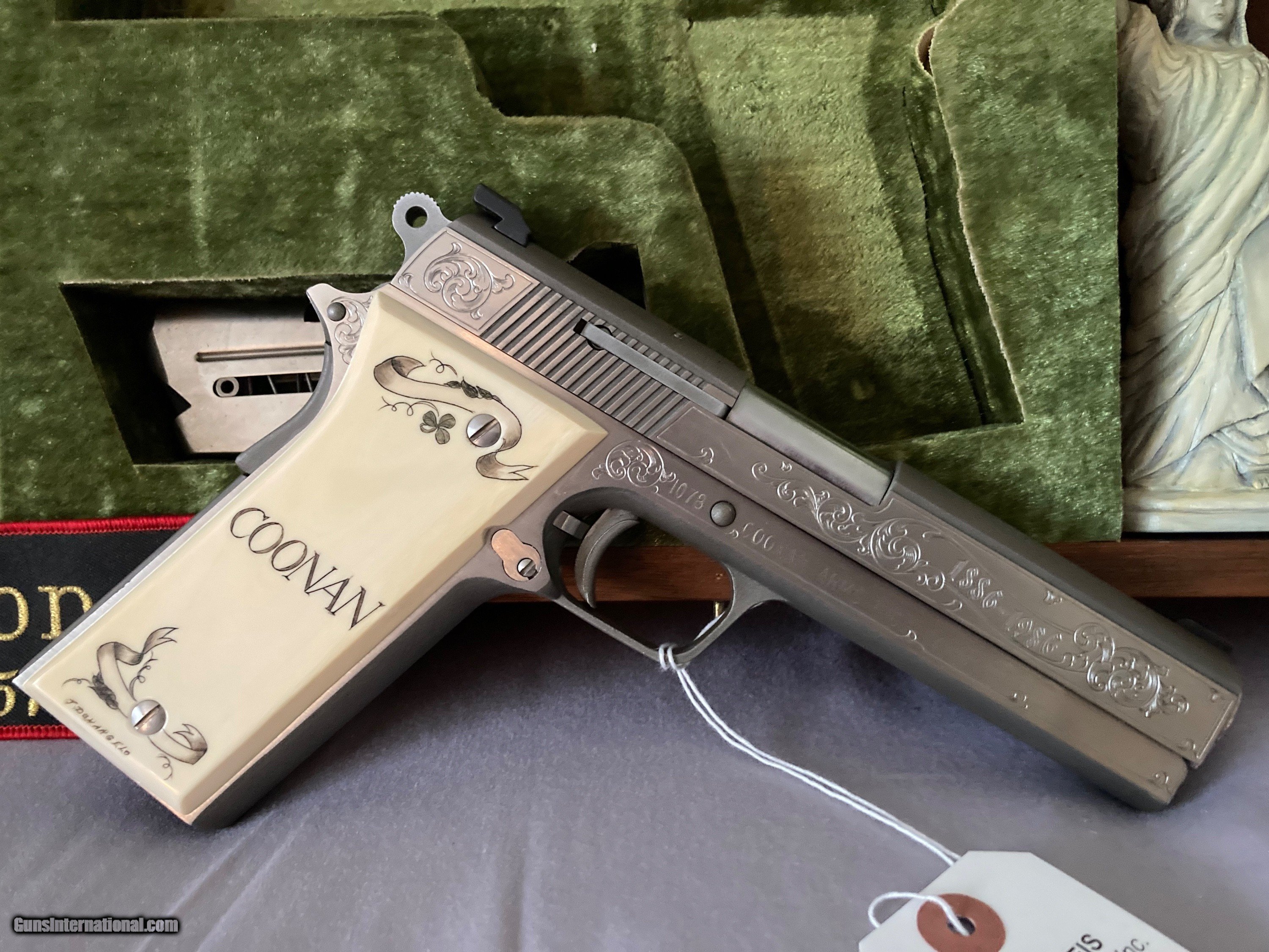 Description: Coonan Arms Model B, Miss Liberty Special #1, 357mag, 5" barrel, 1986 mfg, unfired in presentation box. ($50.00 shipping) SOLD |