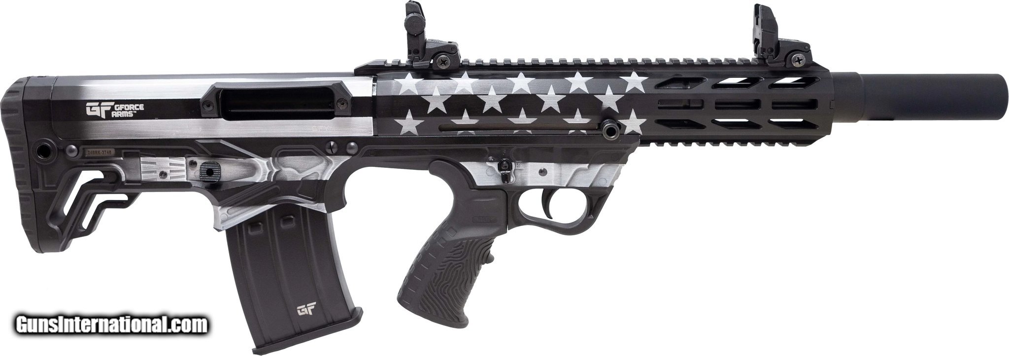 Description: Guns Listing ID: 479750 The GForce Arms GFY-1USA is a rugged and compact 12-gauge semi-automatic shotgun built for versatility and reliability. Featuring an 18.5-inch barrel and a 5+1 capacity, this bullpup design combines portability with firepower. The unique flag pattern black and white finish gives the GFY-1USA a striking appearance, making it a standout choice for tactical, sporting, or home defense needs. The GFY-1USA is equipped with folding front and adjustable rear sights, ensuring accurate targeting in various scenarios. Its bullpup configuration reduces overall length to just 28.25 inches, offering enhanced maneuverability without compromising barrel length. The shotgun includes a Picatinny rail for mounting optics or accessories, along with a pistol grip for improved control and handling during operation. The shotgun features a manual safety for secure handling and uses a metal AR-style magazine for reliable feeding. Its black rubber recoil pad adds comfort by minimizing felt recoil, while the 3-inch chamber accommodates a range of ammunition. SOLD Manufacturer: GFORCE ARMS Model: GFY-1 Condition: new Barrels: 18.5" BARREL Action: SEMI AUTOMATIC Gauge Info: 12 GA Finish: BLACK AND WHITE FLAG |