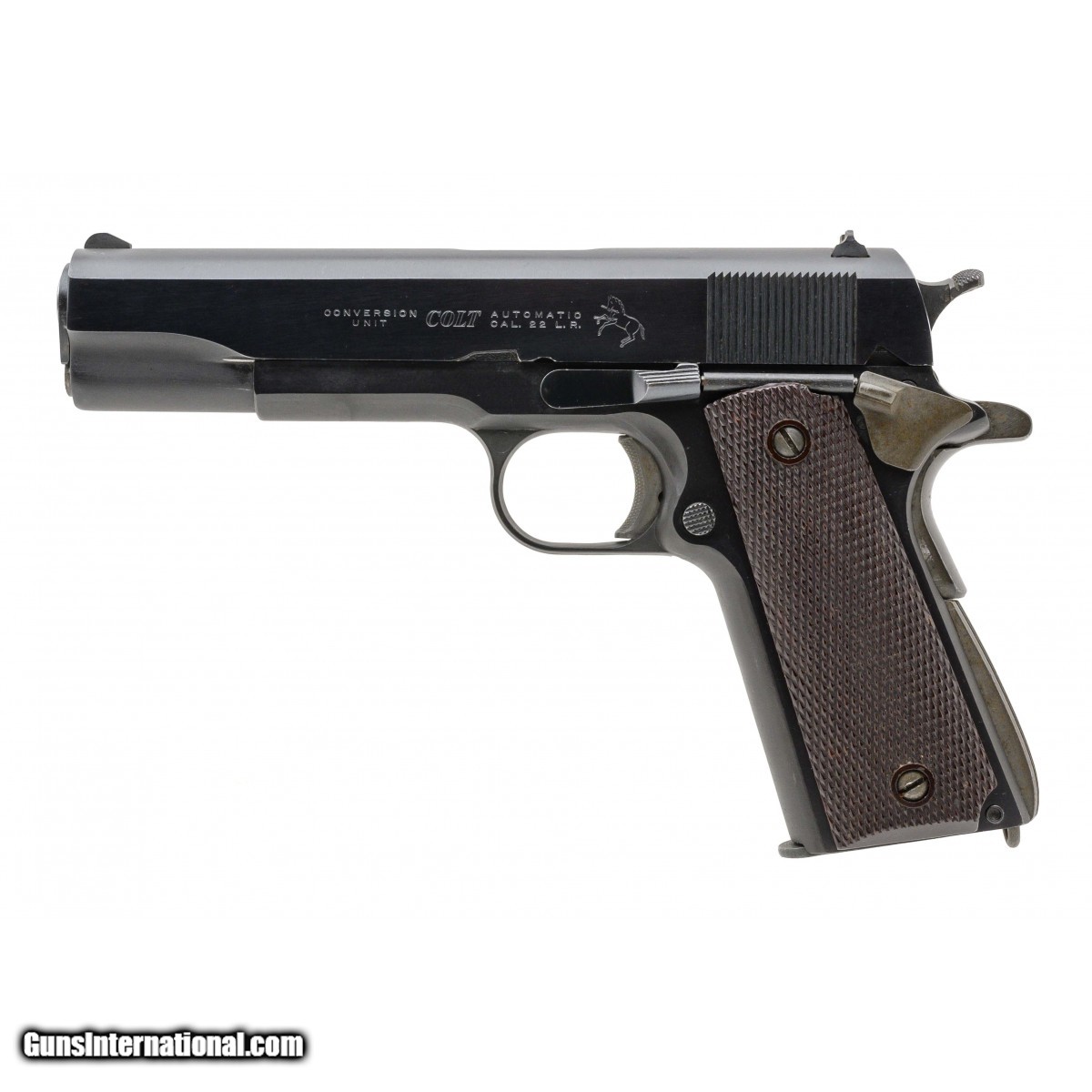SN: 4954. Caliber conversion made using an A.R. Sales aluminum frame & a COLT .22LR ""Conversion Unit"" slide. Overall condition is excellent with factory original finish on both the slide & frame. Comes with USGI nylon plastic checkered grips as well as six 10-round magazines. Consignment