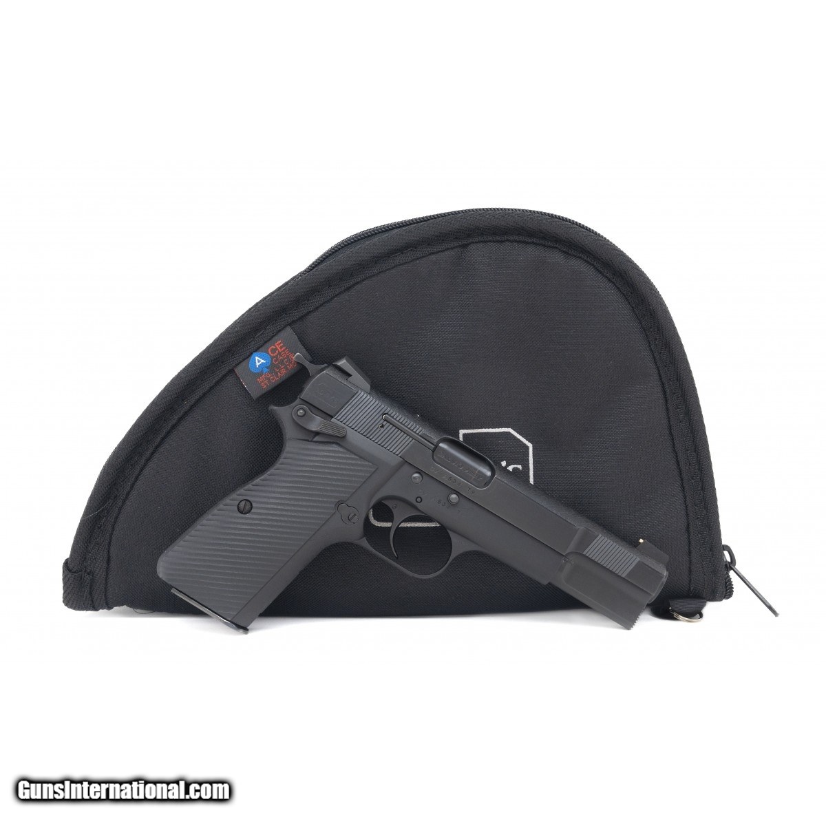 Very desirable light weight Hi-Power customized by Novak. Top of slide and front and back grip straps are stippled. Gold bead front sight. Nice notch action job. Serrations under muzzle. Ambi-safety. Bar Sto barrel. G10 grips. Excellent condition. A top notch custom Hi-Power!