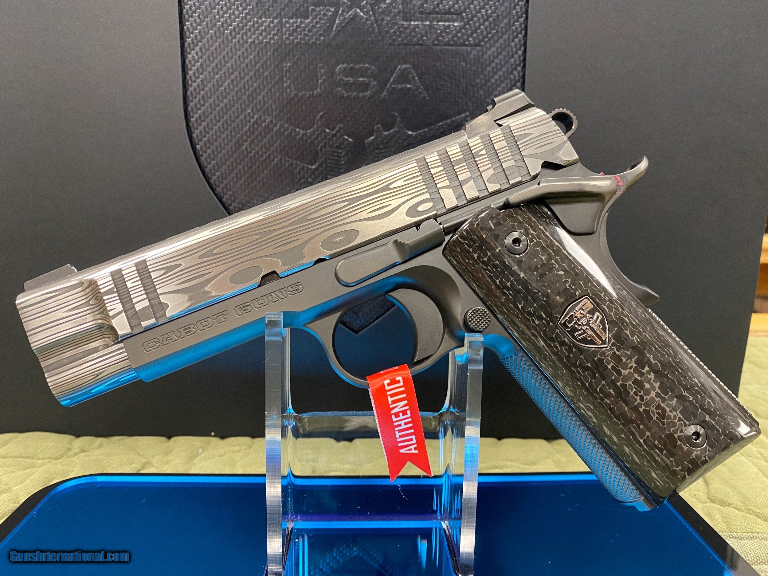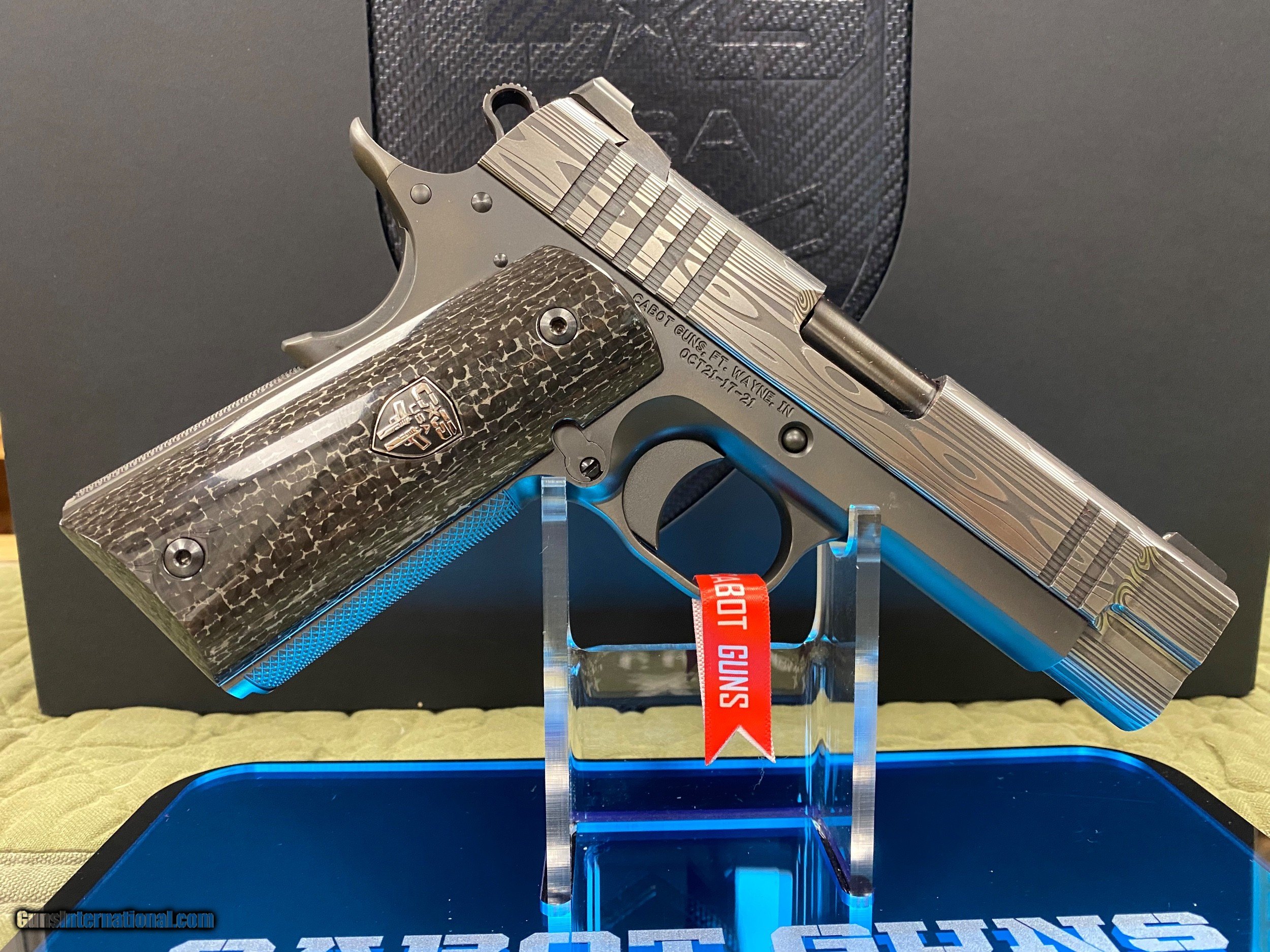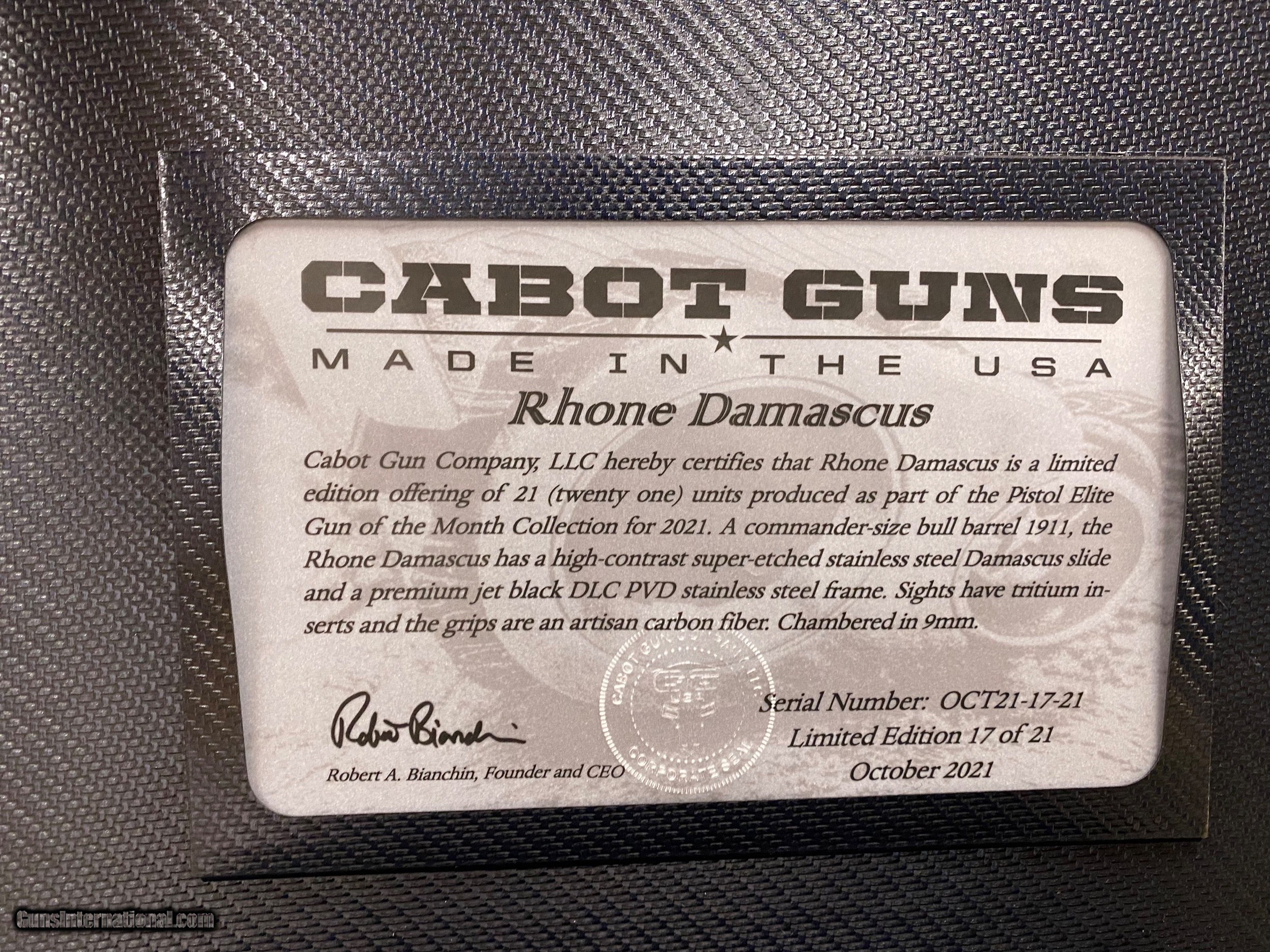 Description: Up for sale is a New Cabot Guns Rhone Damascus. This custom 1911 is chambered in 9mm. This is part of the 2021 Gun of the month club. This is #17 of 21. Who ever said money can’t buy happiness doesn’t know where to shop. Below is a description from Cabot’ssite. We stock a vast array of Caesar Guerini, Fabarm, Syren, Blaser, Merkel, Nighthawk Custom, Cabot Gun, and many more vintage guns too. It is impossible for me to list everything I will special order you anything your heart desires. Thanks for looking. WHY IRON COWBOY? Buying a fine gun is not shopping cart transaction. Buying from Iron Cowboy means buying a gun from me. It means buying from someone as passionate as you about fine guns. I want you to get the right gun both for you and your application, and my advice reflects what I feel is in your best interests. No clerks, no ‘other’ salesman – just me. Odds are we will have a discussion on my shooting experience with the gun you are after, and every transaction gets my personal best. Thank you, as always, for looking. GROWTH THROUGH SERVICE Everyone is a customer at some point. I’ve taken the good from my experiences and apply it to my transactions. I’ve taken the bad and sworn to never pass that same experience on to my customers. I strive to act the way I would respect someone else for acting. In this way, Iron Cowboy differentiates itself with growth through service and repeat business. It’s my commitment to you, my customer. Iron Cowboy Gun Shop, LLC Edward Kondraski III (570) 733-2042 A New Exclusive 1911 Delivered Each Month of 2021 Only 21 of Each Model Will be Produced For some collectors, owning one Custom Cabot 1911 can be the crown jewel of a collection. However, for those looking to assemble the ultimate collection, we have curated an entire series of limited edition pistols. Cabot is offering a collection of 12 limited edition 1911 pistols for 2021. One gun for each month of the year! Cabot pistols are crafted in-house from the finest materials and constructed to the highest tolerances in the industry. We have limited the production of each month’s offering to only 21 pistols so we can guarantee delivery dates, and each gun will have a custom serial number to ensure provenance. October - Rhone Damascus If basic human desire took on a physical form it would be Damascus steel. The metal of Kings and Nobles, Damascus steel is incredibly durable and unimaginably beautiful in any form. When painstakingly formed into a Cabot Rhone pistol the this unique pattern welded steel truly comes to life. The Rhone Damascus Limited Edition pistol has a Damascus Steel bull barrel slide and finished to a high contrast super-etch finish and a black DLC steel frame. Chambered in 9mm if defines the perfect form and function for a carry pistol. Caliber: 9mm SOLD |