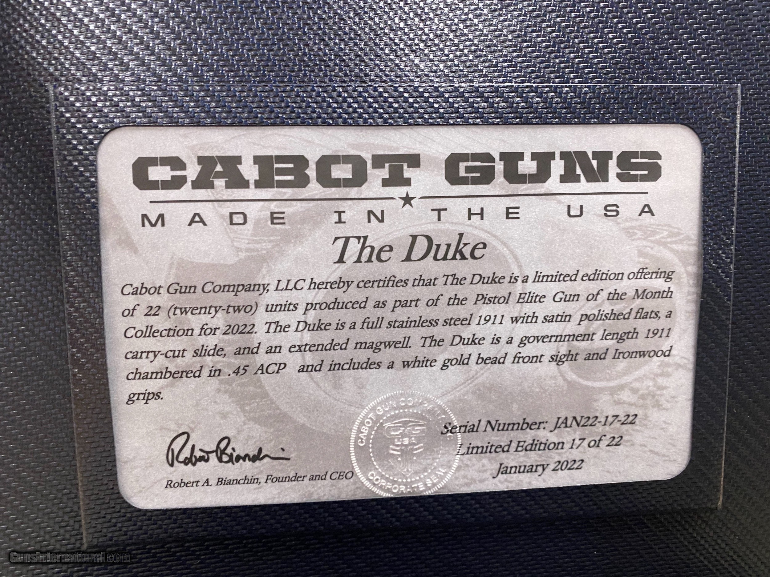 Description: Up for sale a Cabot Guns The Duke. This is the January 2022 offering in the Cabot GOTM Club. Only 22 pistols to be produced and most of them are already locked up in private collections. If you treat it like a lady, this is better than money in the bank. Below you will find a description from Cabot’ssite. WHY IRON COWBOY? Buying a fine gun is not shopping cart transaction. Buying from Iron Cowboy means buying a gun from me. It means buying from someone as passionate as you about fine guns. I want you to get the right gun both for you and your application, and my advice reflects what I feel is in your best interests. No clerks, no ‘other’ salesman – just me. Odds are we will have a discussion on my shooting experience with the gun you are after, and every transaction gets my personal best. Thank you, as always, for looking. GROWTH THROUGH SERVICE Everyone is a customer at some point. I’ve taken the good from my experiences and apply it to my transactions. I’ve taken the bad and sworn to never pass that same experience on to my customers. I strive to act the way I would respect someone else for acting. In this way, Iron Cowboy differentiates itself with growth through service and repeat business. It’s my commitment to you, my customer. Iron Cowboy Gun Shop, LLC Edward Kondraski III (570) 733-2042 For some collectors, owning one Custom Cabot 1911 can be the crown jewel of a collection. However, for those looking to assemble the ultimate collection, we have curated an entire series of limited edition pistols. Cabot is offering a collection of 12 limited edition cabot offerings for 2022. One for each month of the year! Cabot pistols are crafted in-house from the finest materials and constructed to the highest tolerances in the industry. We have limited the production of each month’s offering to only 22 items so we can guarantee delivery dates, and each piece will have a custom serial number to ensure provenance. The world has slogged through the adversity of the past two years but now is the time to ‘get back at it’ with some swagger in 2022 and nothing has more swagger than The Duke! The Duke “kicks the door in” on the 2022 Gun of the Month Limited Edition as a full government-length traditional Cabot 1911 that develops artful contrast in textures and sheen of the full stainless steel construction. Chambered in .45ACP, a carry-cut muzzle and extended magwell, The Duke will make a bold impression from its trusted position in your holster through your draw, fire and mag change. The Duke’s swagger is topped off with warm grained ironwood grips, distinctly Cabot Tristar trigger and a white gold bead front sight. The world will be watching, so be bold with The Duke! SOLD |