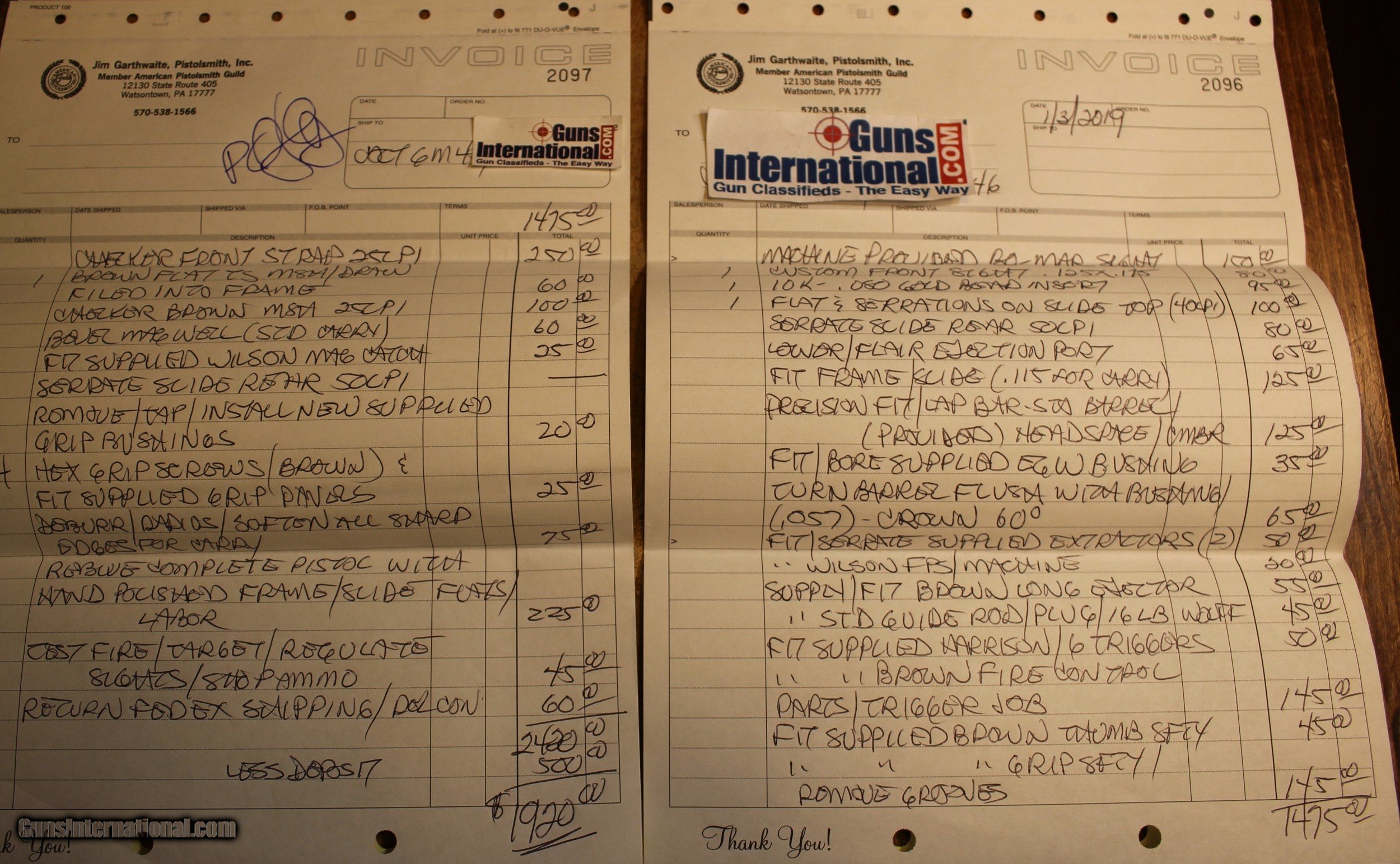 Description: Number Two from our AZ trip. Got 8 more to go. This is a custom 1911 45 acp full size built by Jim Garthwaite. The build sheets are shown. Jim Garthwaite won Pistolsmtih of the year 2004 and was a Guild Member. Jim passed in June 30, 2020 and his work was specialized in modifications to the Browning designed 1911 and P-35 pistols as well as full builds to same. This is one example of his work. Excuse the Guns International as pictures have copied and used by scammers The gun is exactly as you see it . Please check our other listings for the items. NOTE: Look close at the pictures posted as we did the best we can As is means AS IS. There is no refund You are welcome to check out our webpage or facebook page at P&T Partners Shipping is NOT FREE just included UPS Next Day Air and full insurance to your FFL. Price is for Certified Funds meaning Certified Check or USPS Money Orders Credit or Plastic in any form, shape or manner add 3.5% NOTE: Credit by PHONE only WE DO ACCEPT PERSONAL OR BUSINESS CHECKS, BUT THERE IS A GRACE PERIOD OF 10 BUSINESSS DAYS ON THEM FOM THE DATE OF DEPOSIT. WE DO OFFER A LAYAWAY PLAN. YOU CAN LAYAWAY up to 90 DAYS . WE ALSO REQUIRE A 25% DOWN PAYMENT ON TOTAL OF LAYAWAY SALE in 7 Business days. LAYAWAYS ARE NON- REFUNDABLE. There are NO, repeat NO Credit Cards allowed on Lay-a-way. Certified funds ONLY. . I post on many of the firearms forums as PT-Partners. This is an FFL to FFL Transaction, as PT-Partners is a retail/FFL Dealer. For those that are local, there is no Face To Face. On Line means On Line. Again if you are Local there is NO local pick up. We ship only Also, Texas Residents know you are responsible for the Texas State Sales Tax. General Information: FFL (Federal Firearms License) is required. Be prepared to obtain a copy of your local FFL holders license. For all in states where the local laws restrict this type of firearms, DO NOT BUY. If your local laws restrict the magazine capacity, again do not buy. I have no idea if this is a California Qualified firearm, but I do ship to CA if you check other listings and something fits CA DOJ. If you are CA and you can PROVE, and your RECEIVING FFL contacts me, I will ship this to CA SOLD Handgun Caliber: .45 ACP (.45 Auto) |
