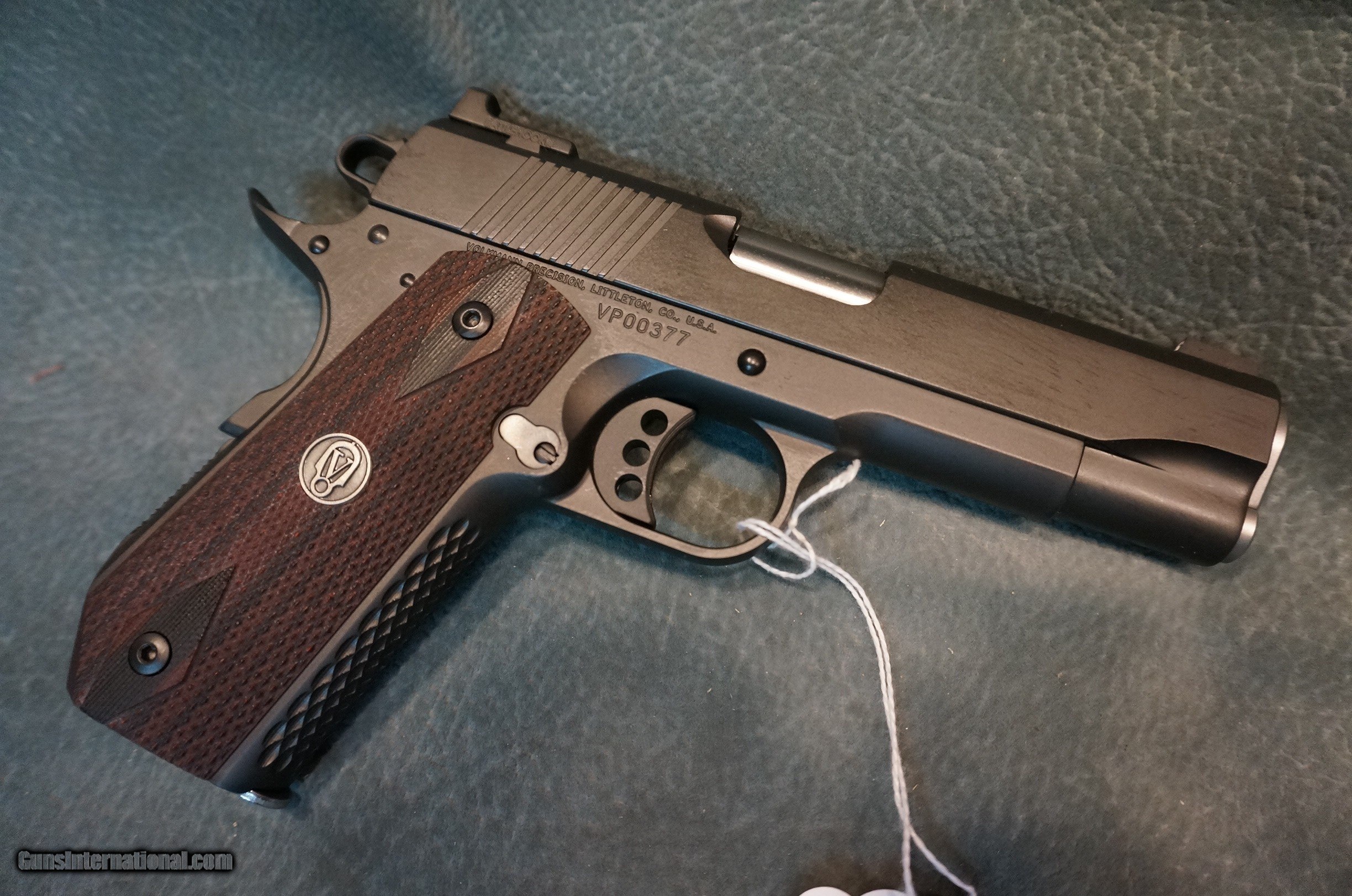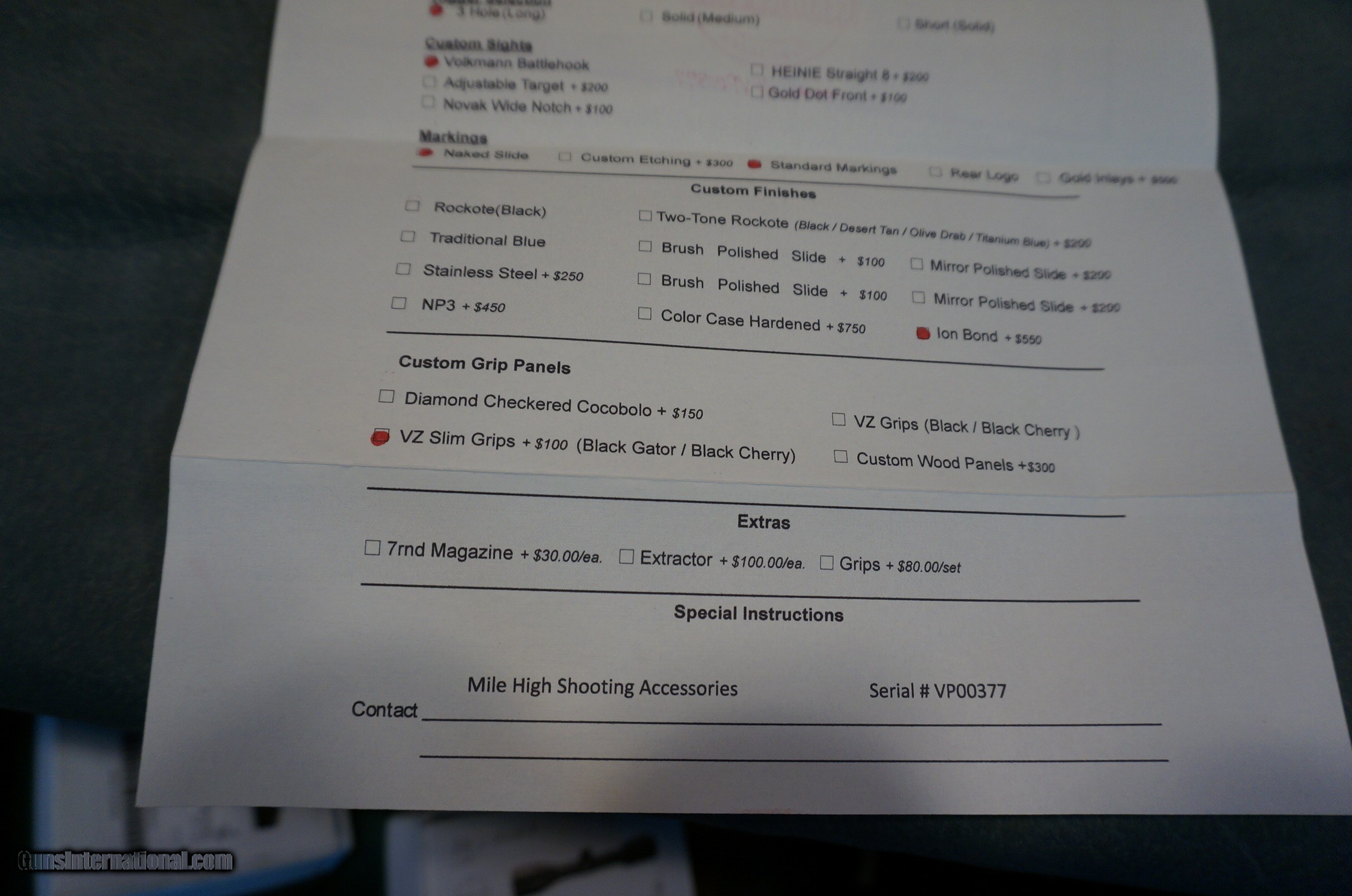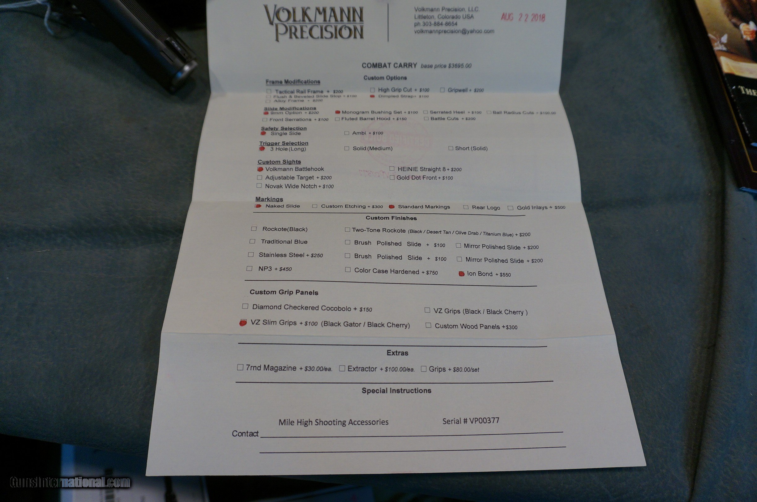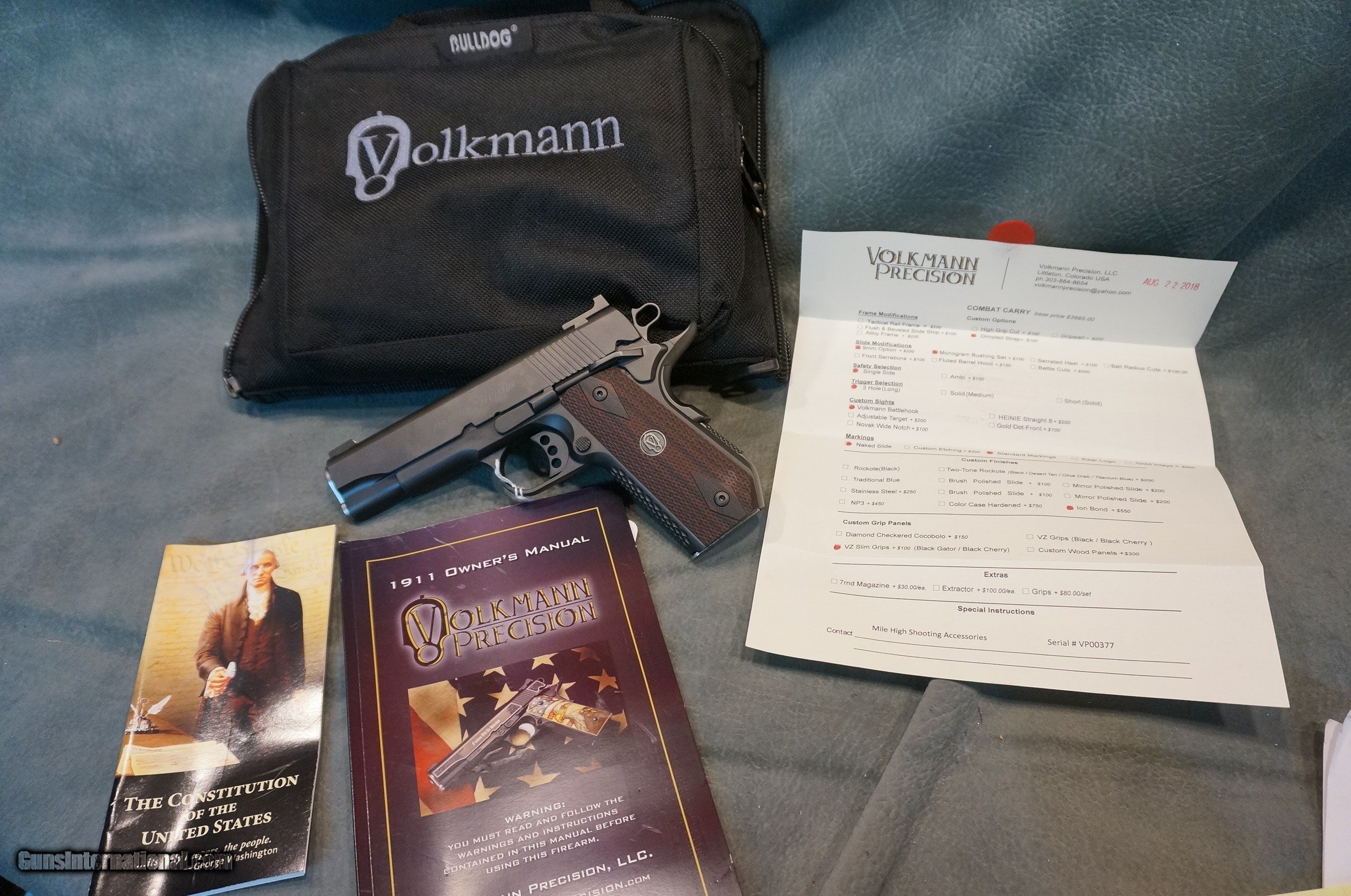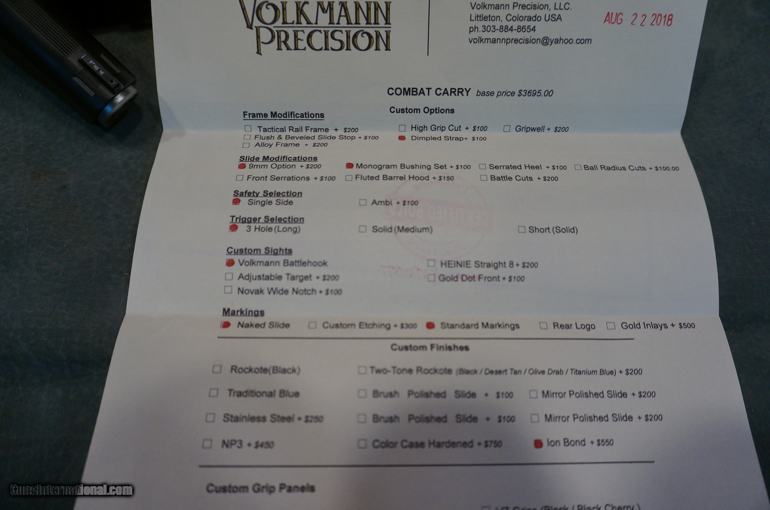 Description: Volkmann Precision Combat Carry 9mm 4 1/4" barrel,mono grade bushing set,dimpled strap,3 hole trigger,Volkmann Battlehook sights,Ion bond custom finish,VZ Slimgrips,bobtail frame,5 magazines,new in the pouch with papers,new cost was $4745. GUN COLLECTIONS WANTED FOR CASH! We buy, sell, consign and trade new and used firearms.We will pay finders fees and travel for large collections. This is our 45th year in business. We offer 90 day layaways with 20% down. No return on layaways. Firearms will need to be transferred through a FFL dealer. Prices reflect a cash discount. There will be 3% added to credit card sales. We trade for gold and silver. THANK YOU! SOLD |