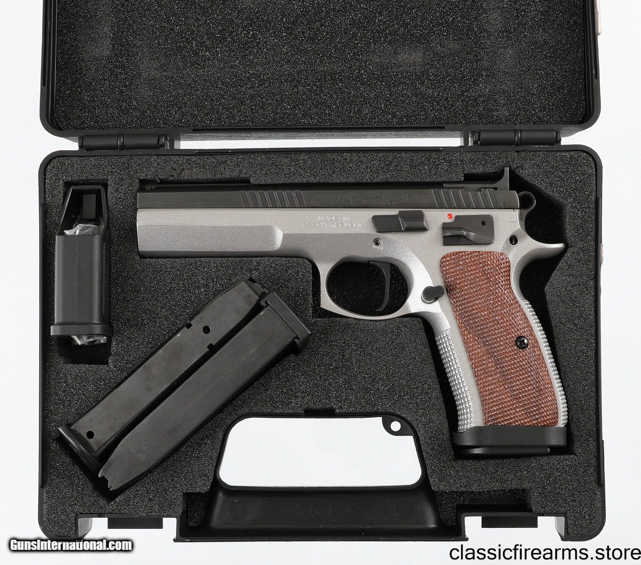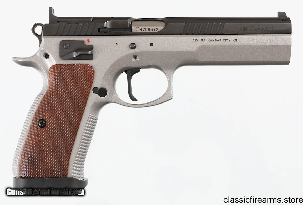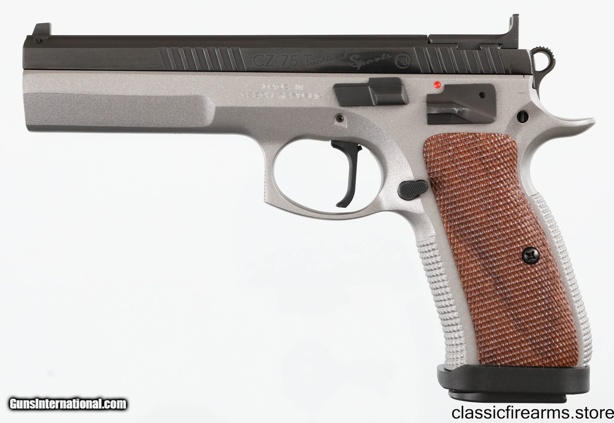 Description: Guns Listing ID: 663817 MAKE - CZ MODEL - 75 TACTICAL SPORTS FINISH - STAINLESS / BLACK BARREL - 5\" CALIBER - 9 MM CAPACITY - 20 GRIPS - PLASTIC CONDITION - EXCELLENT FEATURES - COMES WITH BOX, PAPERS, 2 EXTRA MAGS, SPEEDLOADER, & PARTS SOLD Manufacturer: CZ-USA Model: 75 TACTICAL SPORTS W/ BOX, 3 MAGS & PAPERS Caliber Info: 9 MM (9X19 PARA) Condition: Used - Non-Certified Barrels: 5 BARREL Finish: SILVER AND BLACK |