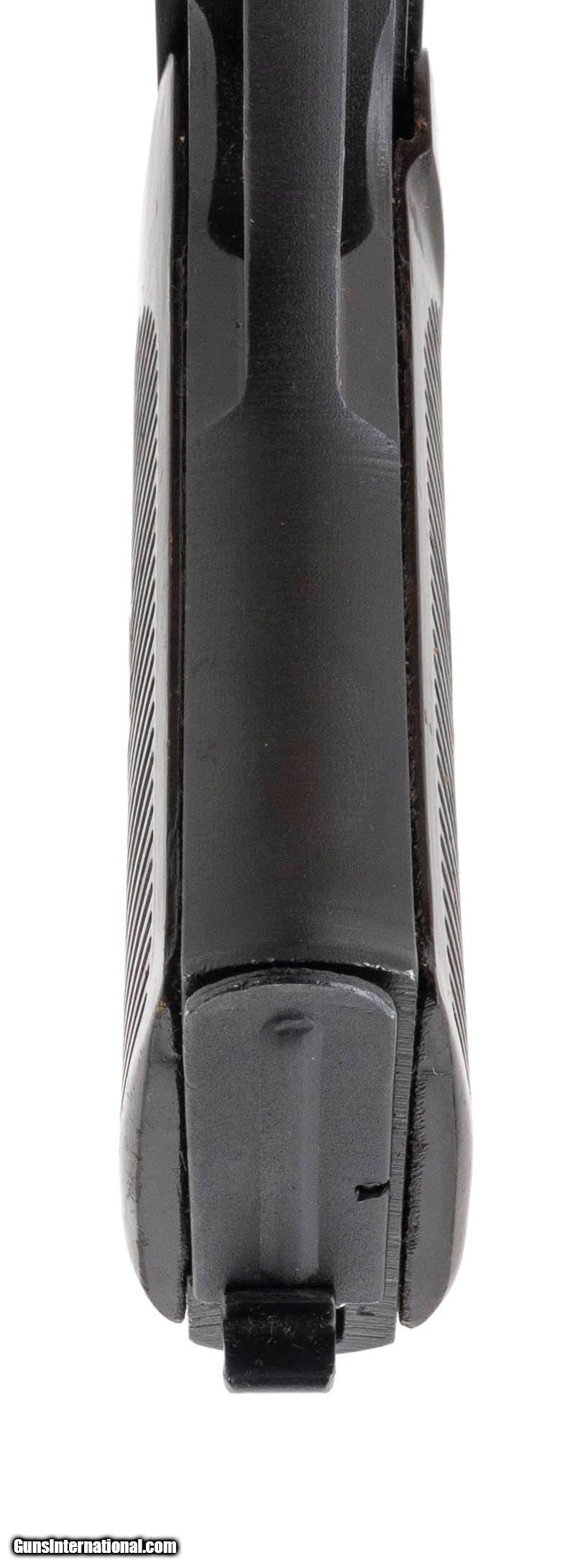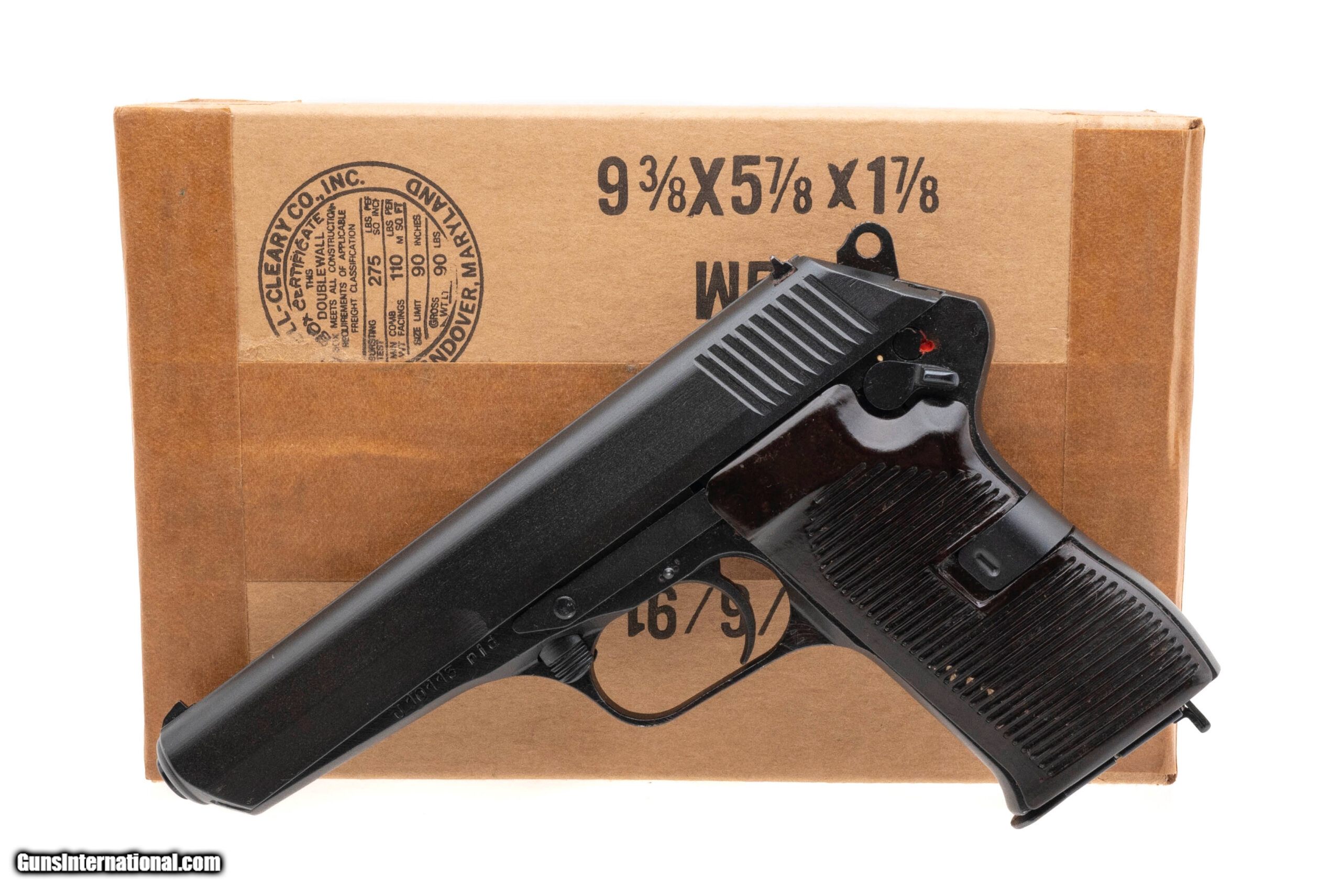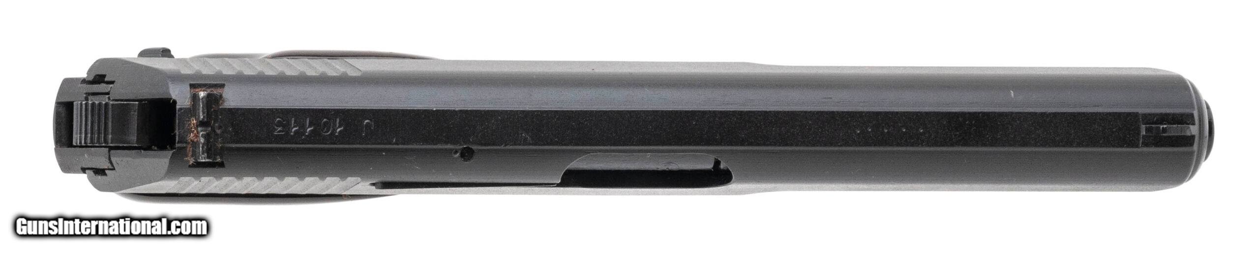 Description: "Serial No. J10113, made in 1953, 7.62x25, 4 ½" round barrel. Bore is good with light frosting noted in the grooves, rifling remains strong. 98-99% finish remains, serial numbers are matching. Grips are very good with light storage wear visible on the surface; no cracks noted. Action is smooth and functions correctly. Comes with box. Consignment SOLD Curio/Relic: Yes |