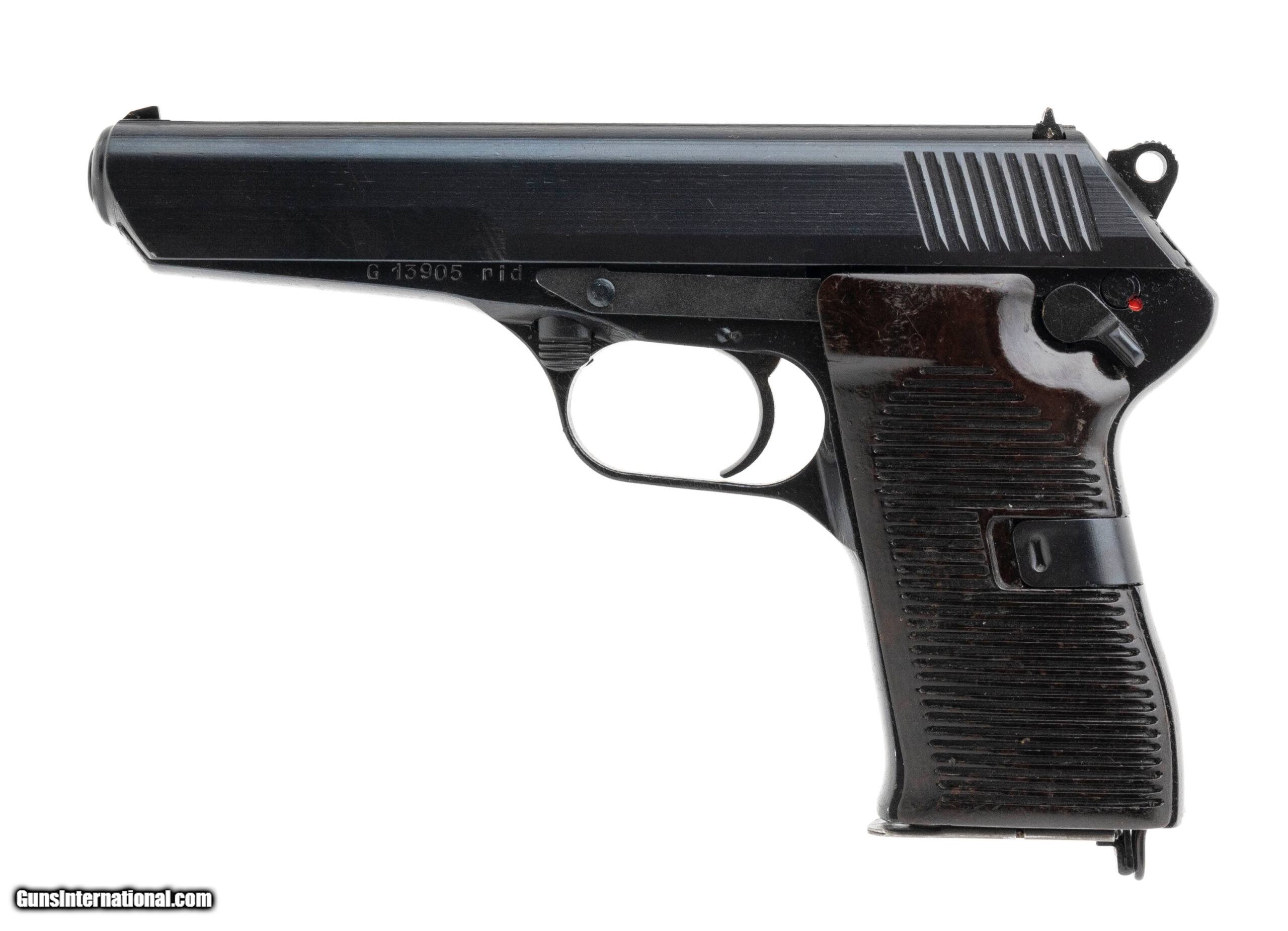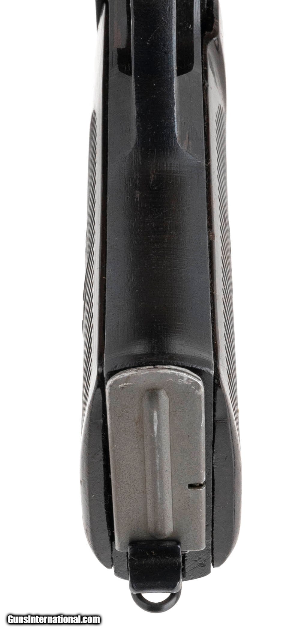 Description: "Serial No. G13905, made in 1953, 7.62x25, 4 ½" round barrel. Bore is bright with light frosting noted in the grooves, rifling still remains strong. Marked serial numbers are matching, magazines are unmarked 98% finish remains and pistol is in overall excellent condition. Comes with box and spare magazine. Consignment SOLD |