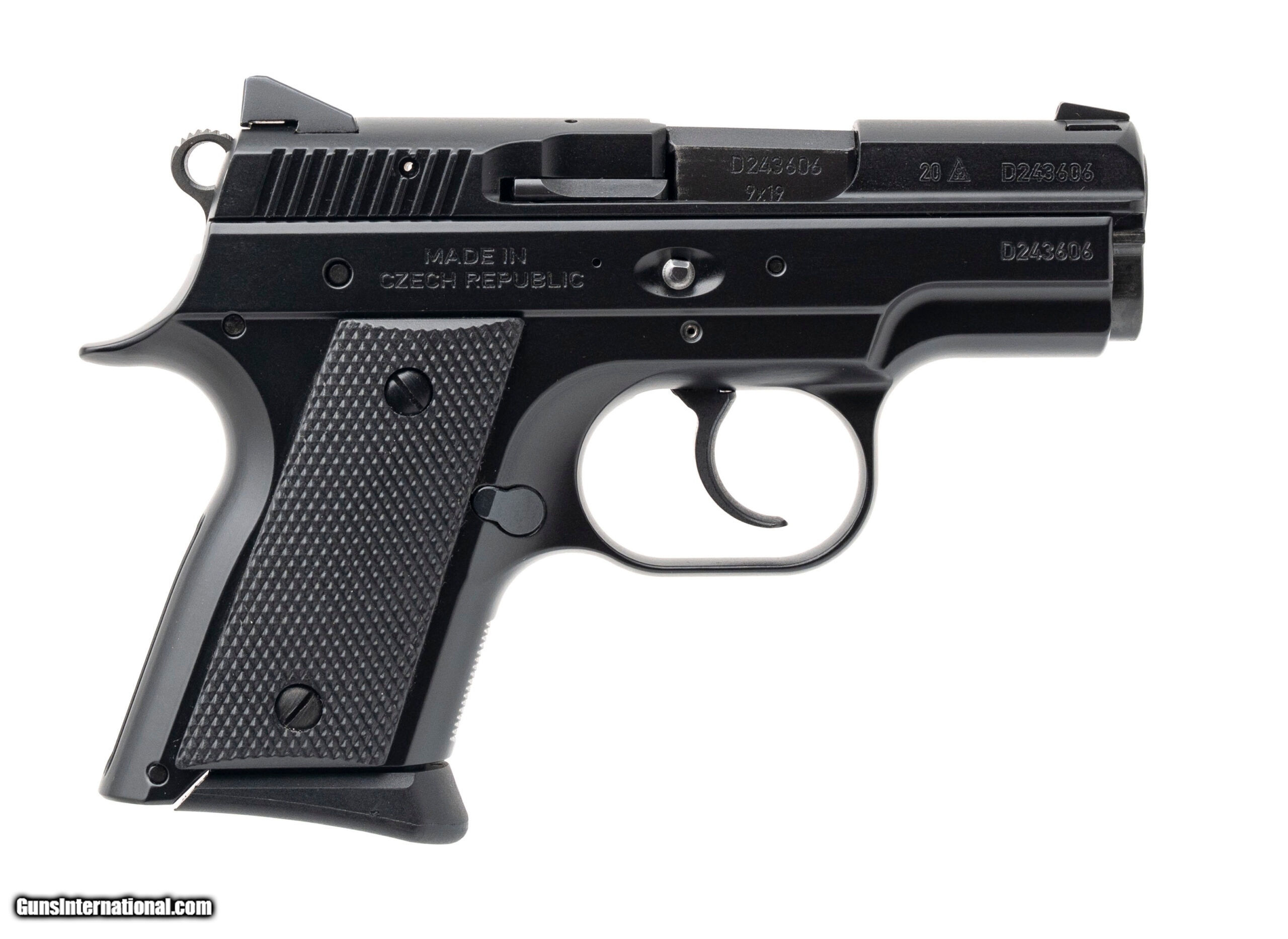 Description: "SN: D243606. Modern production, 9mm with a 3"" barrel. Bore is bright with strong rifling. Czech made alloy frame carry pistol with a safety. Overall condition is excellent. Comes with case and an extra magazine. SOLD |