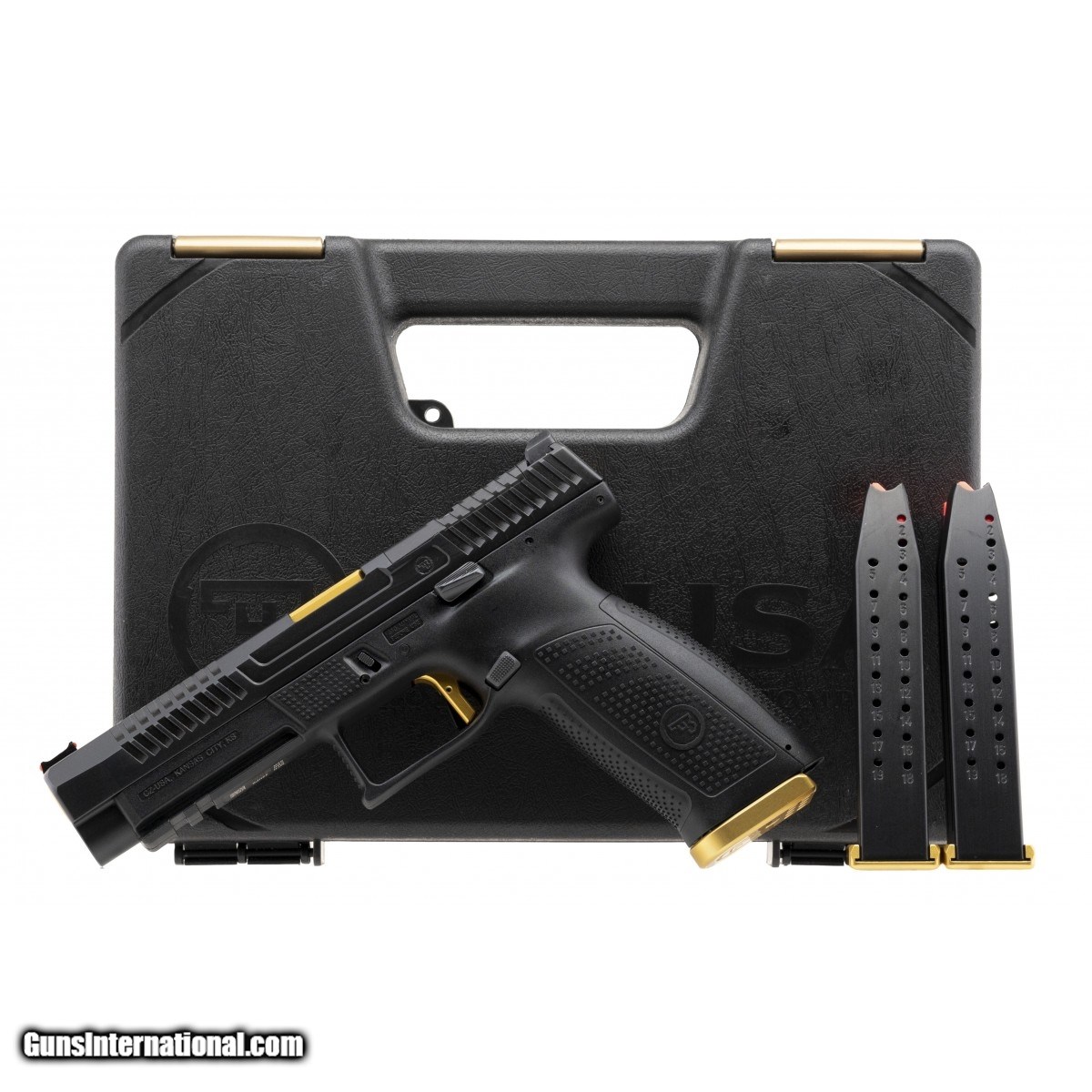 Long slide model with 5"" competition barrel, optics ready, and gold custom hardware. Comes with 3 19 round magazines. NEW. UPC:806703951805. REBATE ELIGIBLE:Rebate Information on CZ .