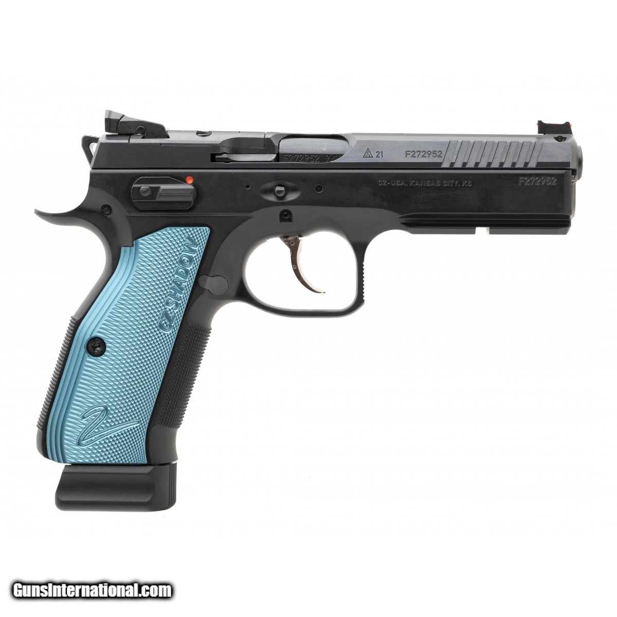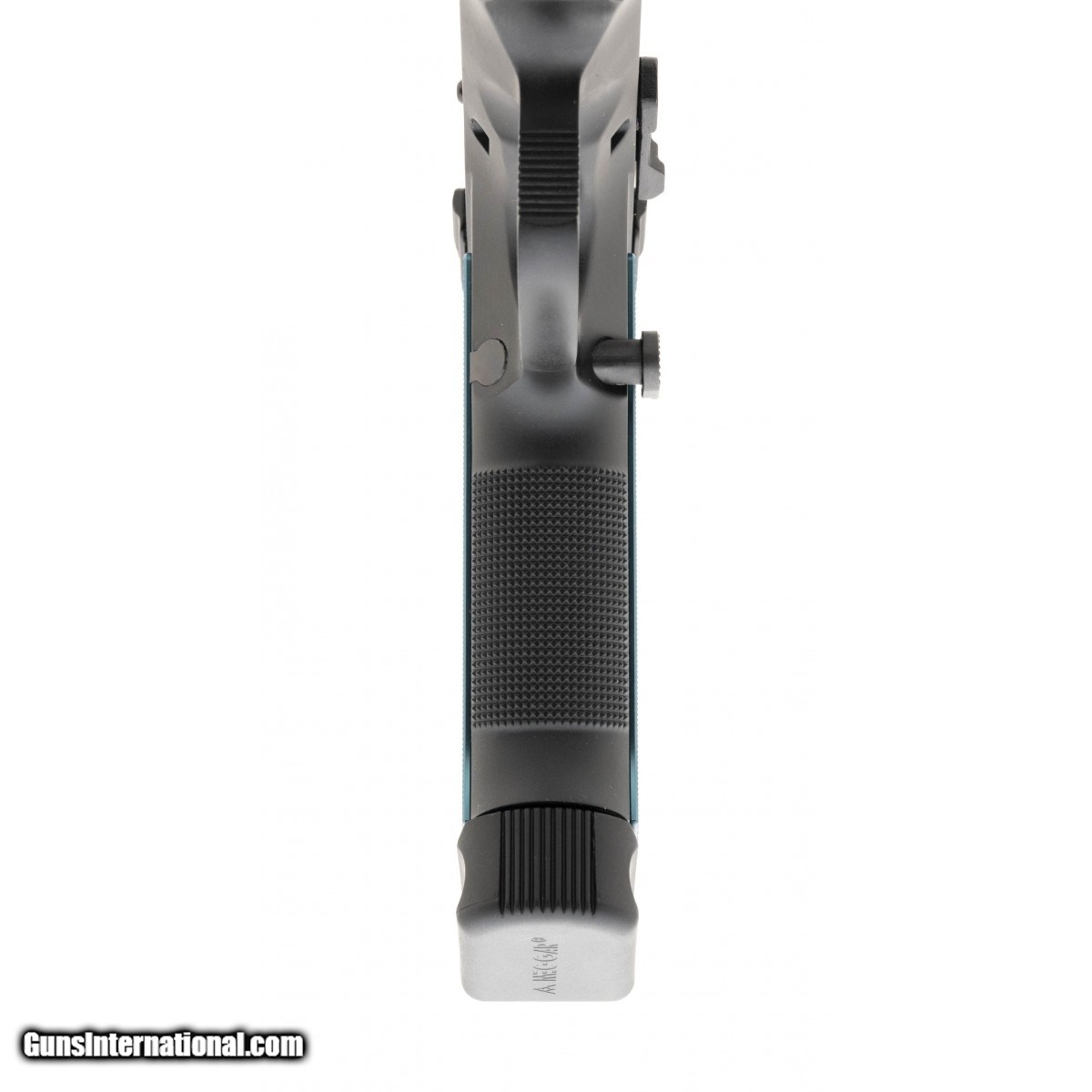 Competition ready steel frame 4.89"" barrel, optic ready, blue aluminum grips, fiber optic front, double/single action, and comes with three 19 round magazines. NEW. UPC: 806703912516