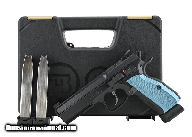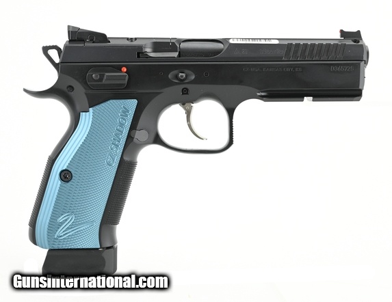 Description: " CZ Shadow 2 9mm caliber pistol. Optics ready model with aluminum blue grips and fiber optic sights. Comes with box and 3 magazines. New.