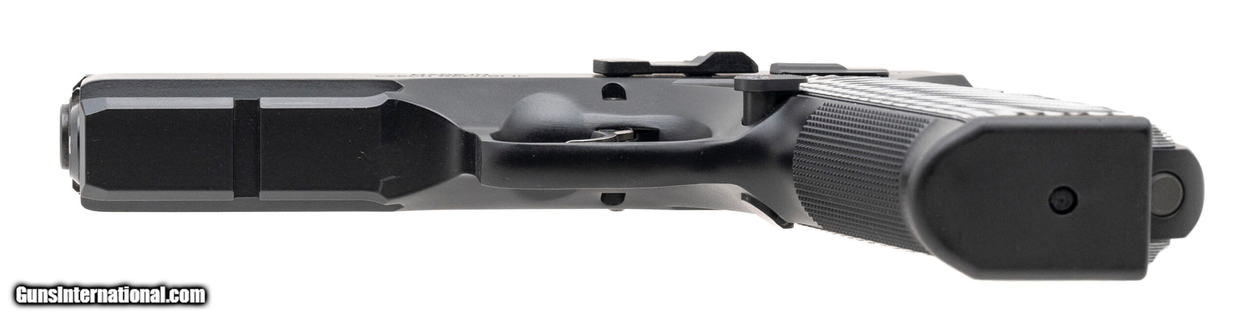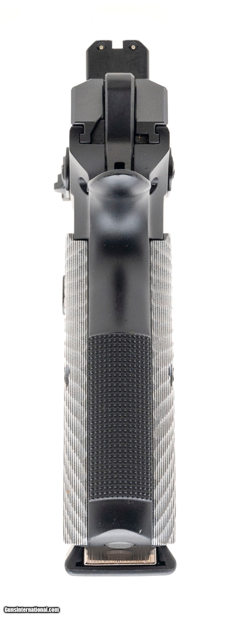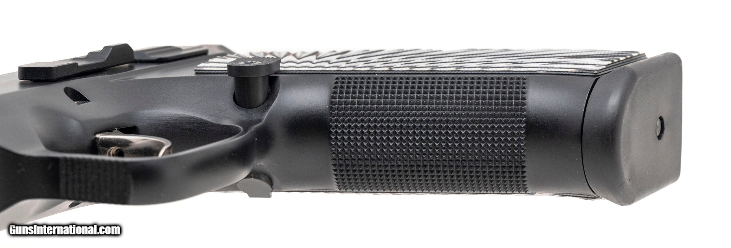 Description: "SN: D387304. Modern production, 9mm with a 4.89"" barrel. Bore is bright with excellent rifling. Full size steel frame competition pistol with a Cajun Gun Works trigger, optic ready slide, and suppressor height night sights. Nitride finish shows minor wear but is in very good condition. Plastic grips are excellent. Overall condition is excellent. Comes with case, original aluminum grips, Trijicon RMR plate, and extra magazine. SOLD |