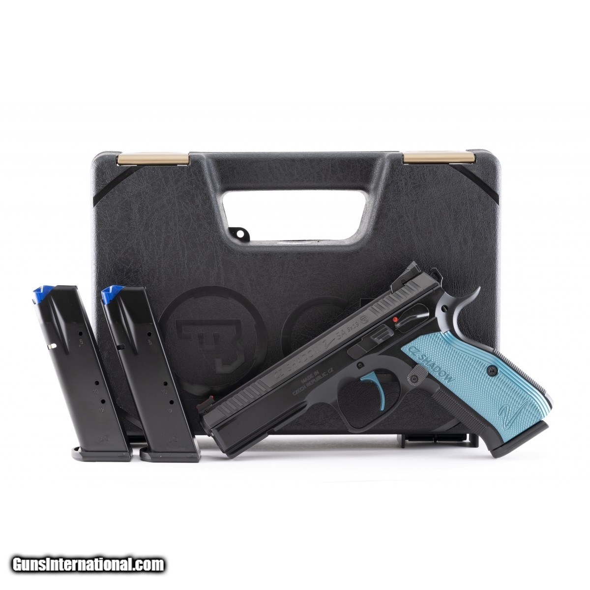 Single action trigger model with blue aluminum grips and fiber optic sights. With box and 2 spare magazines. Excellent condition.