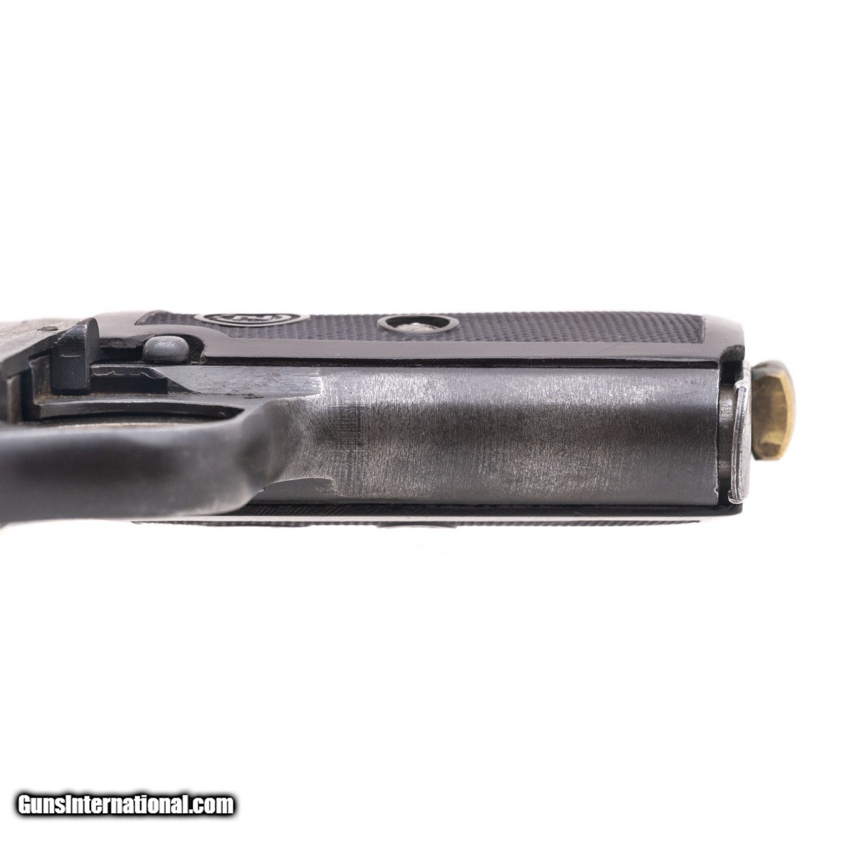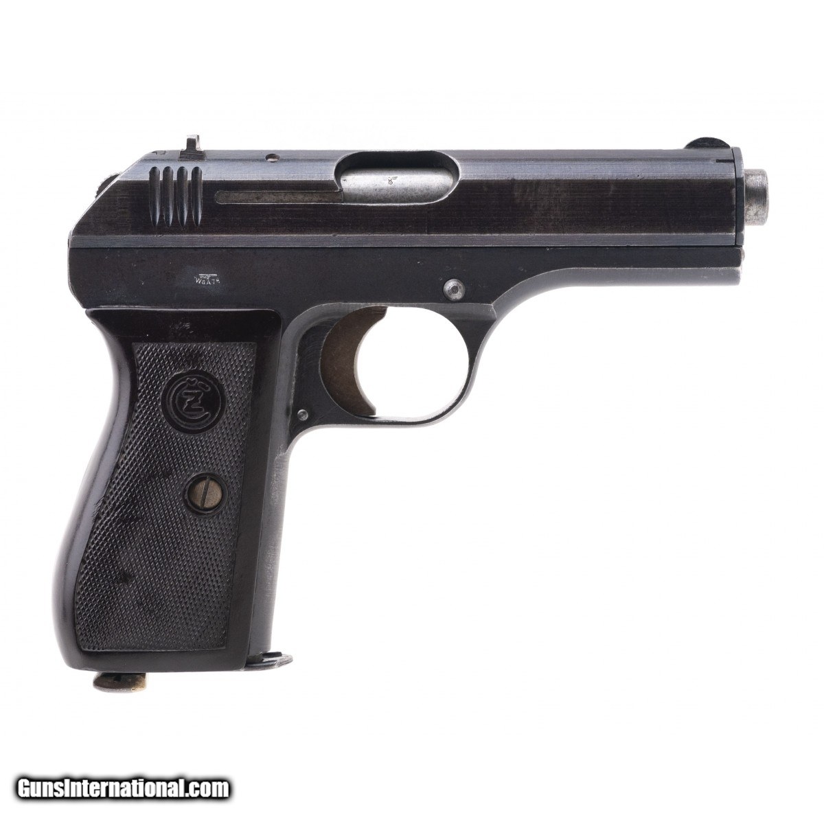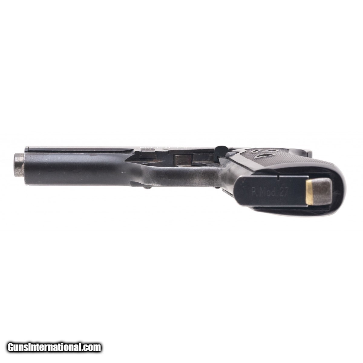 Description: " Serial No. 215841, circa 1943, 7.65mm, 4.9"" round waffenamt marked barrel. ""Top slide only"" model where the only serial number is stamped on the top of the slide. Bore is bright with strong rifling visible. Approximately 90% original finish remains, right side of frame is stamped with ""Eagle/WaA76"". One piece brown checkered grips are good with a loss noted at the top edge. Magazine is marked ""P. MOD.27"" SOLD |
