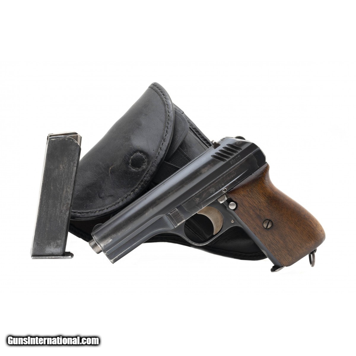 The 7,65mm (32 ACP) CZ 27 was manufactured from 1927 to 1951. About 450.000 were manufactured for the German military during WWII. This pistol is a pre-WWII CZ 27 that was used by the Czech military prior to WWII. It is slightly diffferent from the WWII German issued pistols in that it is rounded rather than flat on the later guns. The 3.5"" barrel has an excellent bore with bright, strong rifling. The gun retains approx 92% blue overall with light wear areas. The top of the slide is marked CESKA ZBROJOVKA v PRAZE 61427 followed by the Czech lion inspection mark. The left side of the frame has CZ with a vertical arrow intersecting it followed by 61427. This is repeated on the left rear of the slide.The right side of the frame above the grip has a J Czech lion 27. The front grip strap is unit marked 52 D 404. The smooth wrap-around wood grips are excellent with no chips or cracks. The magazine base has the CZ with the arrow and is numbered to another gun. The lanyard loop is present. The action functions correctly. The black leather holster, with a spare CZ 27 magazine, is excellent with tight stitching. It is marked on the interior flap with a boxed A over SN7, the Czech lion followed by 1936 followed by 6412, and with, below that, PUV2 A. This is a great pre-WWII Czech military CZ27 pistol rig.