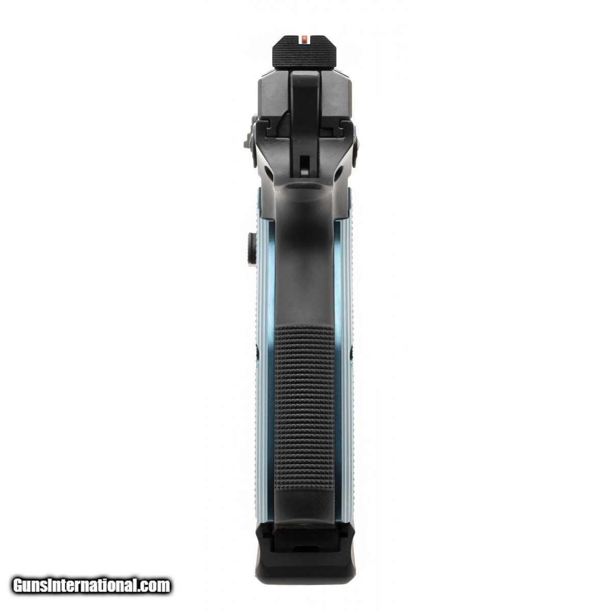 Competition ready steel frame 4.89"" barrel, optic ready, blue aluminum grips, fiber optic front, double/single action, and comes with three 19 round magazines. NEW. UPC: 806703912516