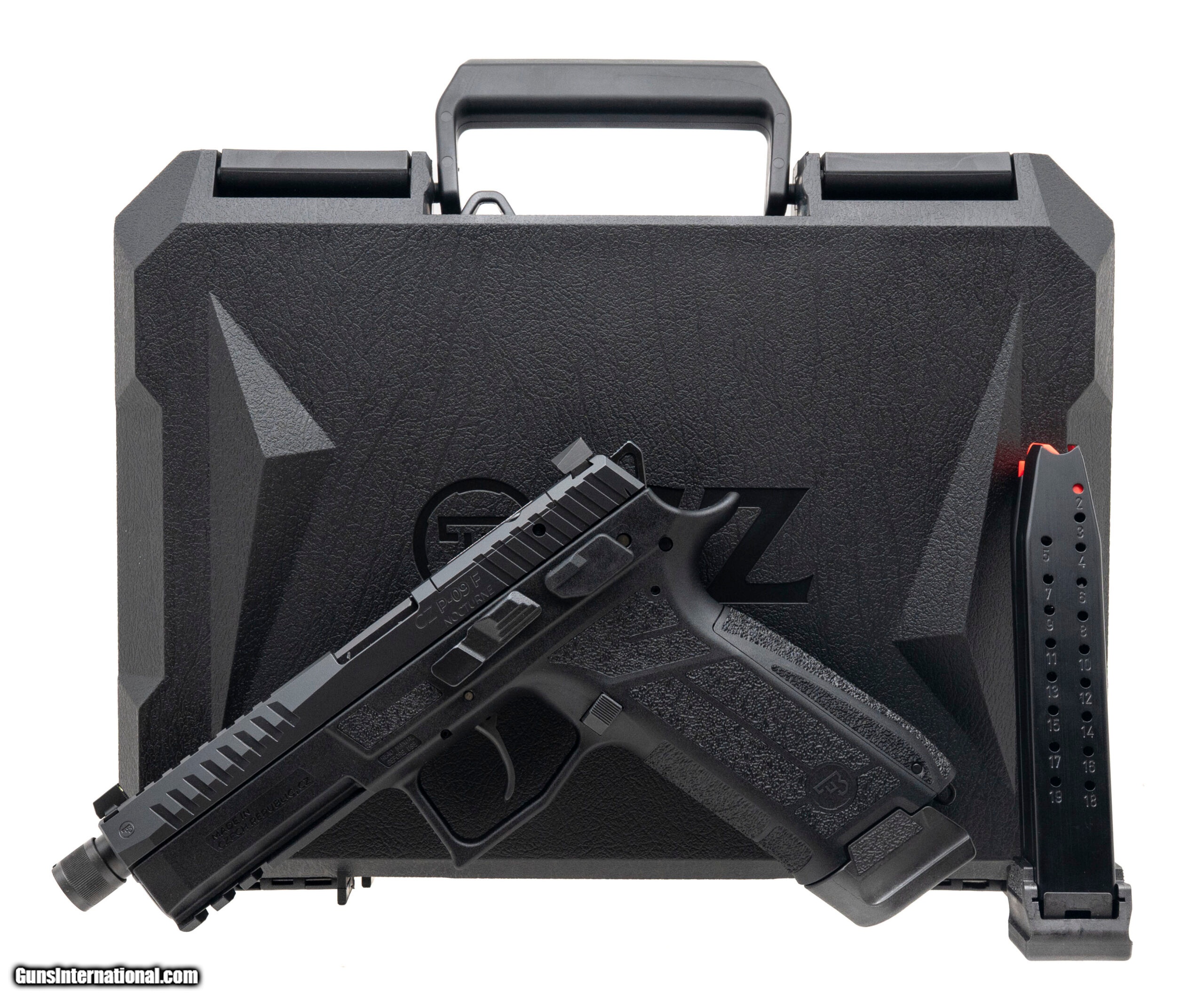 Description: "CZ P-09 F Nocturne 9mm with an 5.3"" Threaded Barrel. Semi-Auto, Full Size Polymer Frame Pistol with an Optic Ready Slide. Luminescent Suppressor Height Three Dot Night Sights, 21rd Capacity. NEW. UPC: 806703916712 (STOCK PHOTO) SOLD |