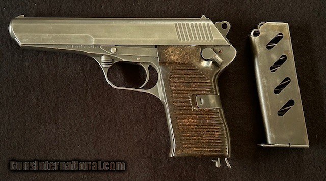Description: Czech CZ52 VZ52 7.62x25 Tokarev MFG 1953 Second Year of Production W/ Holster, also has 1 box of ammo that will ship seperately (included in the price). The pistol has all serial numbers matching and has sharp reflective rifling. Has holster and cleaning rod but only one magazine The CZ 52 is a semi-automatic pistol designed by two brothers, Jan and Jaroslav Kratochvíl, in the early 1950s for the Czechoslovak military. Around 200,000 vz. 52s were made by Ceská Zbrojovka in Strakonice from 1952 to 1954. Before standardizing on the 7.62×25mm vz. 52, the Czechoslovak military used several domestic and foreign pistol models in three different calibers. After 30 years of military service, the vz. 52 was eventually replaced by the 9×18mm Makarov caliber vz. 82 Handgun Caliber: 7.62x25mm Tokarev Manufacturer: CZ Brno Model: VZ 52 Pistol Serial Number: G14087 Barrel Length: 4.5 Price: $395.00 Shipping: $30.00 Pay with ![]() Contact Seller |