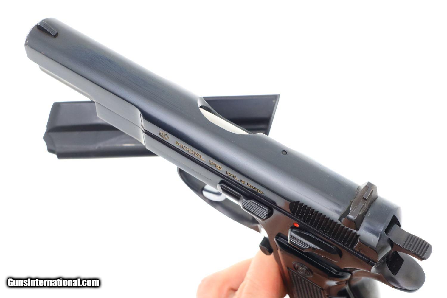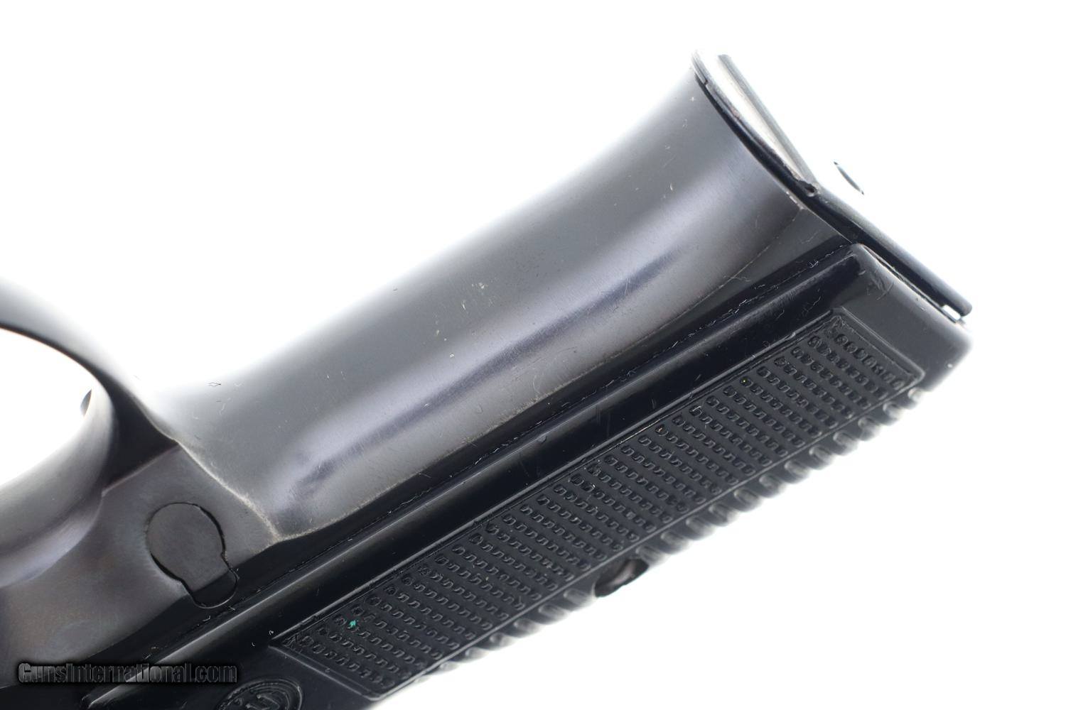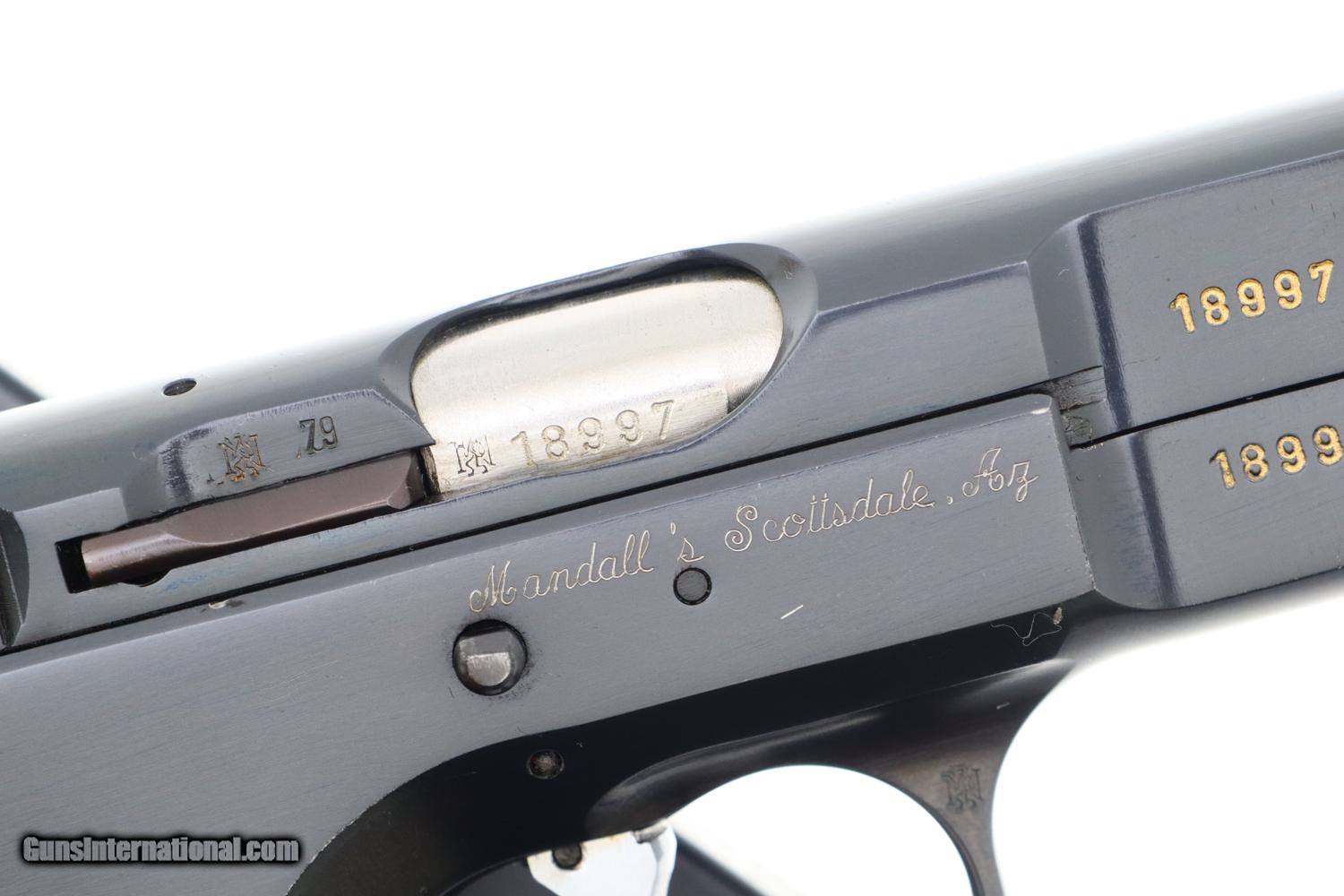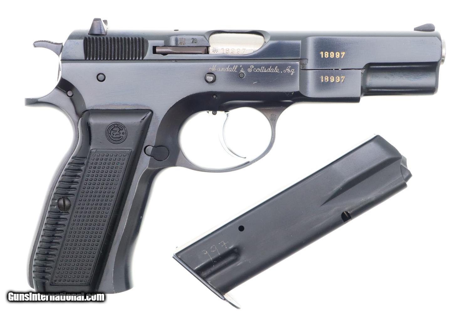 Description: Synopsis: Beautiful, Early CZ 75 Pistol, Short Rail, High Polish Description: This is the early, classic CZ 75 pistol, 9mmP, SA/DA, that set the stage for so many subsequent variations and copies. Fixed serrated ramp front sight and drift adjustable rear sight. Left side of slide marked with model and caliber. Location in Czechoslovakia on left side of frame. Matching serial number on slide, barrel, and frame, the slide dated 79. This example having been imported by Mandall's, Scottsdale, AZ. Factory plastic grips, each panel with the CZ logo over a molded checkered and serrated field. High capacity staggered magazine, the left side drilled with two unmarked indicator holes, the right side marked with a matching “997”, button-retained floorplate like the FN HP. No box or literature. Condition: Near EXC with negligible wear on slide and either side of frame, thinning of front and back strap as imaged. Comparable condition grips and magazine. Near mirror bore. Perfect manual mechanics. The classic CZ 75 pistol that was only made for a few years, the forerunner of numerous progeny. ~~Insured shipping fee of $65; most packages shipped using FedEx 2nd Day.~~ SOLD Manufacturer: CZ Serial Number: 18997 Caliber Info: 9mmP |