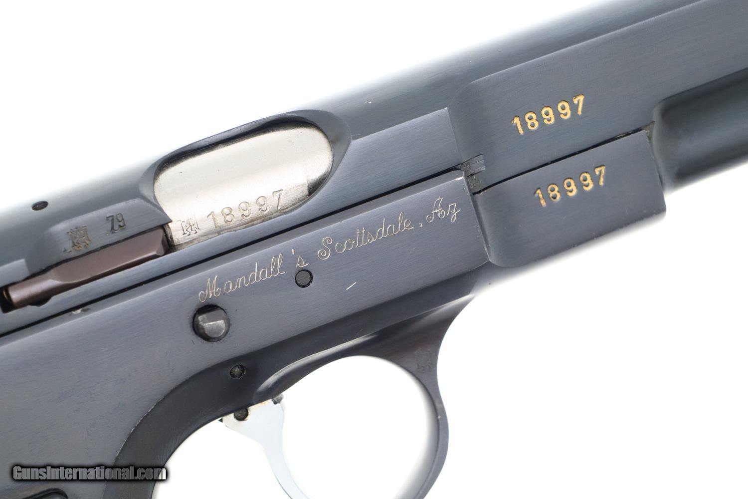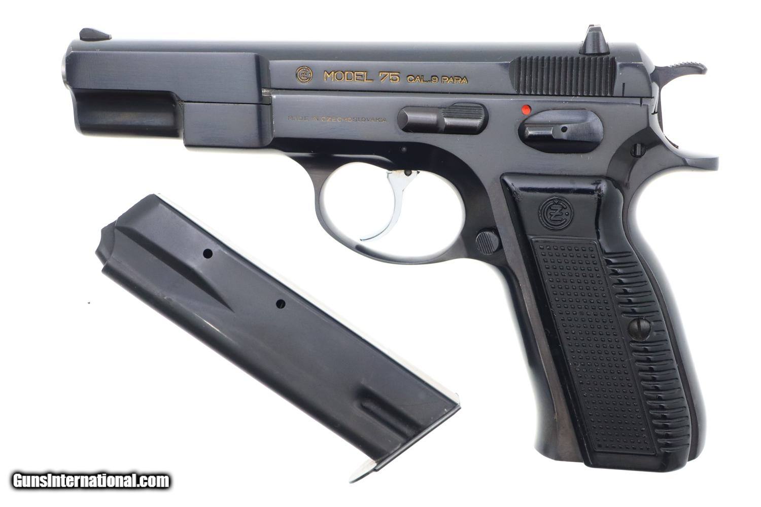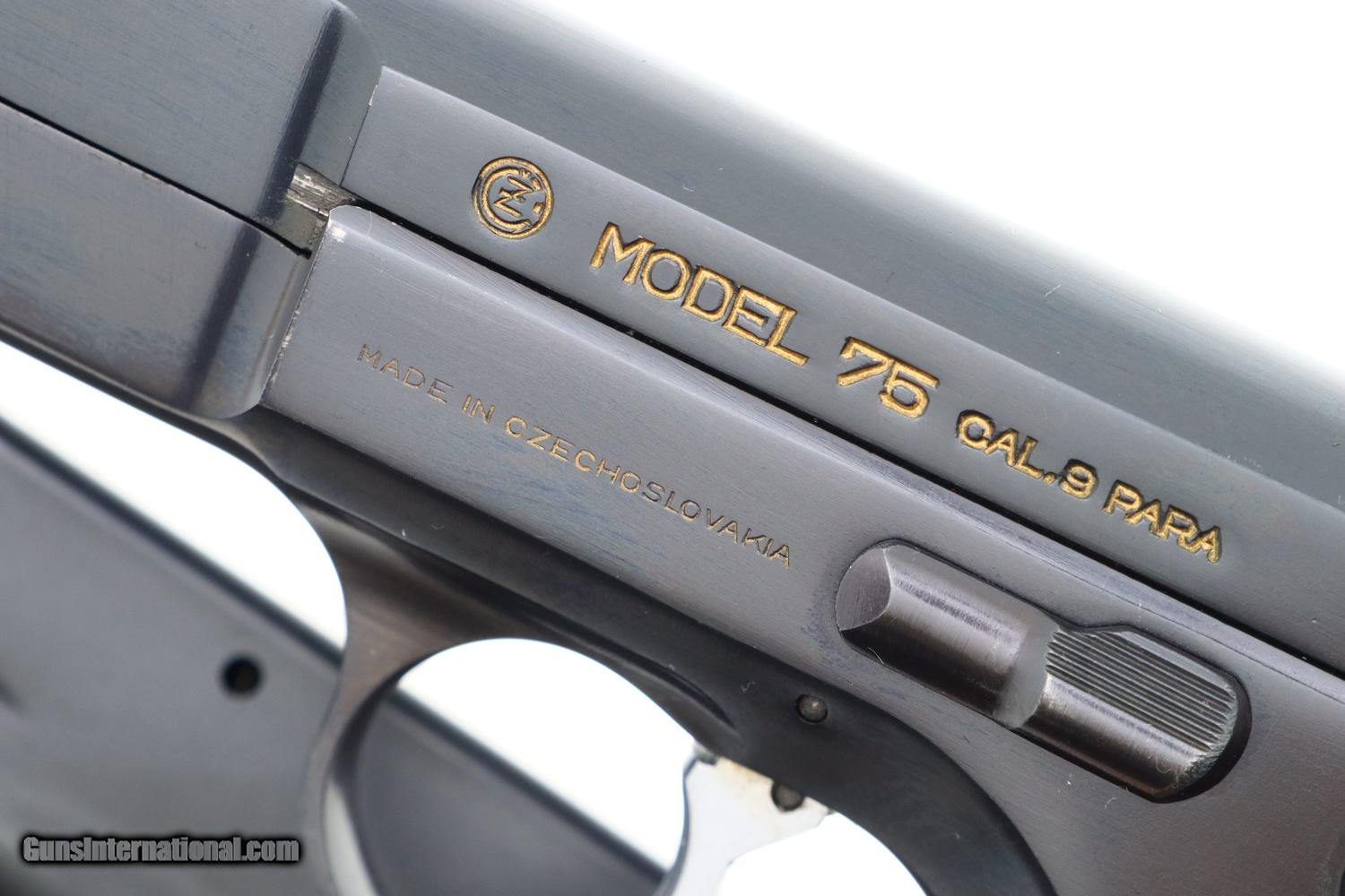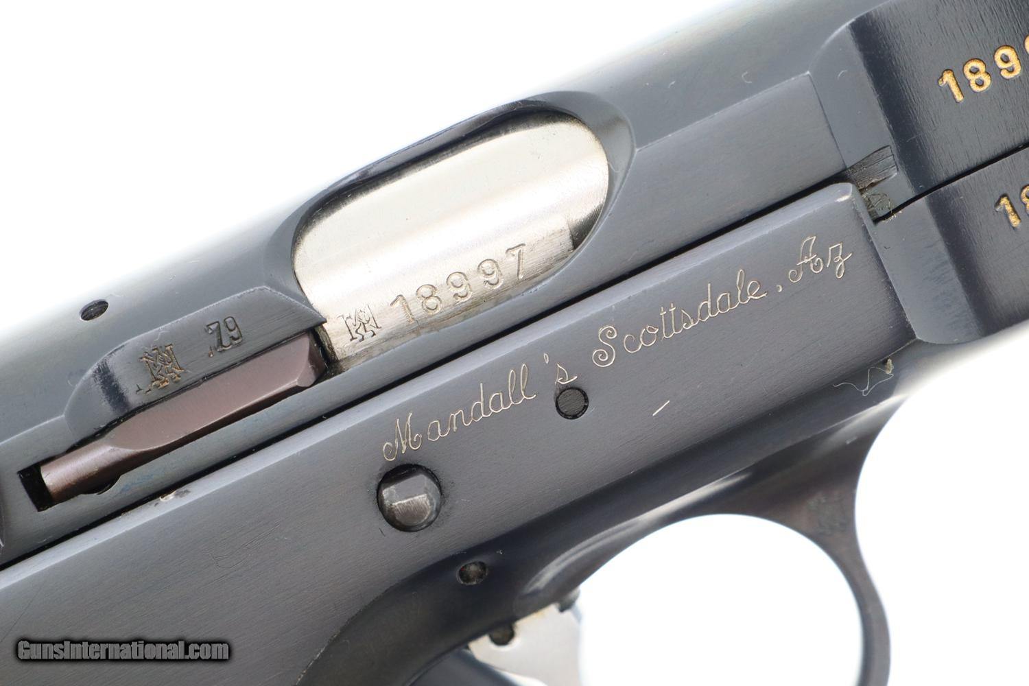 Description: Synopsis: Beautiful, Early CZ 75 Pistol, Short Rail, High Polish Description: This is the early, classic CZ 75 pistol, 9mmP, SA/DA, that set the stage for so many subsequent variations and copies. Fixed serrated ramp front sight and drift adjustable rear sight. Left side of slide marked with model and caliber. Location in Czechoslovakia on left side of frame. Matching serial number on slide, barrel, and frame, the slide dated 79. This example having been imported by Mandall's, Scottsdale, AZ. Factory plastic grips, each panel with the CZ logo over a molded checkered and serrated field. High capacity staggered magazine, the left side drilled with two unmarked indicator holes, the right side marked with a matching “997”, button-retained floorplate like the FN HP. No box or literature. Condition: Near EXC with negligible wear on slide and either side of frame, thinning of front and back strap as imaged. Comparable condition grips and magazine. Near mirror bore. Perfect manual mechanics. The classic CZ 75 pistol that was only made for a few years, the forerunner of numerous progeny. ~~Insured shipping fee of $65; most packages shipped using FedEx 2nd Day.~~ SOLD Manufacturer: CZ Serial Number: 18997 Caliber Info: 9mmP |